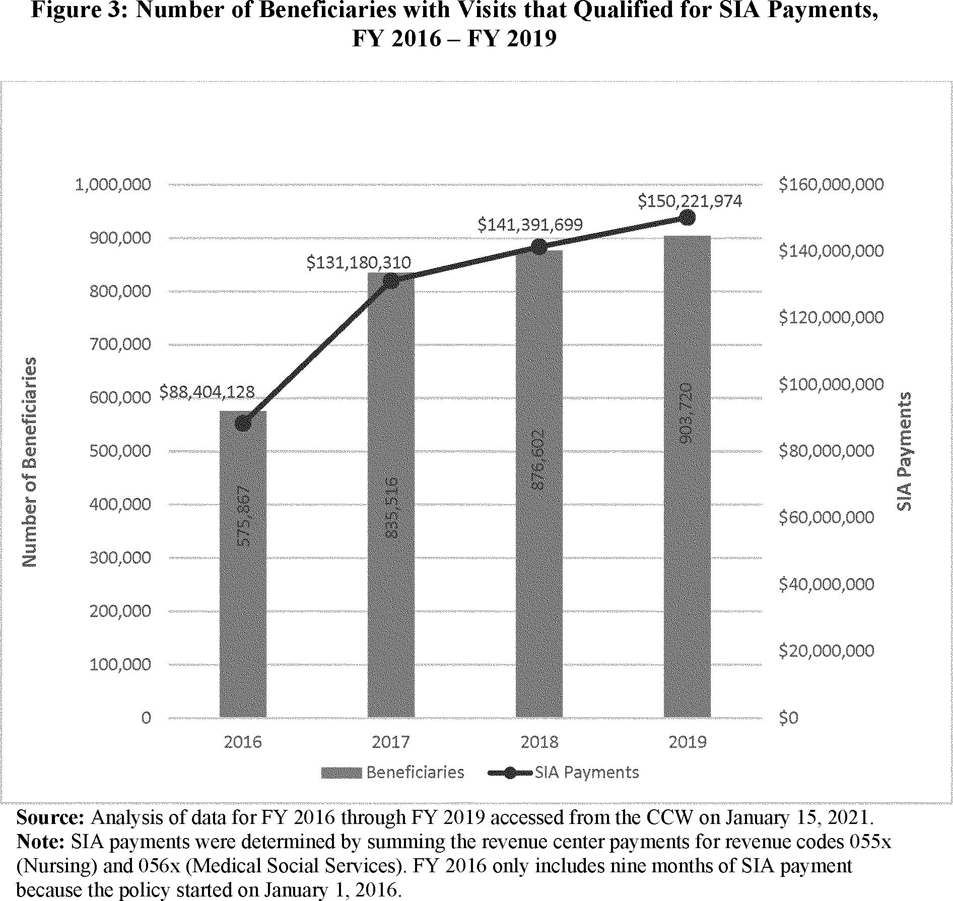 The SIA technically only applies to registered nurses and non-telephonic social worker visits. The distinction was not widely possible in the claims data prior to the SIA's implementation. For the analyses in this section we examine all skilled nurse and social worker visits, broadly.