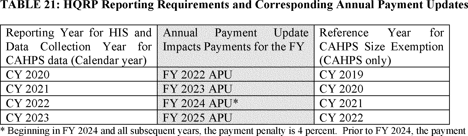 In addition, sections 1814(i)(5)(A) through (C) of the Act, as added by section 3132(a) of the Patient Protection and Affordable Care Act (PPACA) (Pub. L. 111-148), required hospices to begin submitting quality data, based on measures specified by the Secretary of the Department of Health and Human Services (the Secretary), for FY 2014 and subsequent FYs. Since FY 2014, hospices that fail to report quality data have their market basket percentage increase reduced by 2 percentage points. Note that with the passage of the Consolidated Appropriations Act, 2021 (hereafter referred to as CAA 2021) (Pub. L. 116-260), the reduction changes to 4 percentage points beginning in FY 2024.