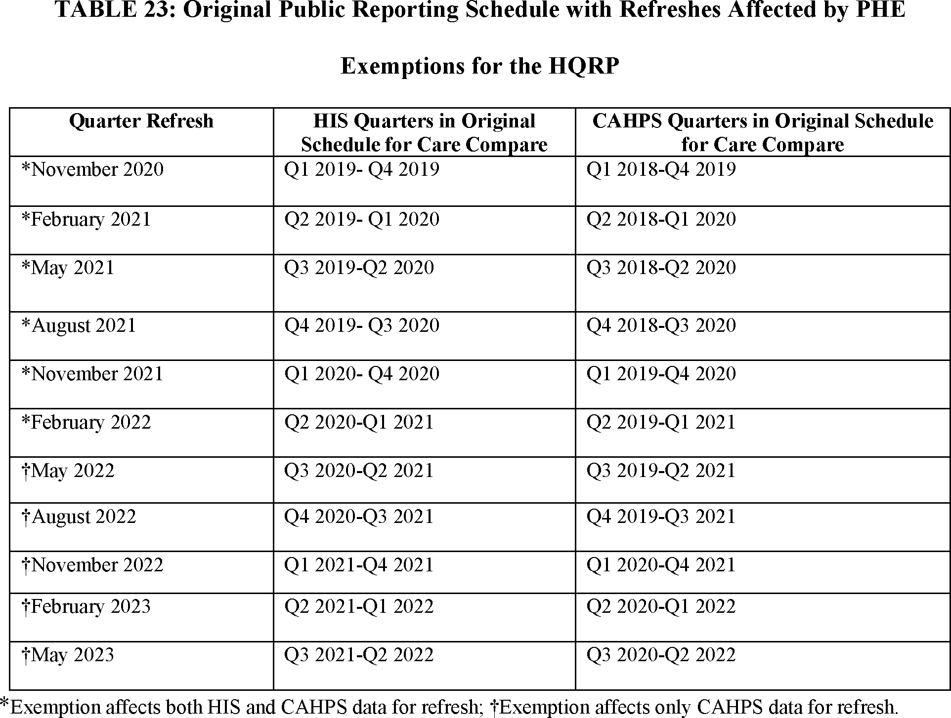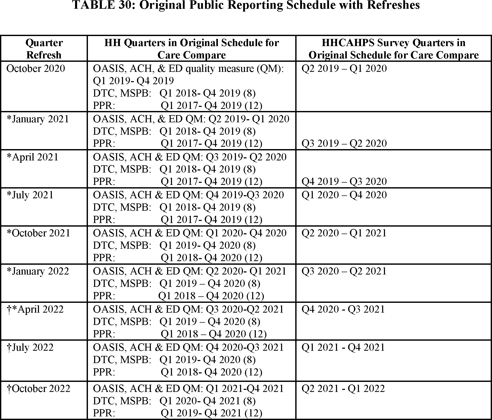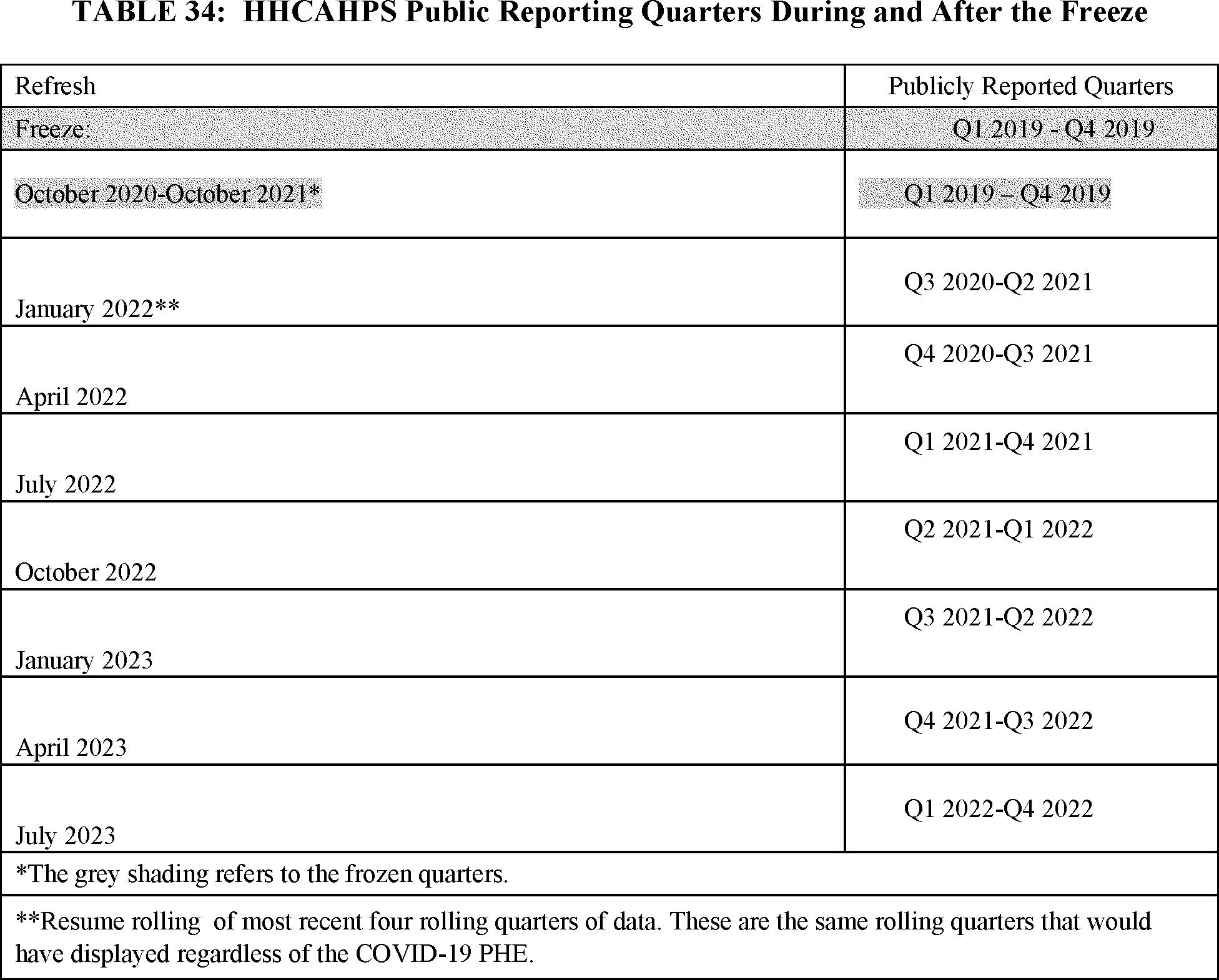 Finally, in section III.G of this rule, we are proposing changes to the HH QRP to establish that, beginning with the January 2022 through the July 2024 public reporting refresh cycle, we will report fewer quarters of data due to COVID-19 PHE exceptions granted on March 27, 2020. We include this Home Health proposal in this rule because we plan to resume public reporting for the HH QRP with the January 2022 refresh of Care Compare. In order to accommodate the exception of 2020 Q1 and Q2 data, we are proposing to resume public reporting using 3 out of 4 quarters of data for the January 2022 refresh. In order to finalize this proposal in time to release the required preview report related to the refresh, which we release 3 months prior to any given refresh (October 2021), we need the rule containing this proposal to finalize by October 2021.