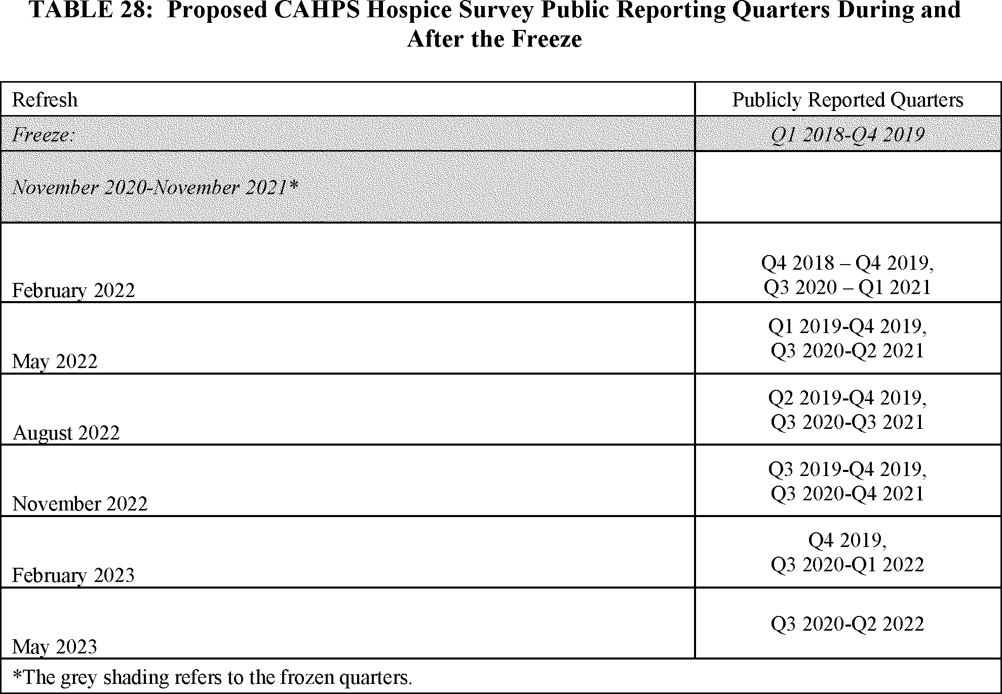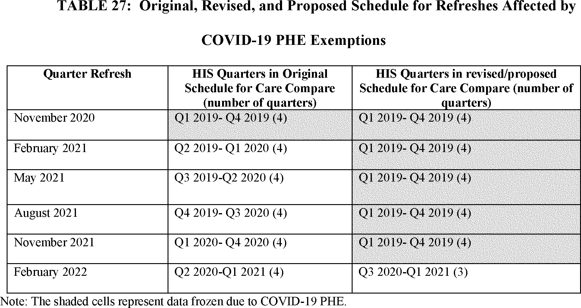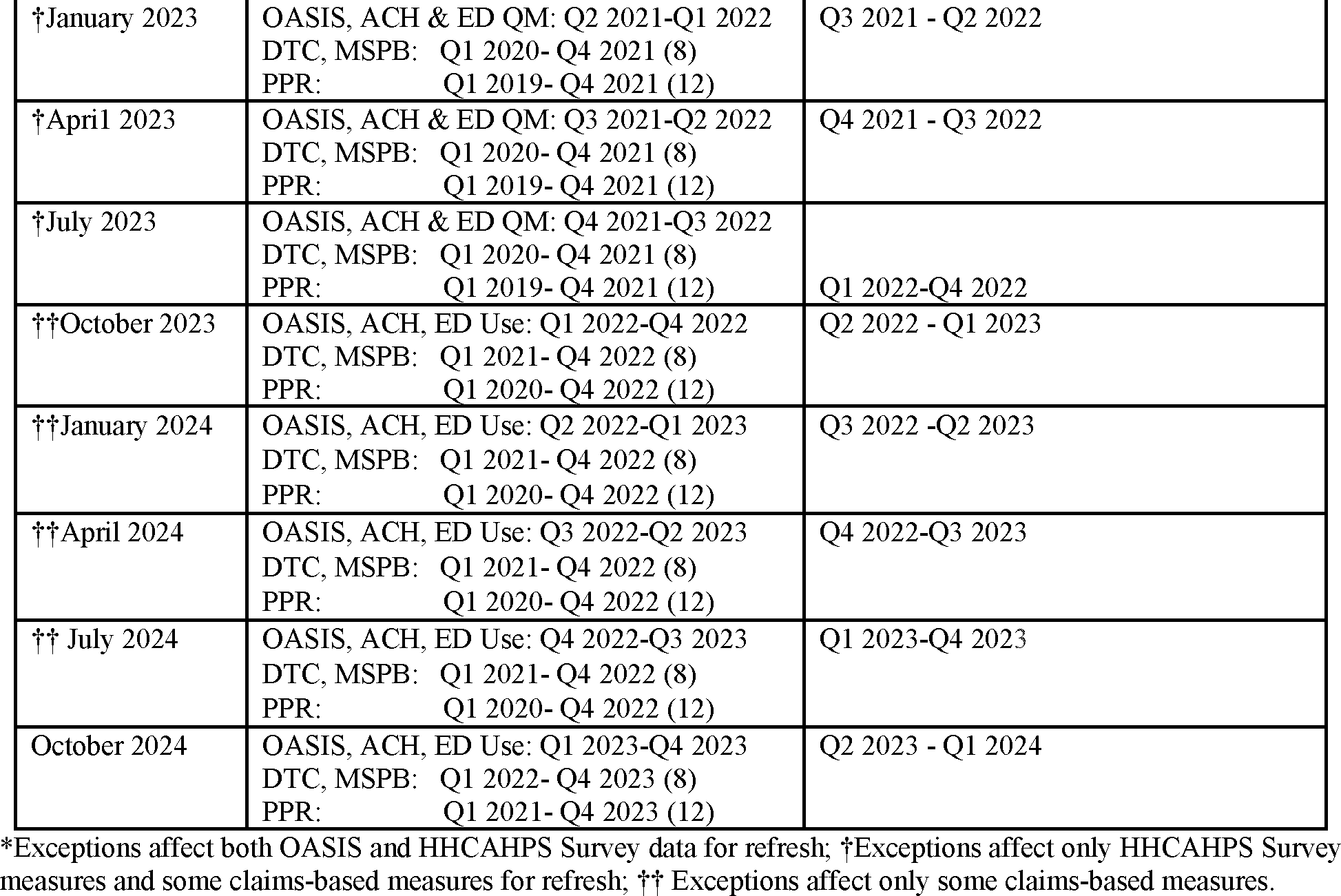 Finally, in section III.G of this rule, we are proposing changes to the HH QRP to establish that, beginning with the January 2022 through the July 2024 public reporting refresh cycle, we will report fewer quarters of data due to COVID-19 PHE exceptions granted on March 27, 2020. We include this Home Health proposal in this rule because we plan to resume public reporting for the HH QRP with the January 2022 refresh of Care Compare. In order to accommodate the exception of 2020 Q1 and Q2 data, we are proposing to resume public reporting using 3 out of 4 quarters of data for the January 2022 refresh. In order to finalize this proposal in time to release the required preview report related to the refresh, which we release 3 months prior to any given refresh (October 2021), we need the rule containing this proposal to finalize by October 2021.