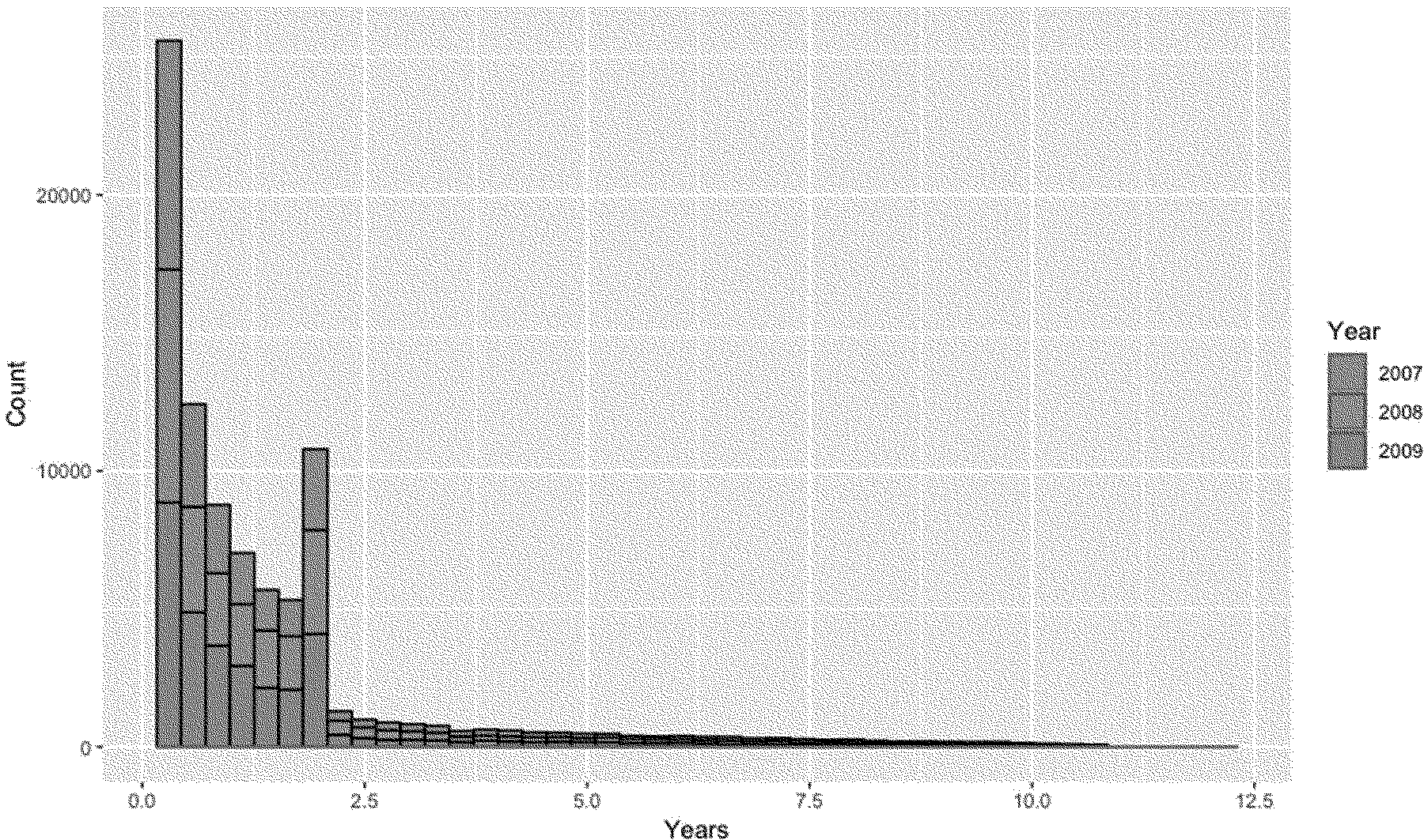 Figure 1: Plot of the number of previously registered persons that reregister within a given number of years after having terminated their registrations for at least 60 days in either 2007, 2008 or 2009. Each bar represents 100 days, and every year is accordingly represented by approximately three-and-a-half bars. ( printed page 33434)