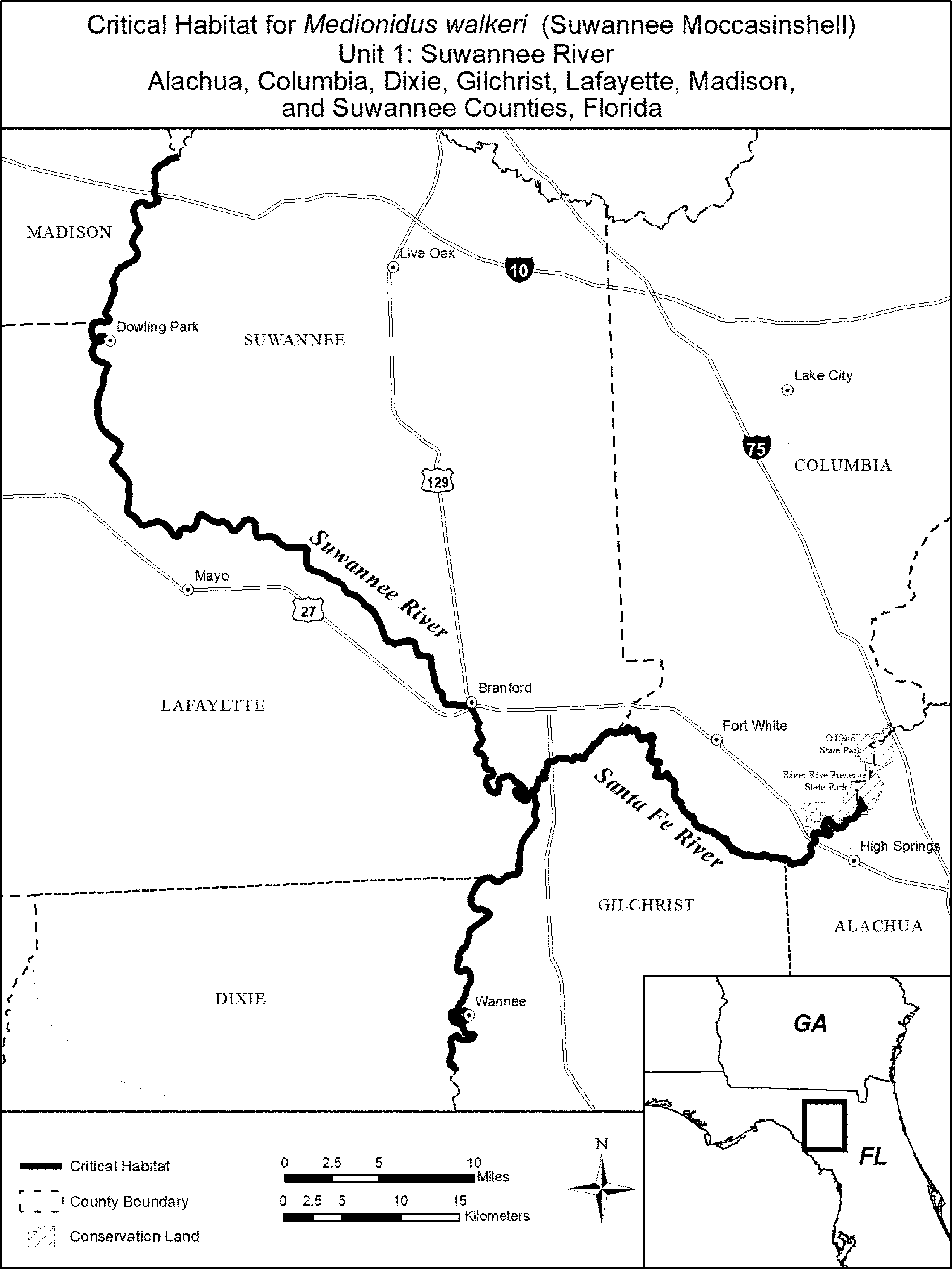 (6) Unit 1: Suwannee River in Alachua, Columbia, Dixie, Gilchrist, Lafayette, Madison, and Suwannee Counties, Florida.
