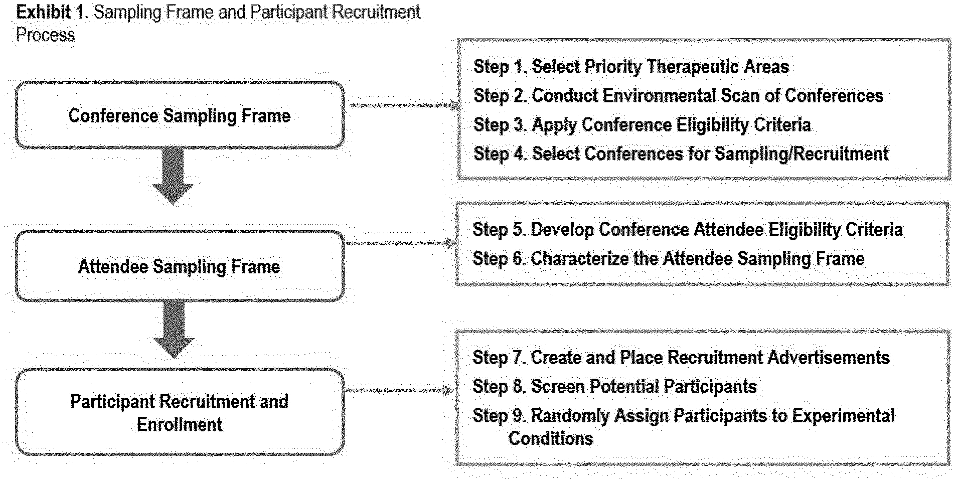 To complete this research, we will recruit attendees of large medical conferences in the United States over the course of 1 year. These conferences will represent a variety of specialties to reflect medical areas that have prescription treatments that may be promoted to HCPs. Specifically, we will enroll HCPs who attended one of 12 selected medical conferences into an online survey within 7 days of conference attendance. Exhibit 1 summarizes our approach to: (1) Determining the conference sampling frame; (2) determining the attendee sampling frame; and (3) recruiting and enrolling the target sample in the online survey.