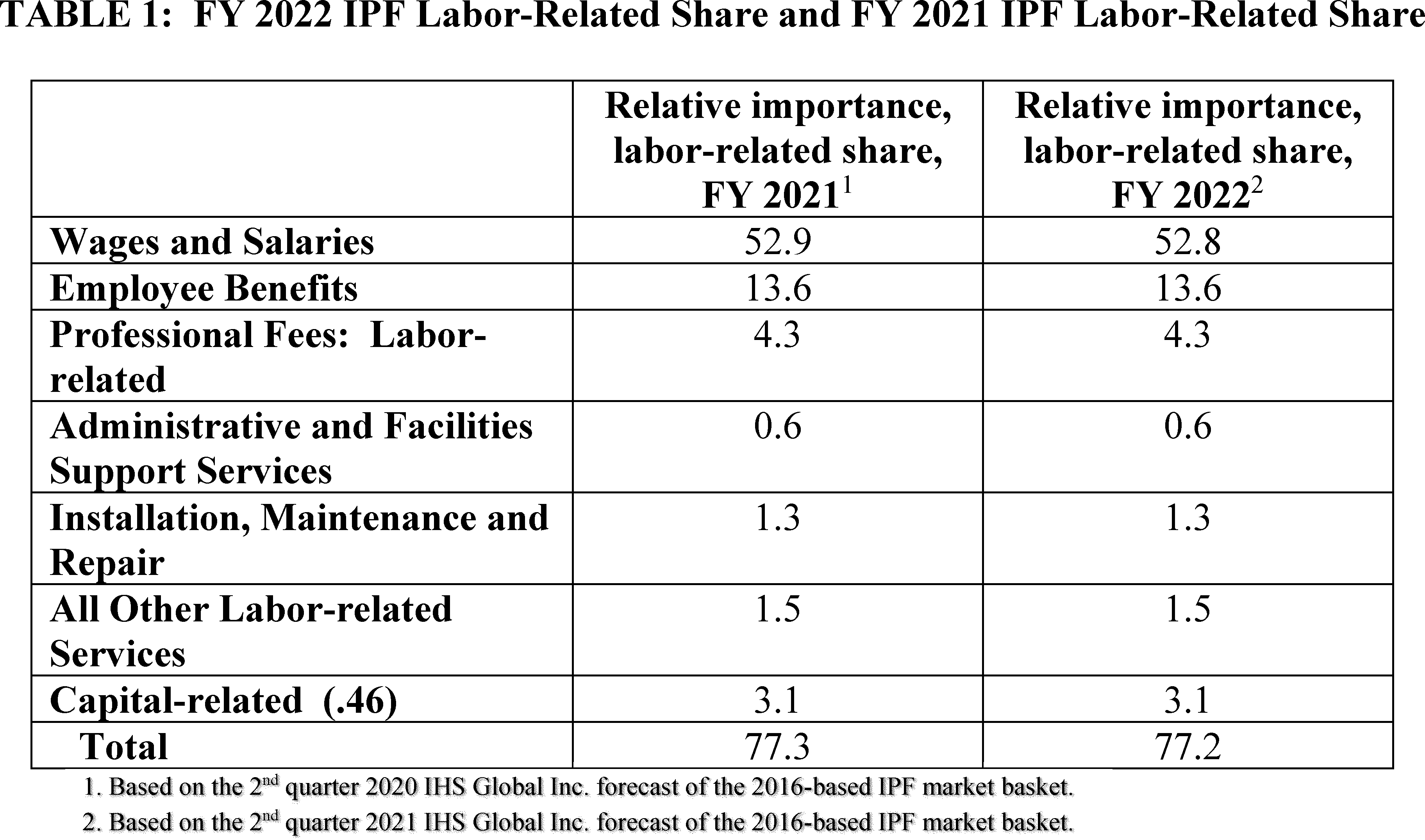 Based on IGI's second quarter 2021 forecast of the 2016-based IPF market basket, the sum of the FY 2022 relative importance for Wages and Salaries; Employee Benefits; Professional Fees: Labor-related; Administrative and Facilities Support Services; Installation Maintenance & Repair Services; and All Other: Labor-related Services is 74.1 percent. Since the relative importance for Capital-Related costs is 6.7 percent of the 2016-based IPF market basket for FY 2022, we take 46 percent of 6.7 percent to determine the labor-related share of Capital-Related costs for FY 2022 of 3.1 percent. Therefore, the current estimate of the total labor-related share for FY 2022 is equal to 77.2 percent (the sum of 74.1 percent for the labor-related share of operating costs and 3.1 percent for the labor-related share of Capital-Related costs). Table 1 shows the final FY 2022 labor-related share and the final FY 2021 labor-related share using the 2016-based IPF market basket relative importance.