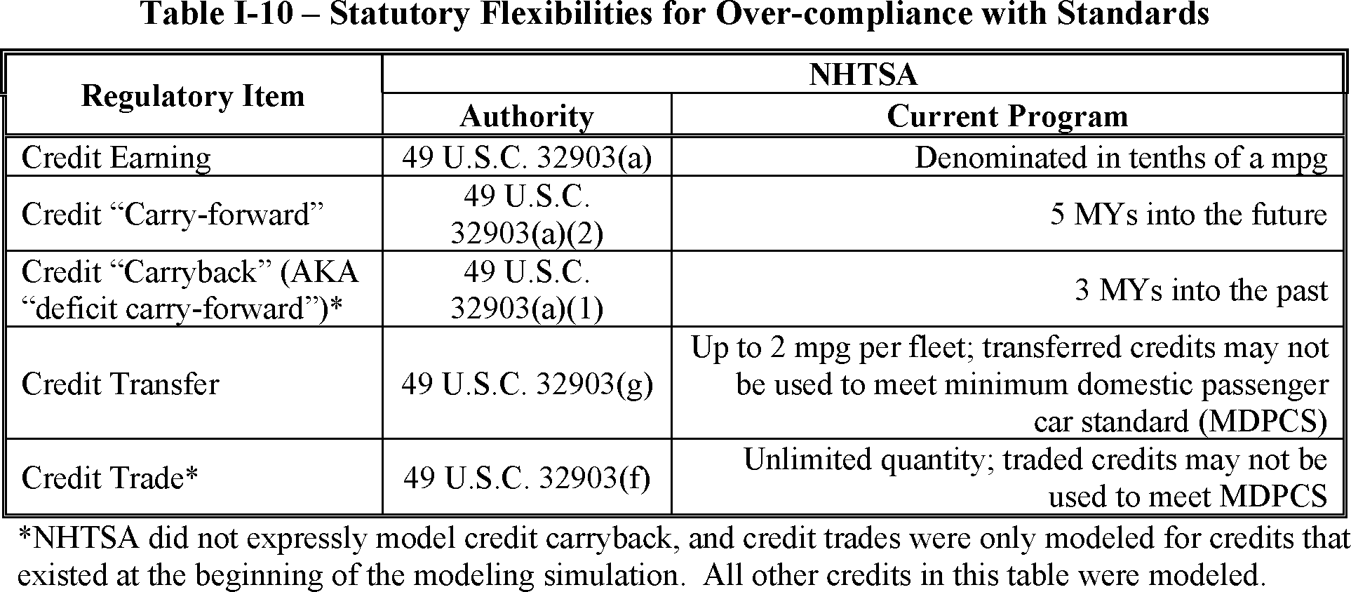 Additionally, although NHTSA is prohibited from considering the availability of certain flexibilities in making our determination about the levels of CAFE standards that would be maximum feasible, manufacturers have a variety of flexibilities available to them to reduce their compliance burden. Table I-10 through Table I-13 below summarizes available compliance flexibilities. NHTSA seeks comment on whether to retain non-statutory flexibilities for the final rule.