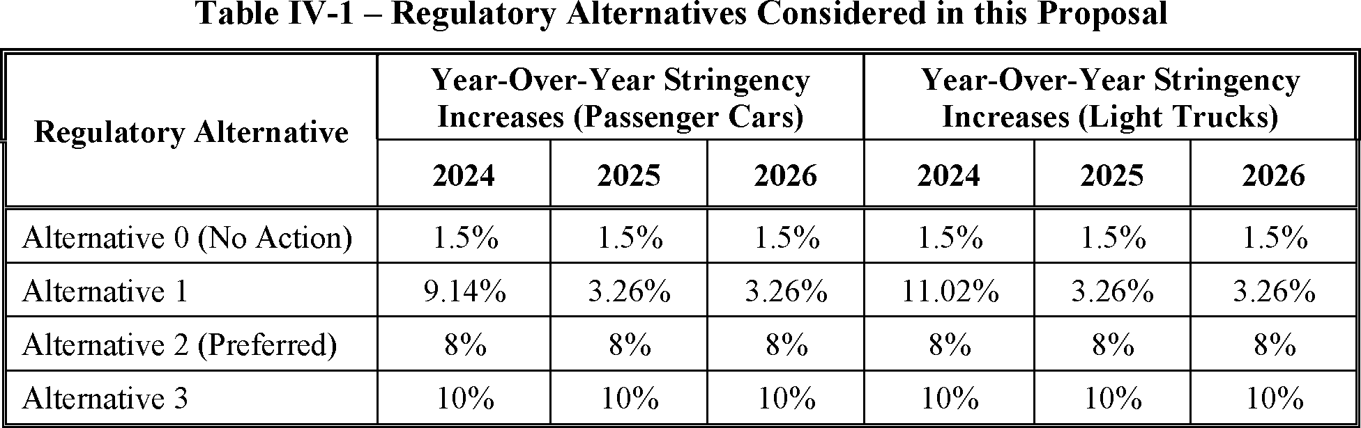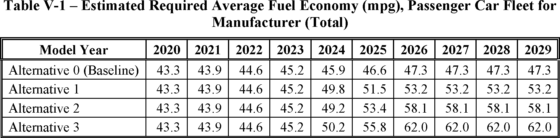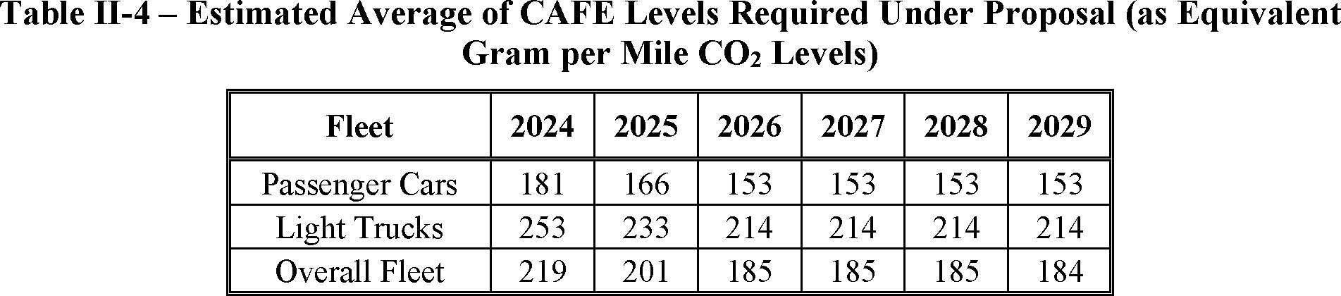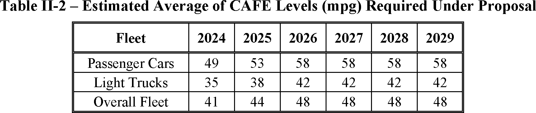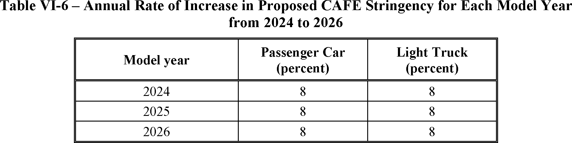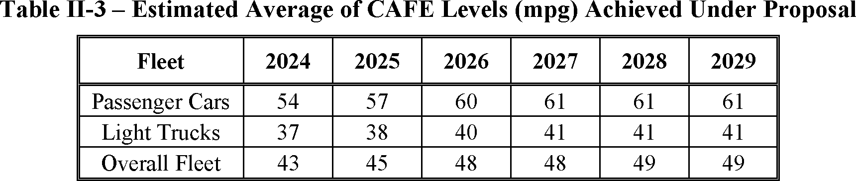 The proposed amended CAFE standards would increase in stringency from MY 2023 levels by 8 percent per year, for both passenger cars and light trucks over MYs 2024-2026. NHTSA tentatively concludes that this level is maximum feasible for these model years, as discussed in more detail in Section VI, and seeks comment on that conclusion. The proposal considers a range of regulatory alternatives, consistent with NHTSA's obligations under the National Environmental Policy Act (NEPA) and Executive Order 12866. While E.O. 13990 directed the review of CAFE standards for MYs 2021-2026, statutory lead time requirements mean that the soonest model year that can currently be amended in the CAFE program is MY 2024. The proposed standards would remain vehicle footprint-based, like the CAFE standards in effect since MY 2011. Recognizing that many readers think about CAFE standards in terms of the miles per gallon (mpg) values that the standards are projected to eventually require, NHTSA currently projects that the proposed standards would require, on an average industry fleet-wide basis, roughly 48 mpg in MY 2026. NHTSA notes both that real-world fuel economy is generally 20-30 percent lower than the estimated required CAFE level stated above, and also that the actual CAFE standards are the footprint target curves for passenger cars and light trucks, meaning that ultimate fleet-wide levels will vary depending on the mix of vehicles that industry produces for sale in those model years. Table I-1 shows the incremental differences in stringency levels for passenger cars and light trucks, by regulatory alternative, in the model years subject to regulation.