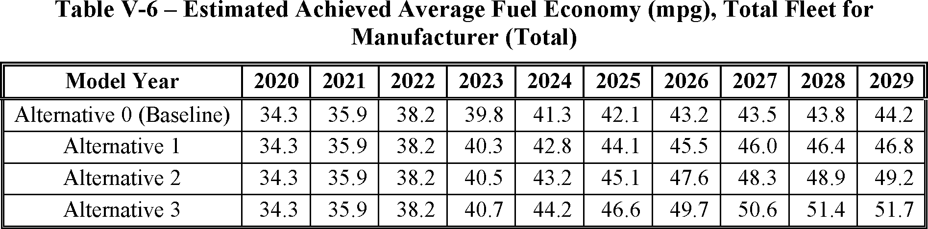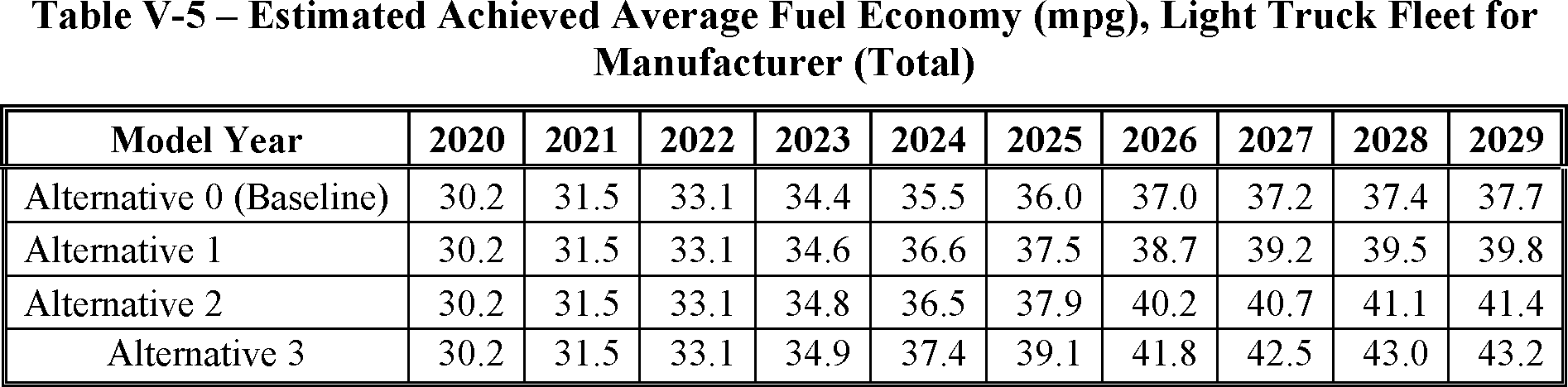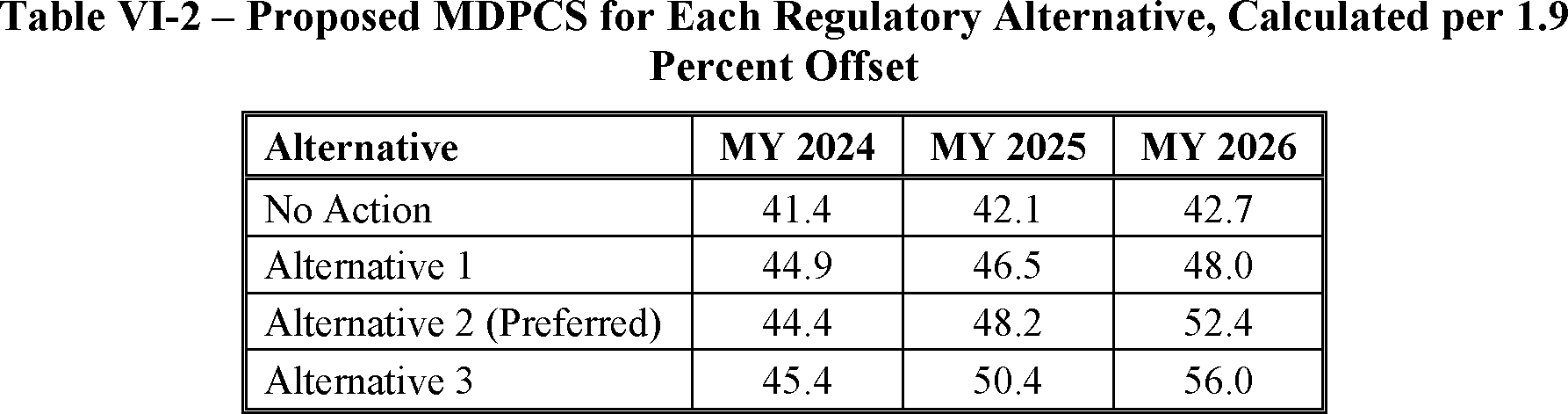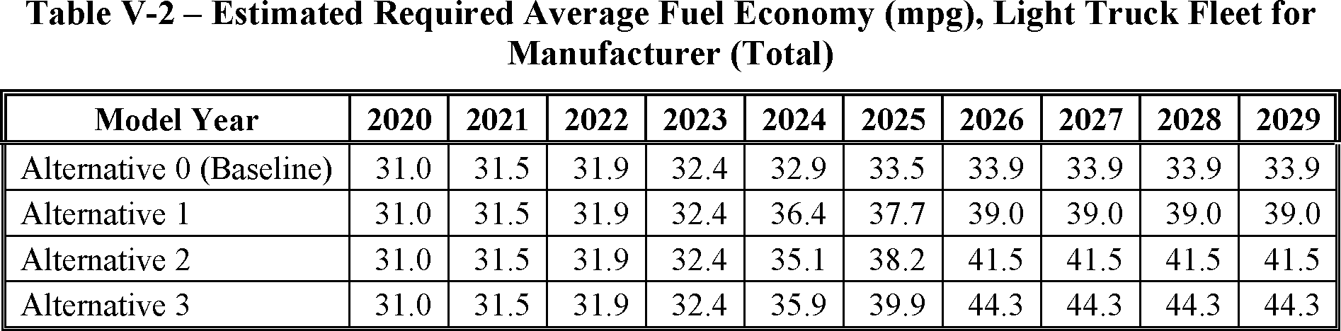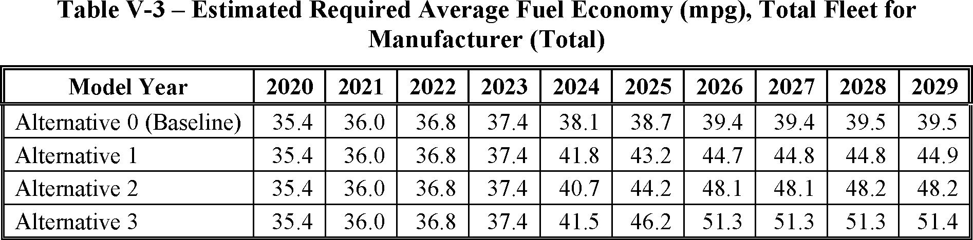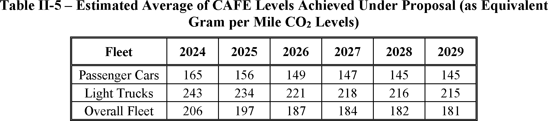 The proposed amended CAFE standards would increase in stringency from MY 2023 levels by 8 percent per year, for both passenger cars and light trucks over MYs 2024-2026. NHTSA tentatively concludes that this level is maximum feasible for these model years, as discussed in more detail in Section VI, and seeks comment on that conclusion. The proposal considers a range of regulatory alternatives, consistent with NHTSA's obligations under the National Environmental Policy Act (NEPA) and Executive Order 12866. While E.O. 13990 directed the review of CAFE standards for MYs 2021-2026, statutory lead time requirements mean that the soonest model year that can currently be amended in the CAFE program is MY 2024. The proposed standards would remain vehicle footprint-based, like the CAFE standards in effect since MY 2011. Recognizing that many readers think about CAFE standards in terms of the miles per gallon (mpg) values that the standards are projected to eventually require, NHTSA currently projects that the proposed standards would require, on an average industry fleet-wide basis, roughly 48 mpg in MY 2026. NHTSA notes both that real-world fuel economy is generally 20-30 percent lower than the estimated required CAFE level stated above, and also that the actual CAFE standards are the footprint target curves for passenger cars and light trucks, meaning that ultimate fleet-wide levels will vary depending on the mix of vehicles that industry produces for sale in those model years. Table I-1 shows the incremental differences in stringency levels for passenger cars and light trucks, by regulatory alternative, in the model years subject to regulation.
