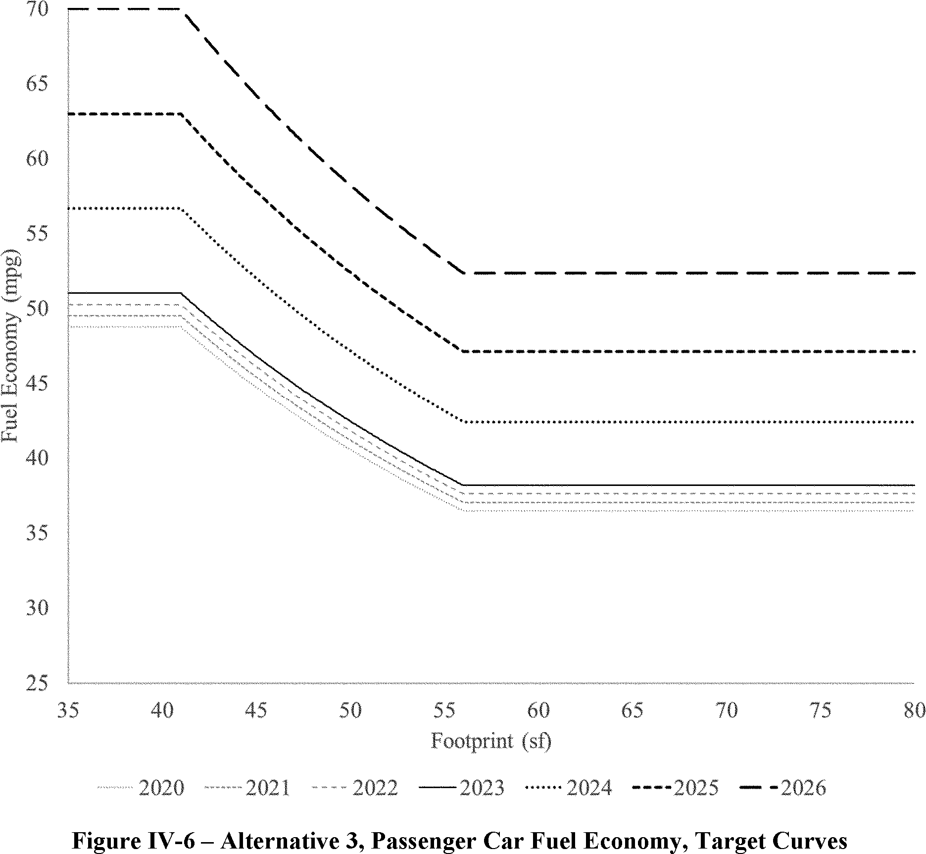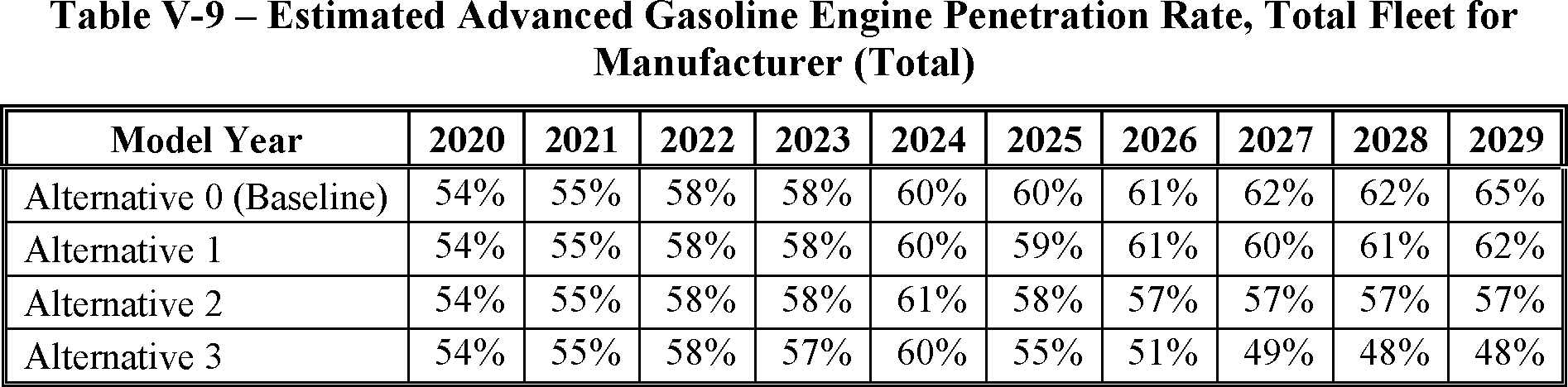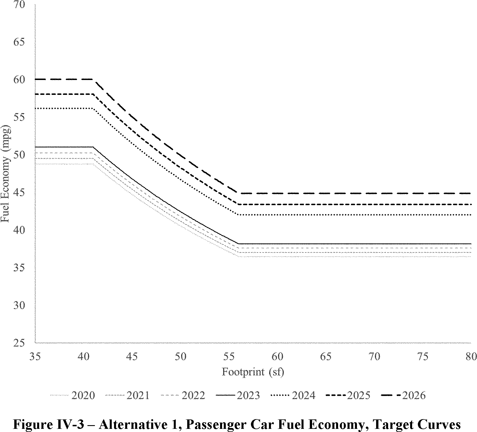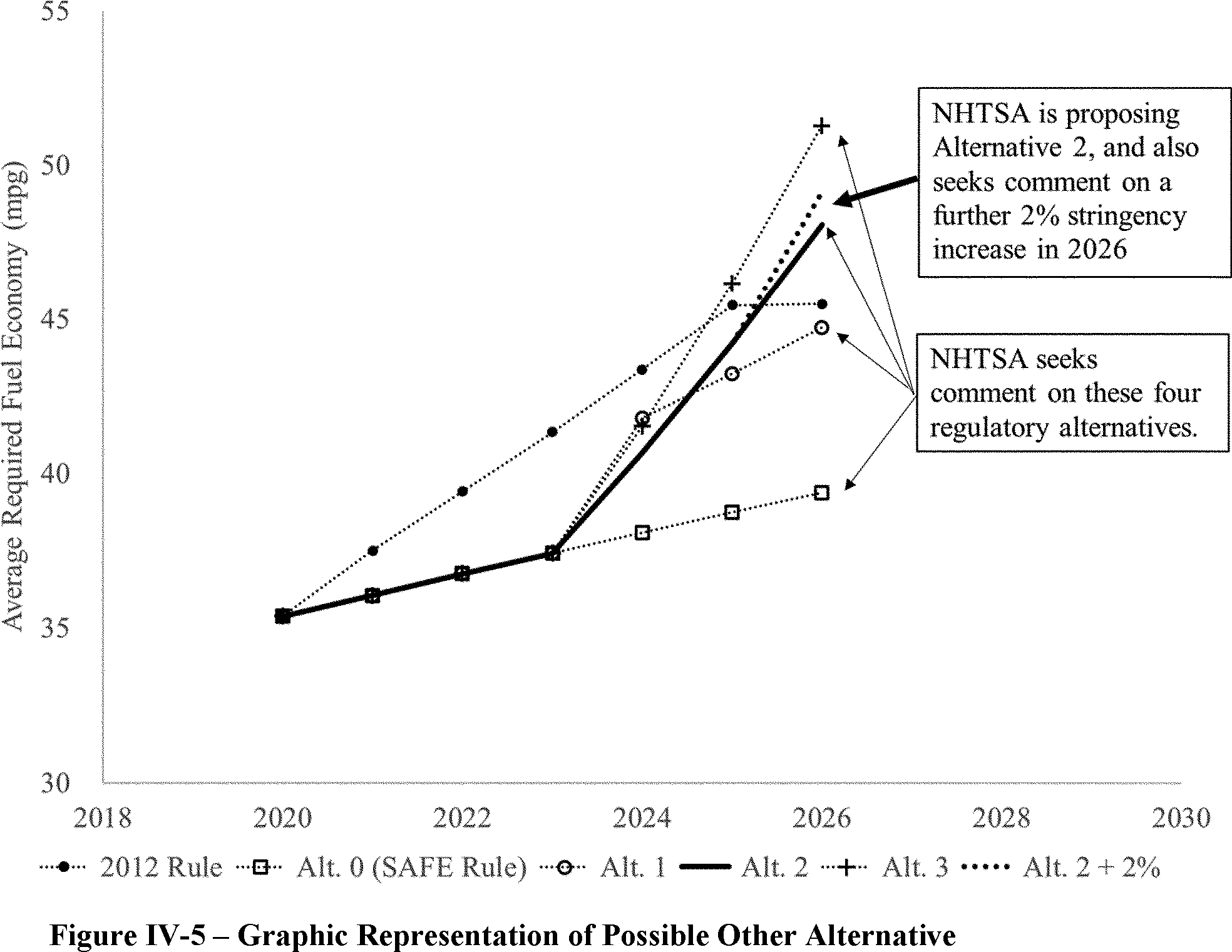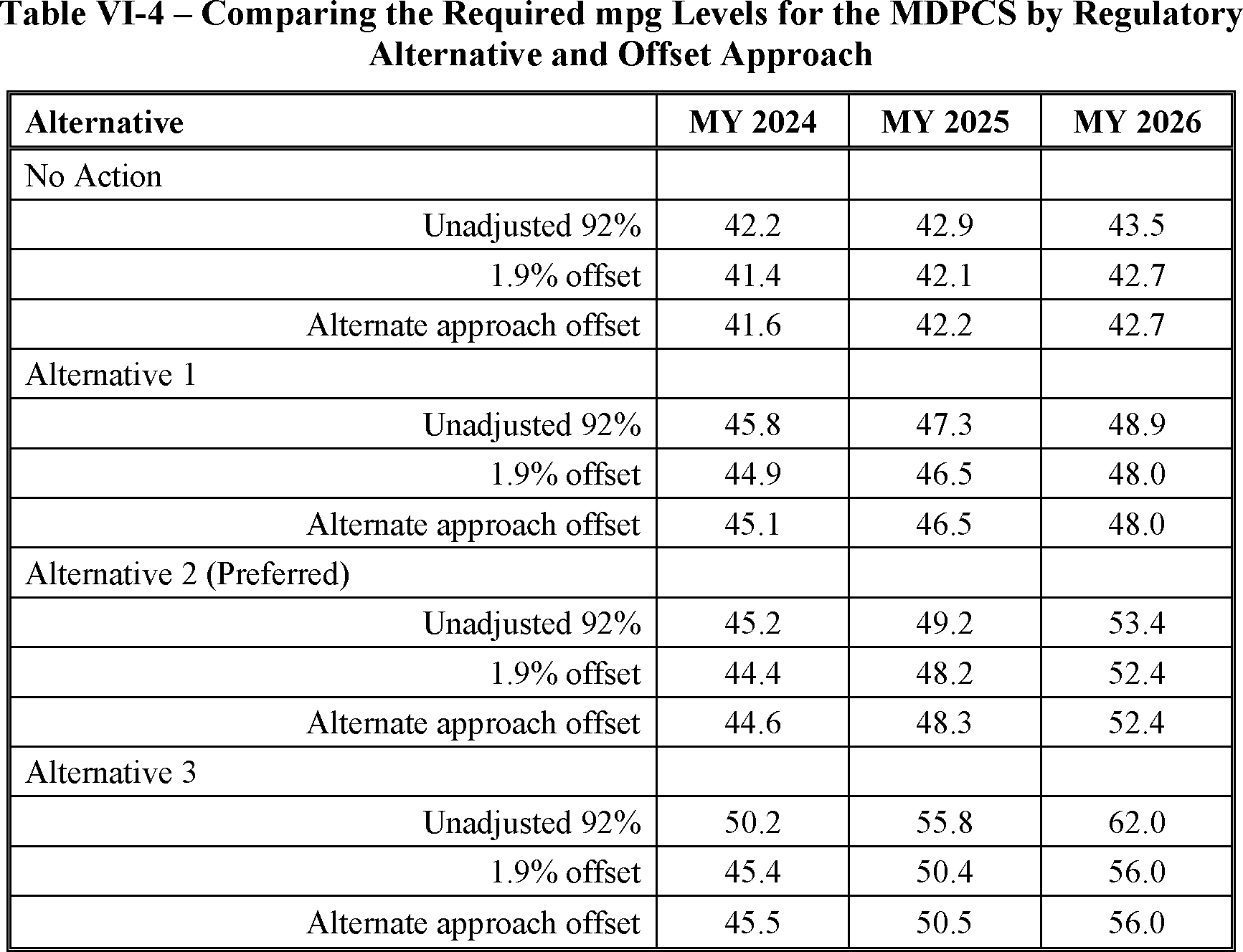 The proposed amended CAFE standards would increase in stringency from MY 2023 levels by 8 percent per year, for both passenger cars and light trucks over MYs 2024-2026. NHTSA tentatively concludes that this level is maximum feasible for these model years, as discussed in more detail in Section VI, and seeks comment on that conclusion. The proposal considers a range of regulatory alternatives, consistent with NHTSA's obligations under the National Environmental Policy Act (NEPA) and Executive Order 12866. While E.O. 13990 directed the review of CAFE standards for MYs 2021-2026, statutory lead time requirements mean that the soonest model year that can currently be amended in the CAFE program is MY 2024. The proposed standards would remain vehicle footprint-based, like the CAFE standards in effect since MY 2011. Recognizing that many readers think about CAFE standards in terms of the miles per gallon (mpg) values that the standards are projected to eventually require, NHTSA currently projects that the proposed standards would require, on an average industry fleet-wide basis, roughly 48 mpg in MY 2026. NHTSA notes both that real-world fuel economy is generally 20-30 percent lower than the estimated required CAFE level stated above, and also that the actual CAFE standards are the footprint target curves for passenger cars and light trucks, meaning that ultimate fleet-wide levels will vary depending on the mix of vehicles that industry produces for sale in those model years. Table I-1 shows the incremental differences in stringency levels for passenger cars and light trucks, by regulatory alternative, in the model years subject to regulation.