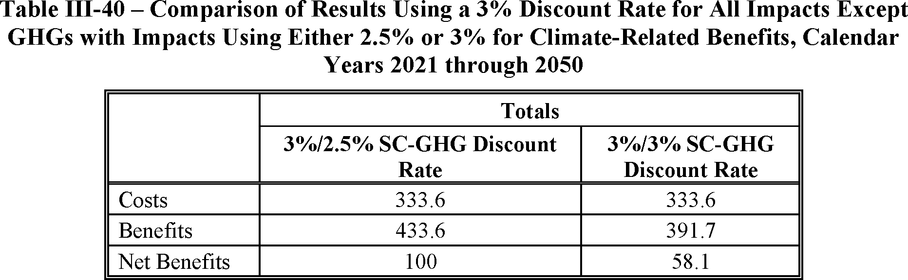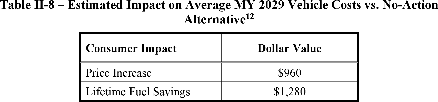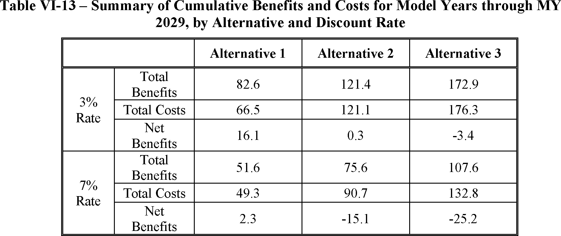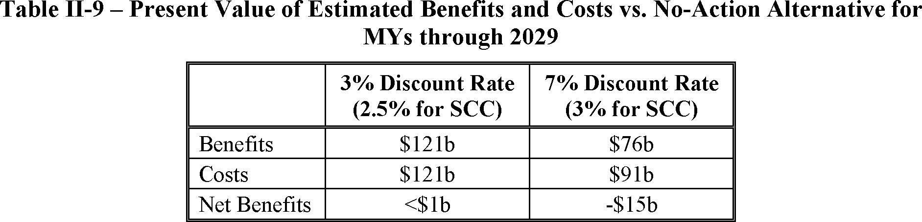 NHTSA estimates that this proposal could reduce average undiscounted fuel outlays over the lifetimes of MY 2029 vehicles by about $1,280, while increasing the average cost of those vehicles by about $960 over the baseline described above. With the social cost of carbon (SCC) discounted at 2.5 percent and other benefits and costs discounted at 3 percent, for the three affected model years NHTSA finds $65.8 billion in benefits attributable to the proposed standards and $37.4 billion in proposed costs so that present net benefits could be $28.4 billion.[2]