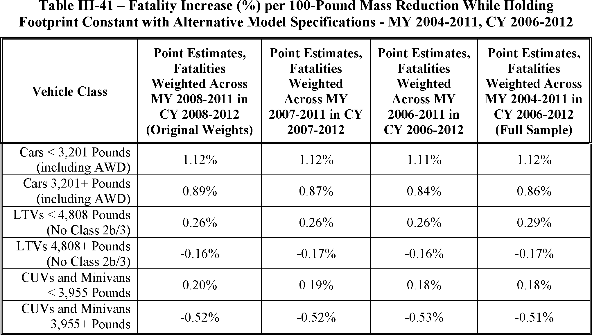 While many of the assumptions made for the analysis were conservative, others were “central.” For example, in some cases, an average vehicle was selected on which the analysis was conducted. In that case, a smaller vehicle may presumably deserve fewer credits whereas a larger vehicle may deserve more. Where the estimates are central, it would be inappropriate for the agencies to grant greater credit for larger vehicles, since this value is already balanced by smaller vehicles in the fleet. The agencies take these matters into consideration when applications are submitted for credits beyond those provided on the menu.