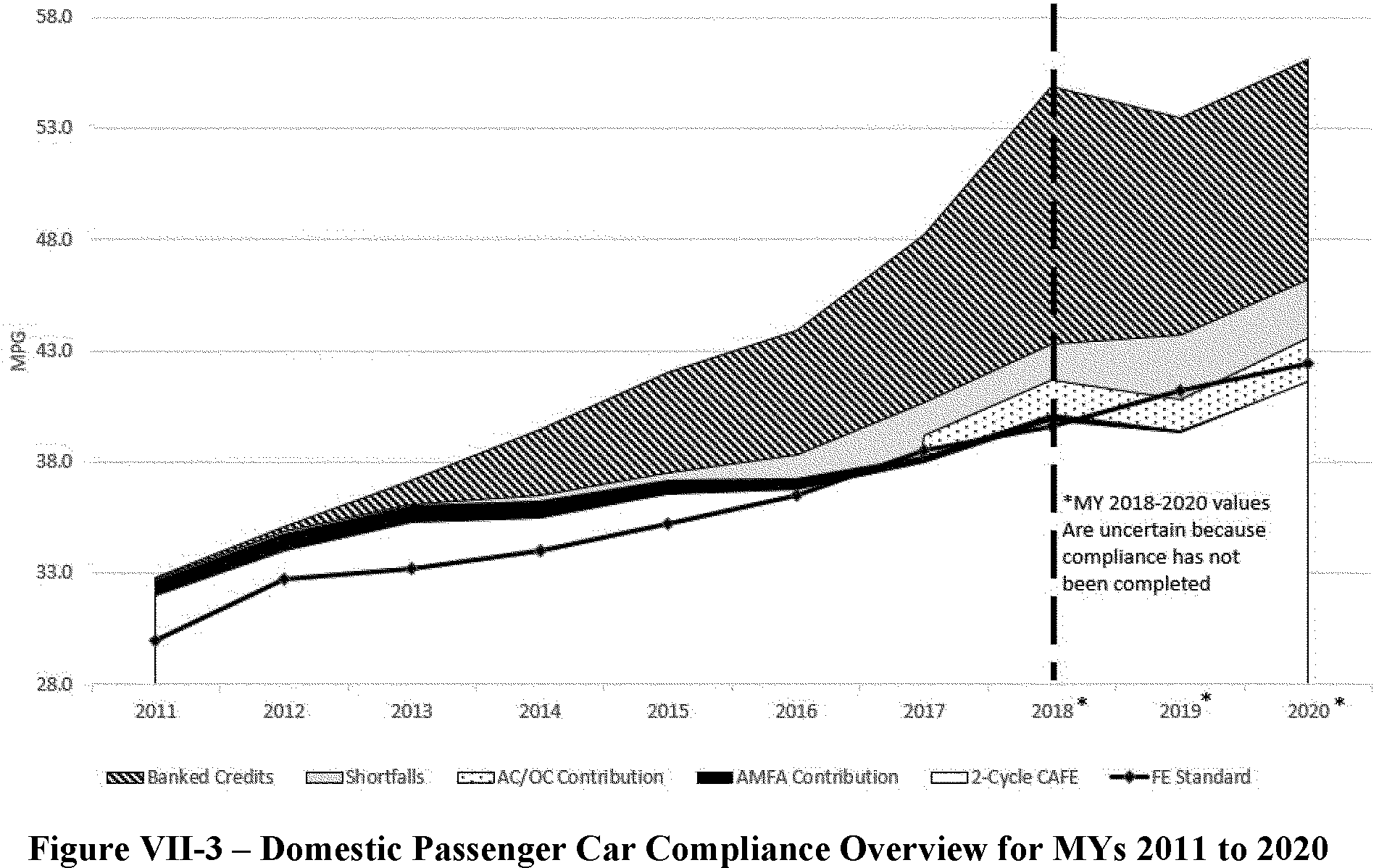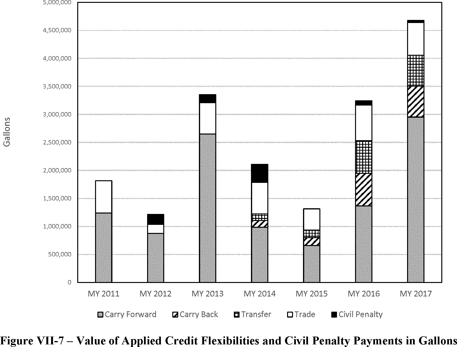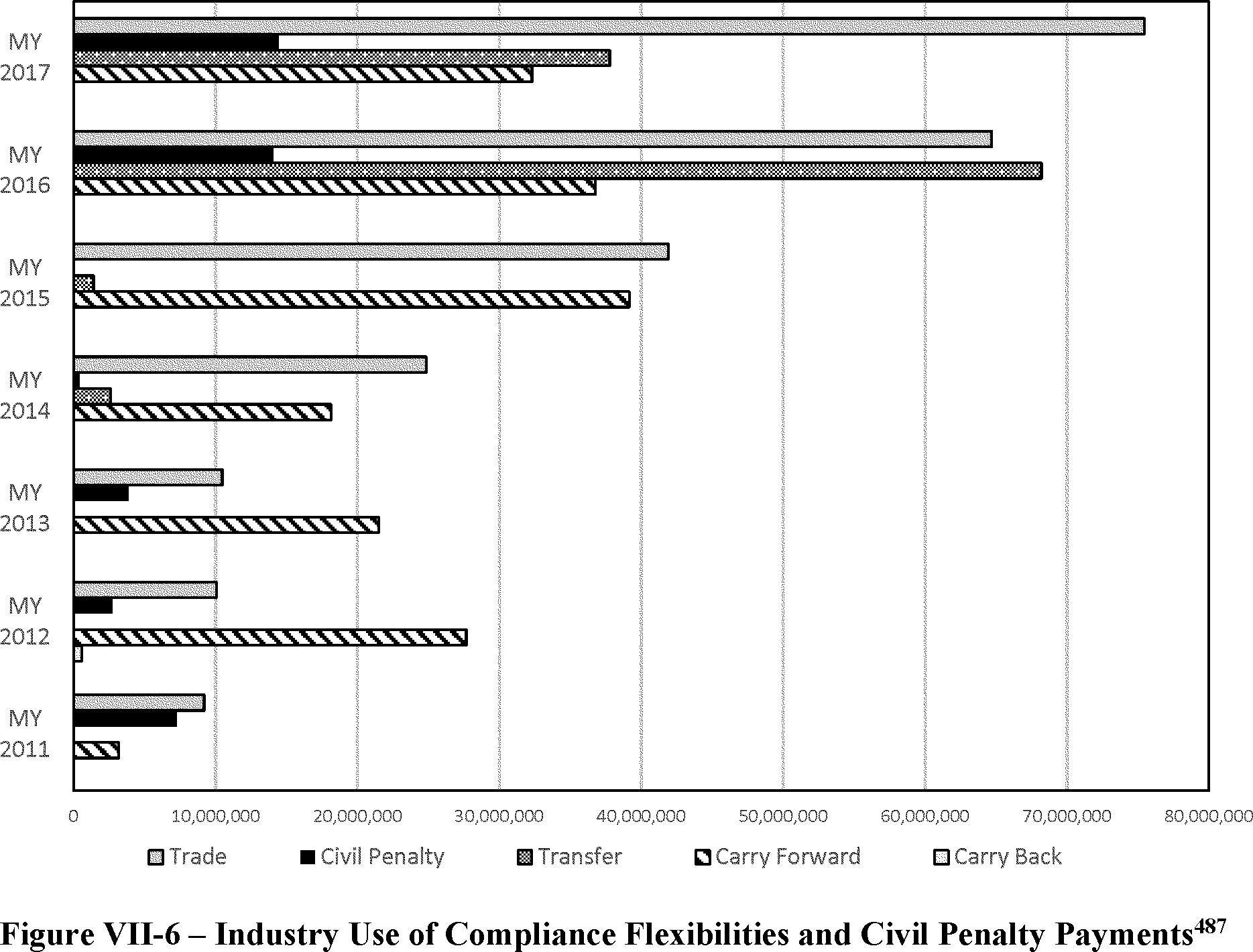 For Figure VII-6; in each year some flexibilities were not utilized by manufacturers. For example, carry backed credits were not utilized in 2011, 2013, 2014, 2015, 2016, or 2017. Transfer credits were not used in 2011, 2012 or 2013. No civil penalties were paid in 2015.