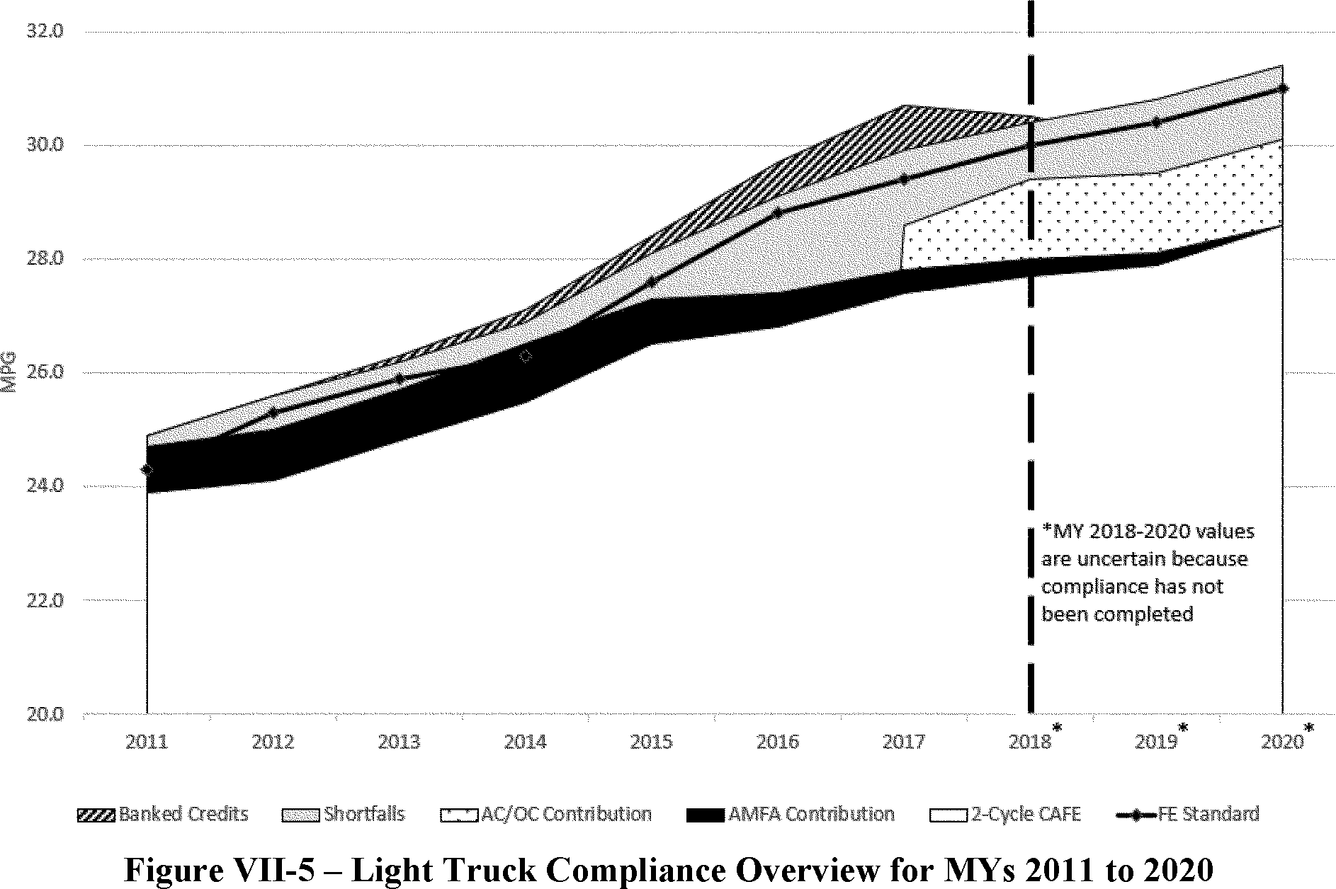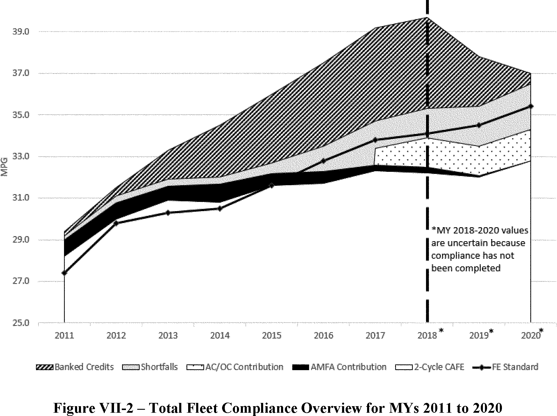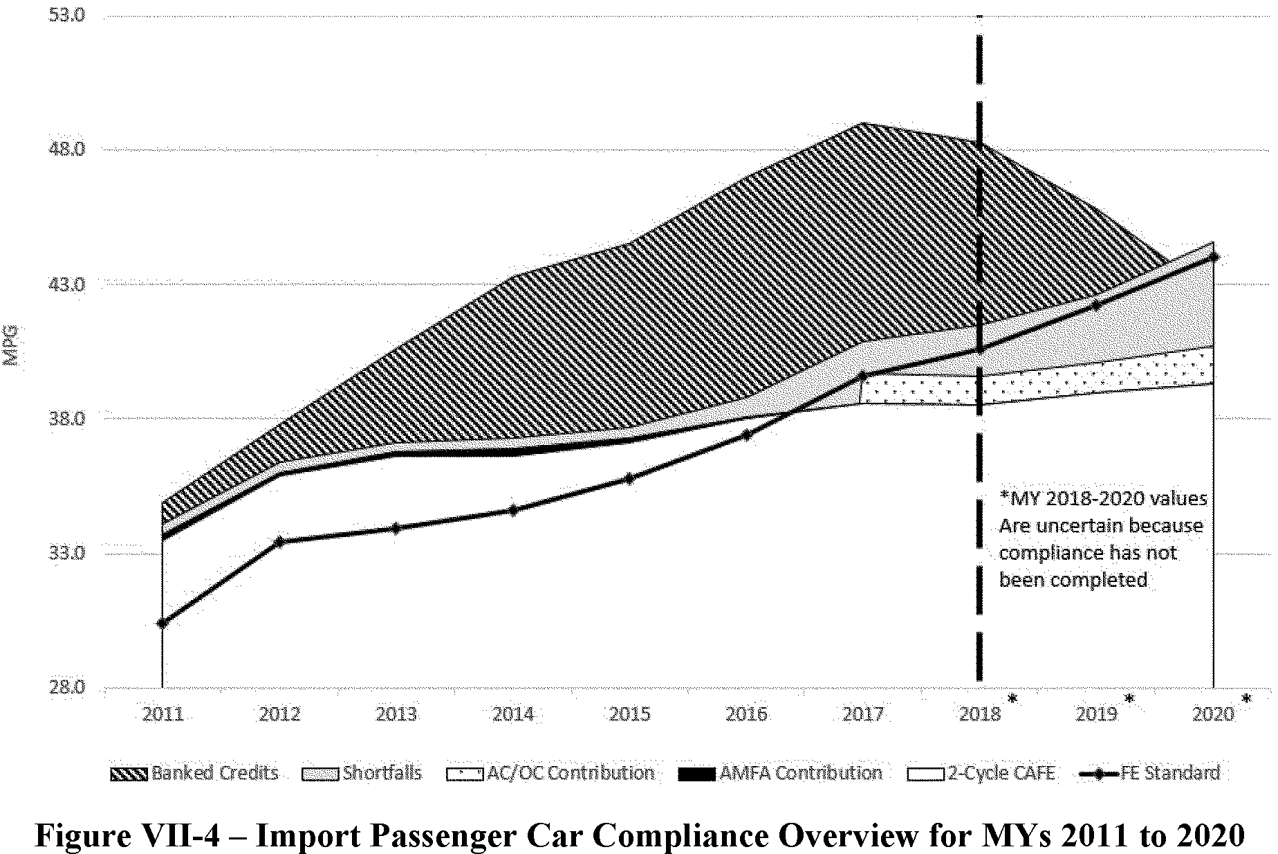For Figure VII-6; in each year some flexibilities were not utilized by manufacturers. For example, carry backed credits were not utilized in 2011, 2013, 2014, 2015, 2016, or 2017. Transfer credits were not used in 2011, 2012 or 2013. No civil penalties were paid in 2015.