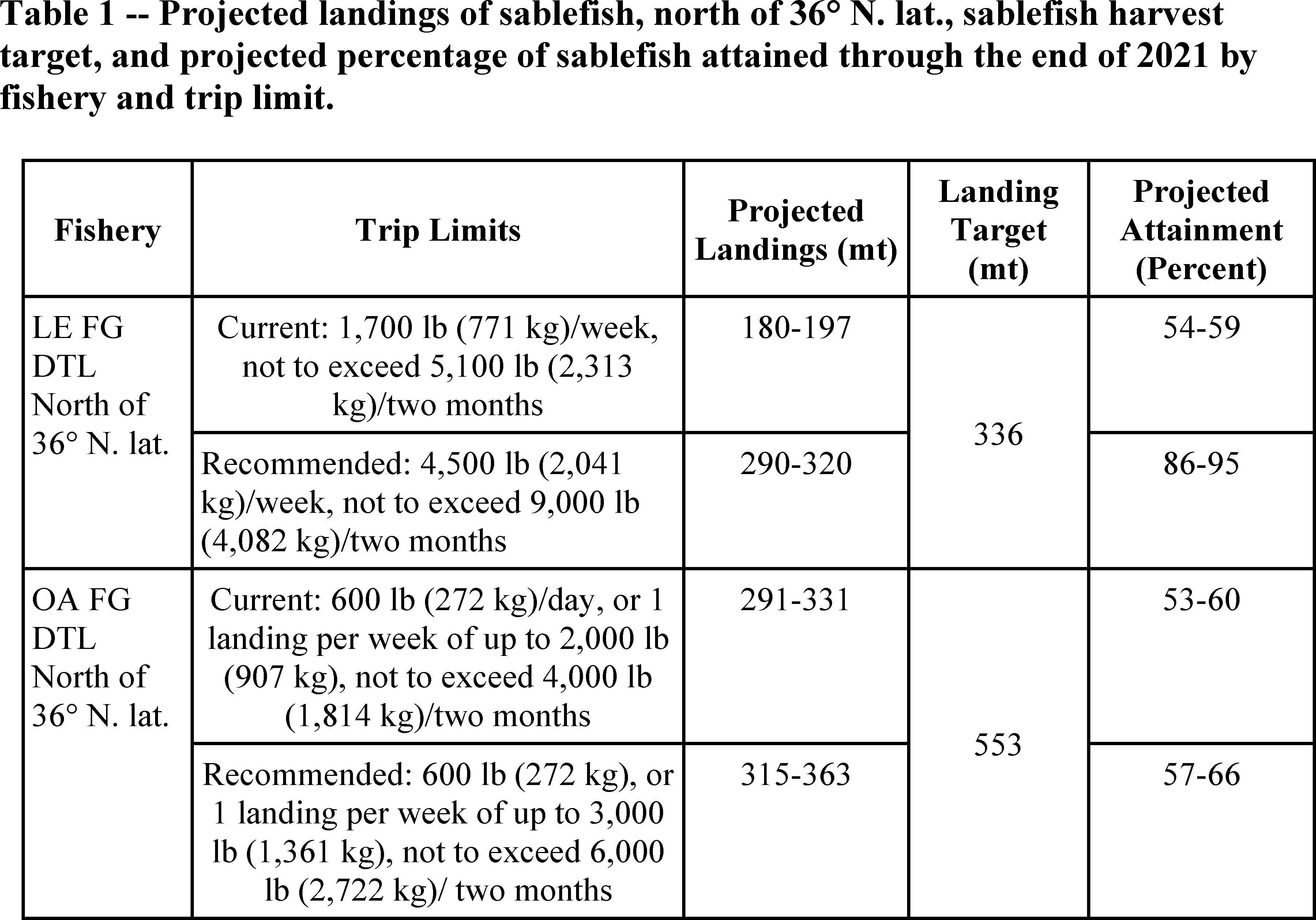 Sablefish is an important commercial species on the West Coast, targeted by vessels using both bottom trawl and fixed gear (longlines and pots/traps). The sablefish stock is managed with a coast-wide OFL and ABC, but with separate ACLs, north and south of 36° N latitude. In 2021, the ACL for sablefish north of 36° N latitude is 6,892 metric tons (mt) with a fishery HG of 6,165 mt. The fishery HG north of 36° N latitude is further divided between the LE FG and OA sectors with 90.6 percent, or 5,586 mt, going to the LE sector and 9.4 percent, or 580 mt, going to the OA sector. The LE share is divided so that 58 percent goes to trawl and 42 percent goes to FG. The LE FG share is further divided between the sablefish primary (tier) fishery (85% or 1,994 mt) and the daily trip limit (DTL) fisheries (15% or 352 mt), as shown in Table 1c. to Title 50, part 660, subpart C of the CFR. The sablefish DTL fisheries are individually managed using landing targets (Table 1), which have accounted for discard mortality a priori, by subtracting 4.5 percent from the DTL catch share. This same method of accounting for discard mortality to calculate the landing target is also used in managing the OA sablefish DTL fishery, north of 36° N latitude (Table 1).