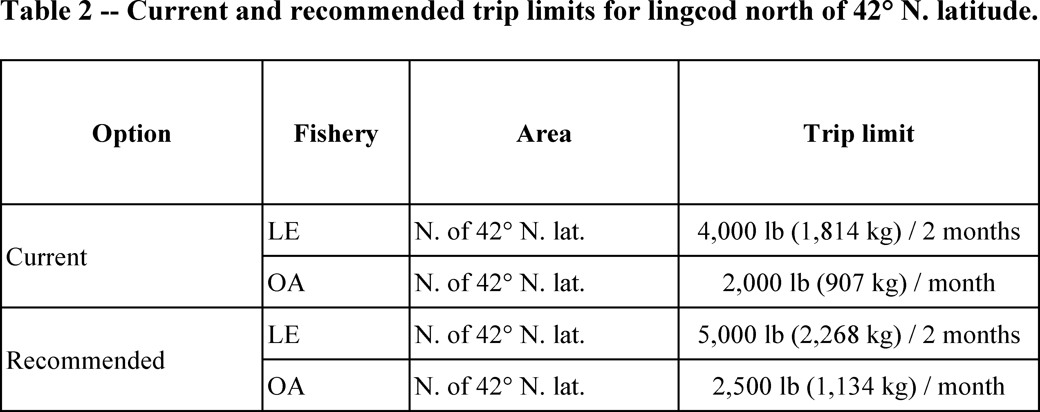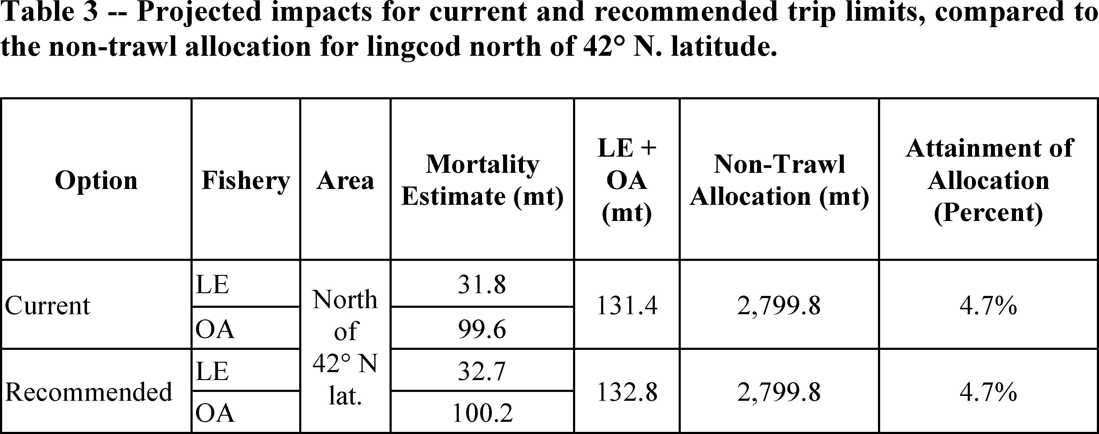 The Council also recommended changes to trip limits for lingcod north of 42° N latitude, after request from industry and analysis by the GMT, in order to reduce regulatory discard, which results in waste and lost revenue. Table 2 shows the current and recommended trip limits for lingcod north of 42° N latitude. Table 3 shows the projected impacts of those limits to total mortality, and percent attainment of the non-trawl allocation, north of 40° 10′ N latitude. Projected impacts to total fishing mortality are nearly identical, and well within the margin for error, but based on the analysis by the GMT, the higher landing limits are predicted to convert lost fish as discard, into landings and revenue, rather than inspire additional effort. By maintaining the same level of effort, and total fishing mortality, this increase in trip limits is not predicted to increase bycatch of yelloweye rockfish, which is managed under a rebuilding plan, and is a constraint to this fixed gear lingcod attainment.