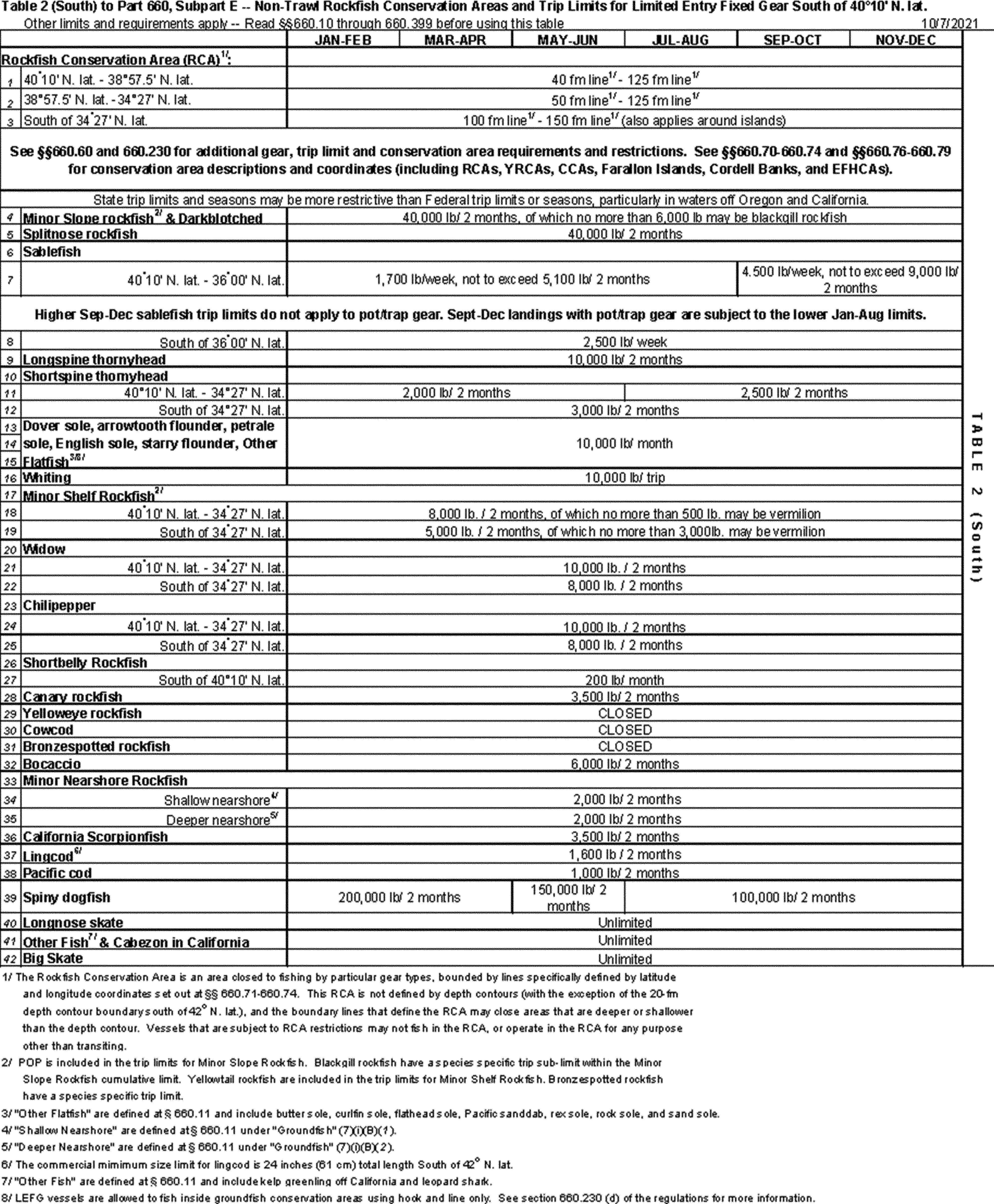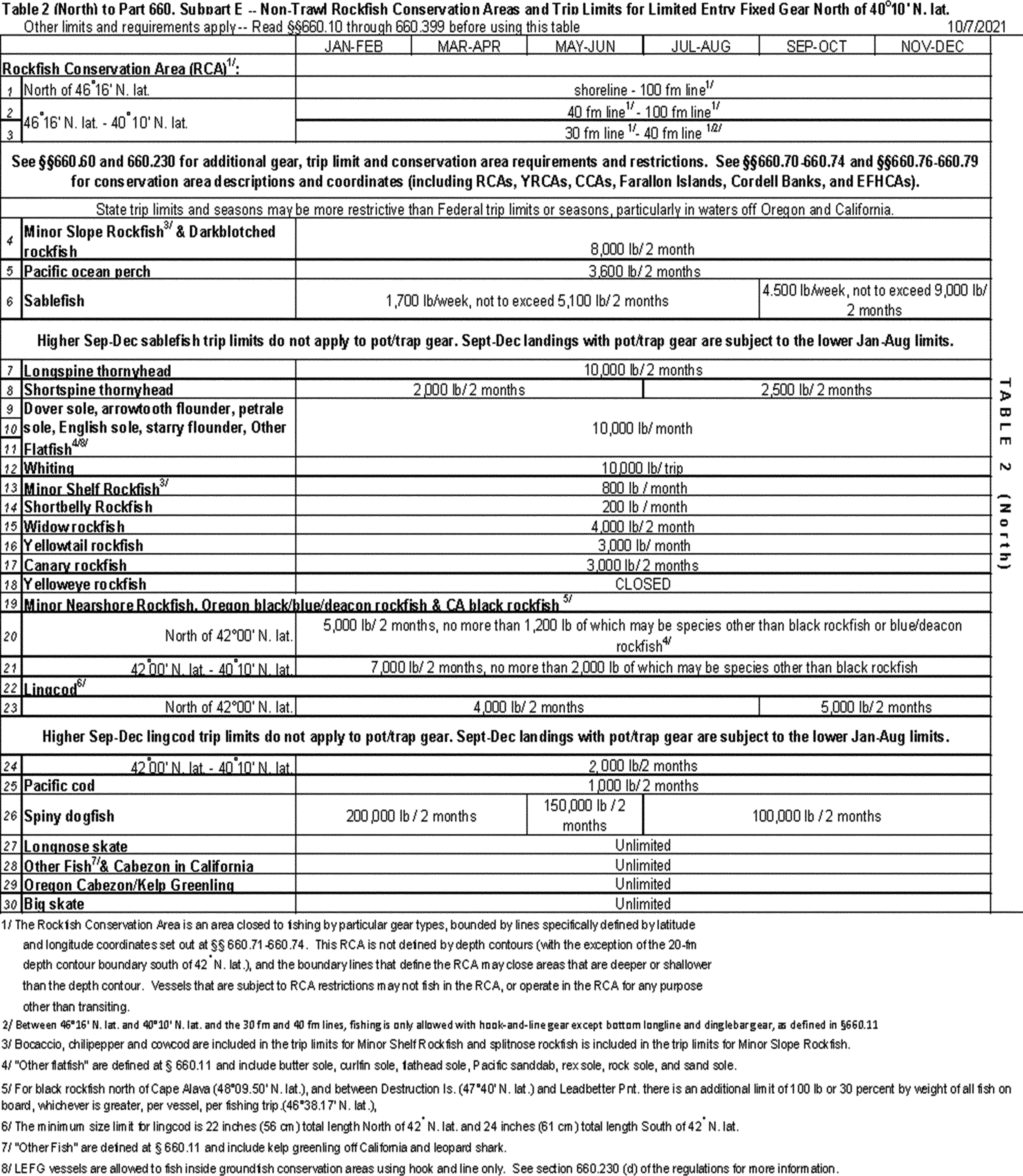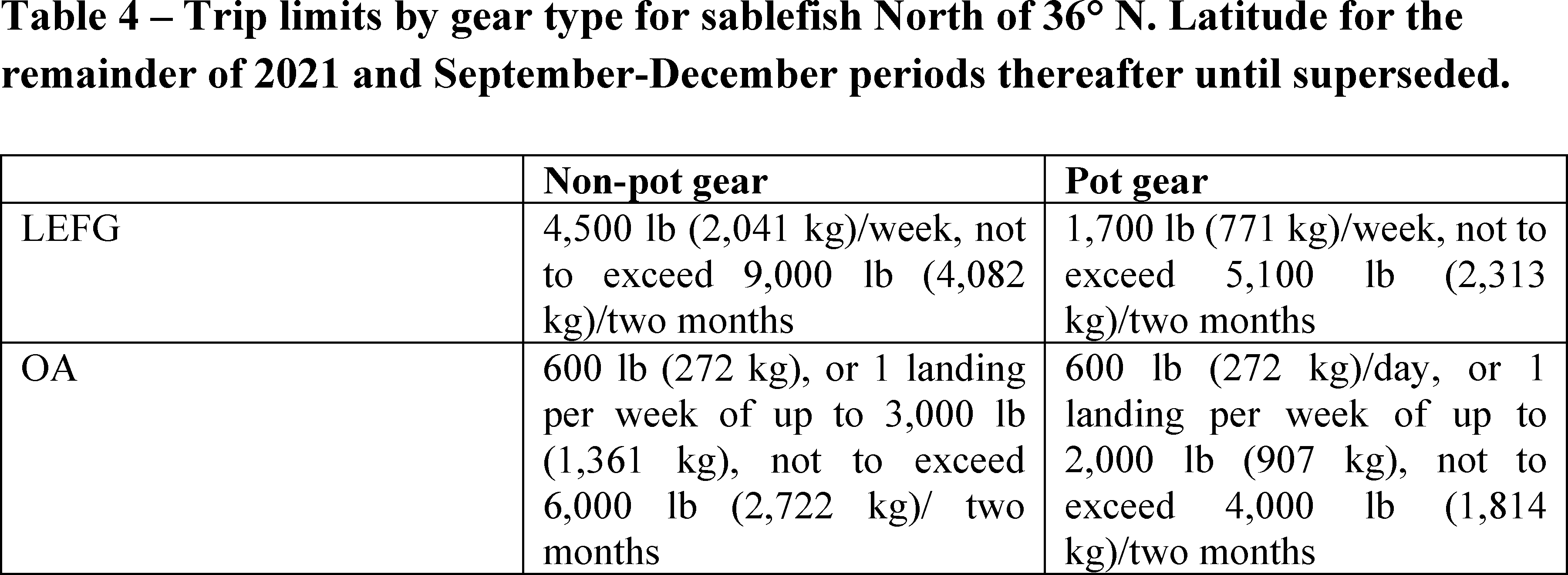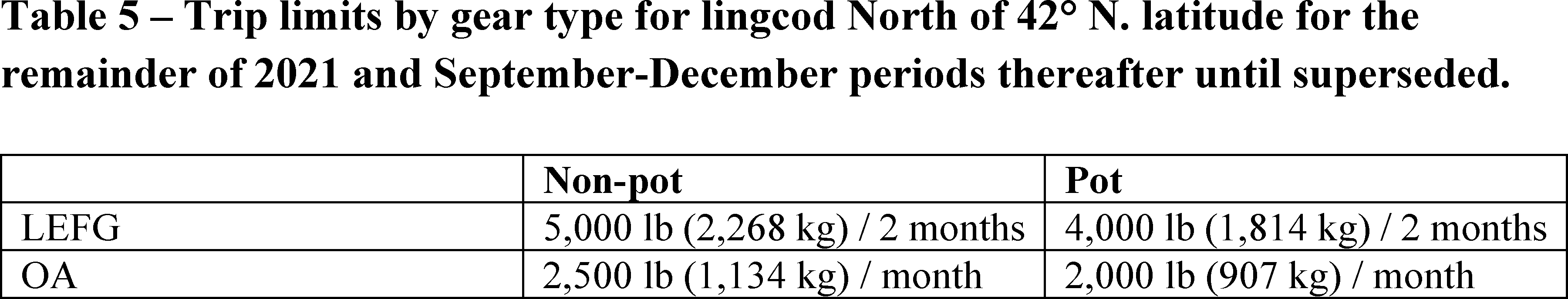 longline and other hook-and-line gears), in the LE and OA FG sablefish, DTL fisheries north of 36° N latitude, as well as the fixed gear lingcod fishery, north of 42° N latitude (LE and OA). Pot/trap gear cannot be used in the affected sectors to land up to the higher September through December trip limits for sablefish or lingcod, and vessels using pot/trap gear are instead subject to the lower January through August limits.
