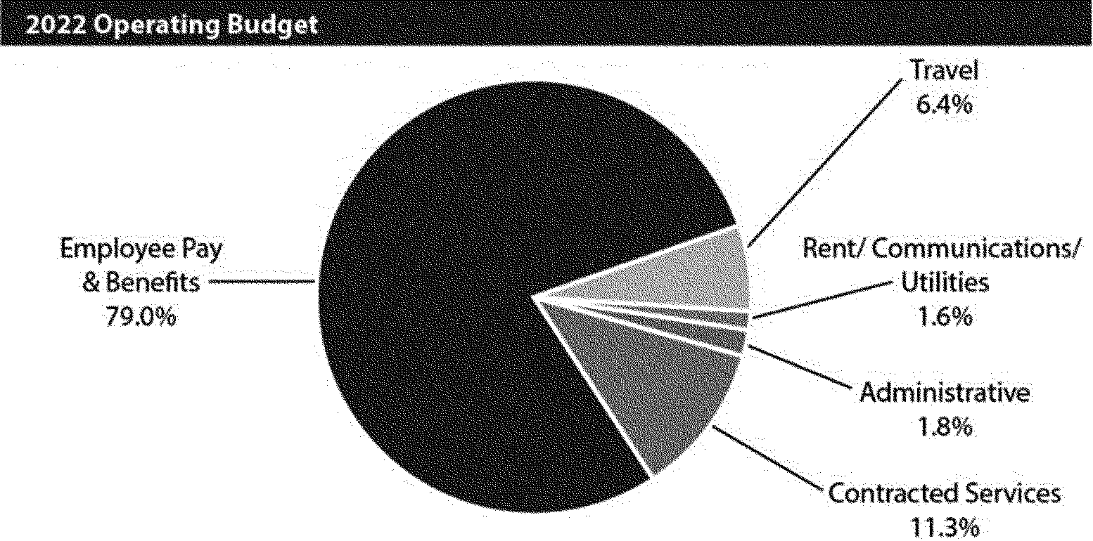 The 2022 Operating Budget increases approximately $11.4 million, or 3.6 percent, compared to the 2021 Board-approved budget. The Operating Budget estimate for 2023 is $369.3 million and includes eight additional FTEs compared to the 2022 proposed level.