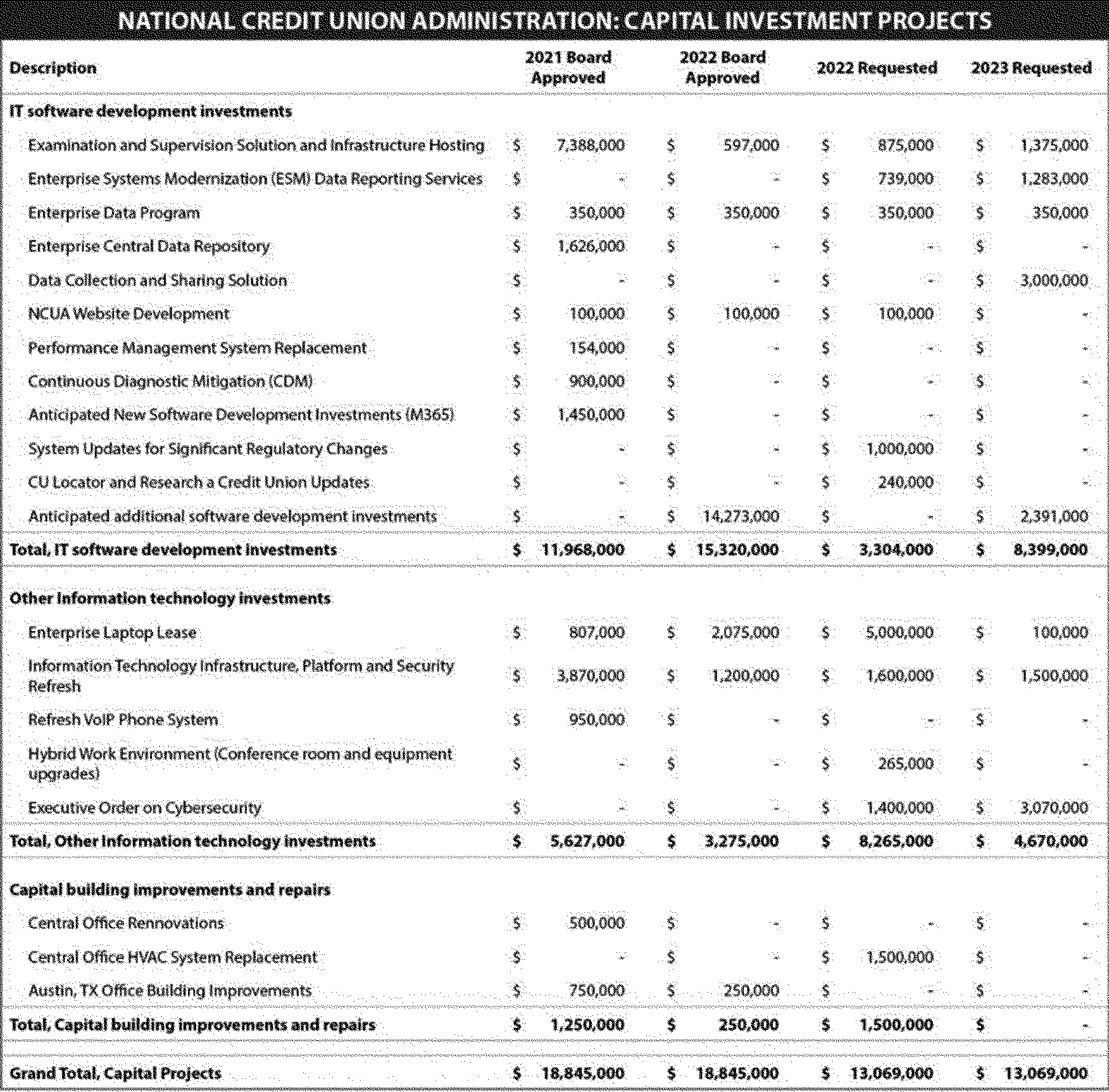 The Capital Budget fully supports the NCUA's effort to modernize its IT infrastructure and applications. The 2022 budget for capital projects decreases largely because of the deployment of MERIT, the replacement for the legacy Automated Integrated Regulatory Examination System (AIRES). Capital funding for MERIT in 2022 will fund bug fixes and other modest system enhancements. Other IT investments funded in the 2022 Capital Budget include the planned deployment of new laptops on the Windows 11 platform, ongoing enhancements and upgrades to decades-old legacy systems, network servers, and systems to ensure the agency's cybersecurity posture complies with Executive Order 14208, and various hardware investments to refresh agency networks and ensure staff have the tools necessary to achieve the agency's mission. The 2022 budget includes $3.3 million for IT software development projects that will continue replacement of the NCUA's decades-old and obsolete information technology systems, and $8.3 million in other IT investments for 2022. The NCUA's facilities require $1.5 million in capital investments.
