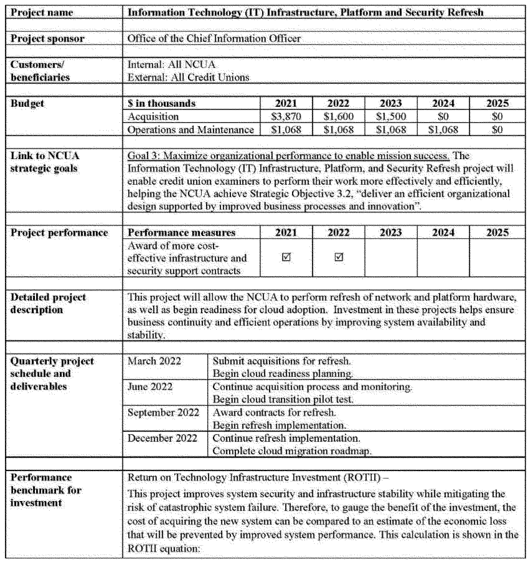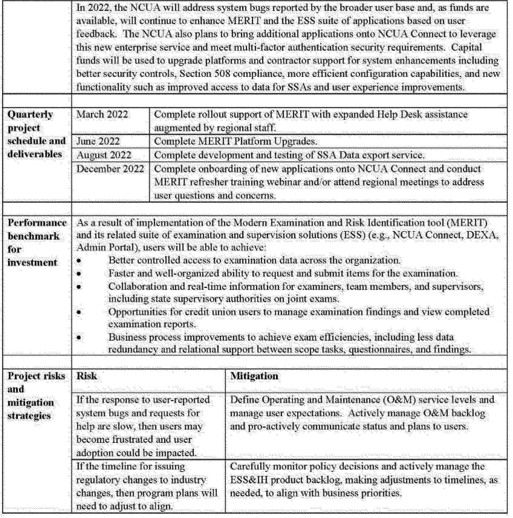 3. A proposed reduction to the Capital Budget of $5.8 million in 2022 compared to 2021, mainly driven by the completion of the latest phase of the Modern Examination and Risk Identification Tool (MERIT) project. In 2021, all NCUA examiners were trained to use the new MERIT system. MERIT was fully deployed to all NCUA examiners in the fall of 2021. In 2022, capital investments in Examination and Supervision Solution and Infrastructure Hosting (ESS&IH) will allow the NCUA to address rollout issues reported by the broader user base and continue to enhance MERIT and the ESS suite of applications based on user feedback.