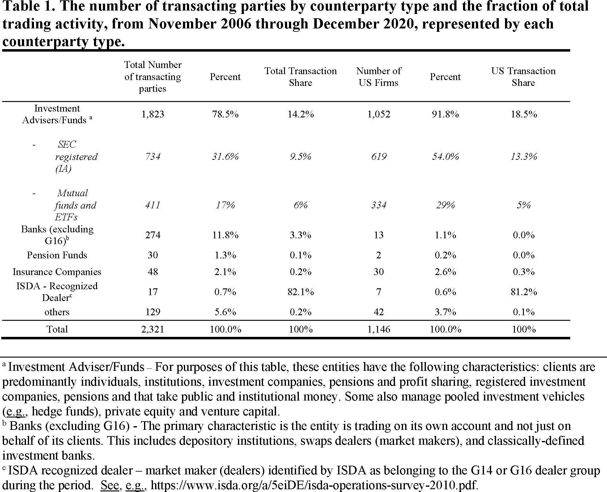 These 2,321 entities, which are presented in more detail in Table 1, below, include all DTCC-TIW-defined “firms” shown in DTCC-TIW as transaction counterparties that report at least one transaction to DTCC-TIW as of December 2017. The staff in the Division of Economic and Risk Analysis classified these firms, by machine-matching names to known third-party databases and by manual classification.