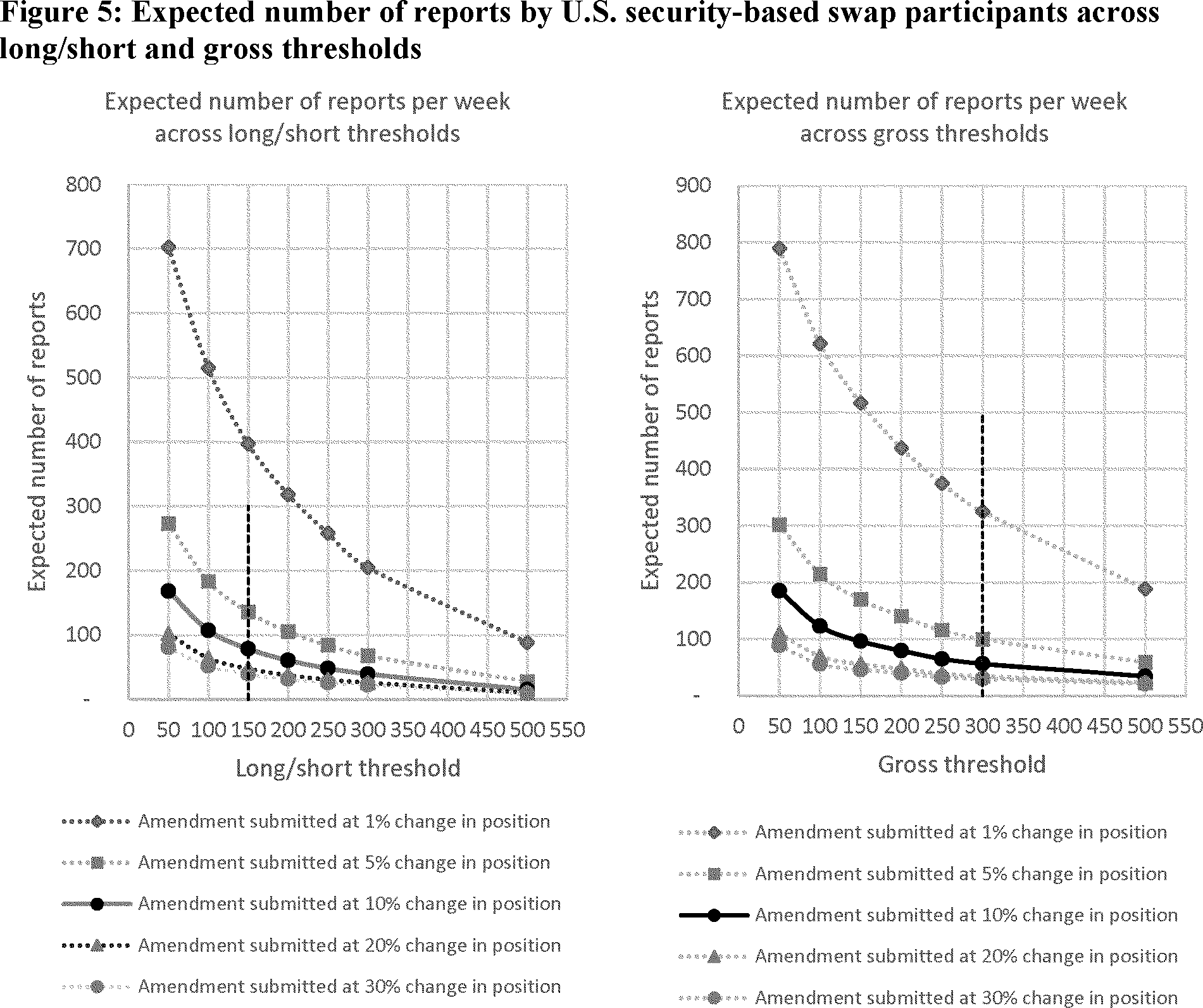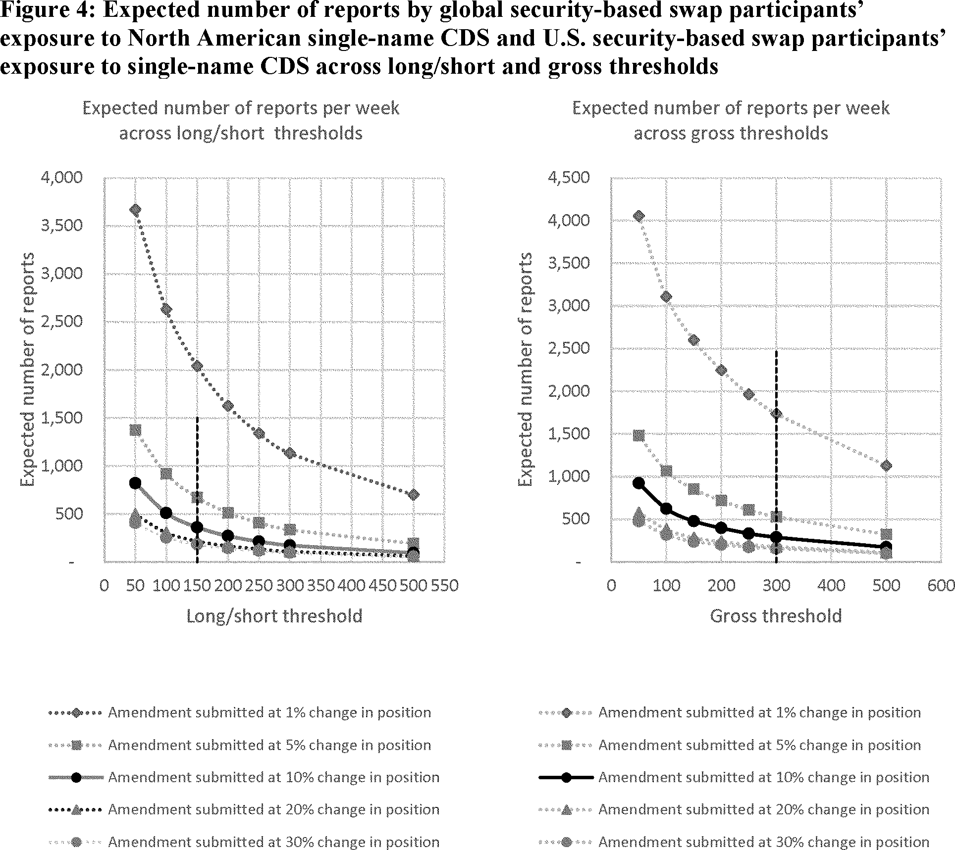 Commission staff considered all DTCC-TIW entities' aggregate weekly holdings across accounts all single-name CDS in 2020, for 52 weeks. Commission staff then assumed that the proposed reporting requirements from proposed Rule 10B-1 were implemented from the first week of 2020. For entities on an aggregate level, Commission staff then assessed the number of reports different potential reporting thresholds and weekly material changes would have. The analysis then aggregates the number of triggers for each firm's entire single-name CDS positions in 2020 across 52 weeks. For example, Figure 5, considers the following reporting net (left plot) and gross (right plot) thresholds listed on the x-axis: $50 million, $100 million, $150 million, $200 million, $250 million, $300 million and $500 million and material percentage change (lines at 1%, 5%, 10%, 20%, and 30%).