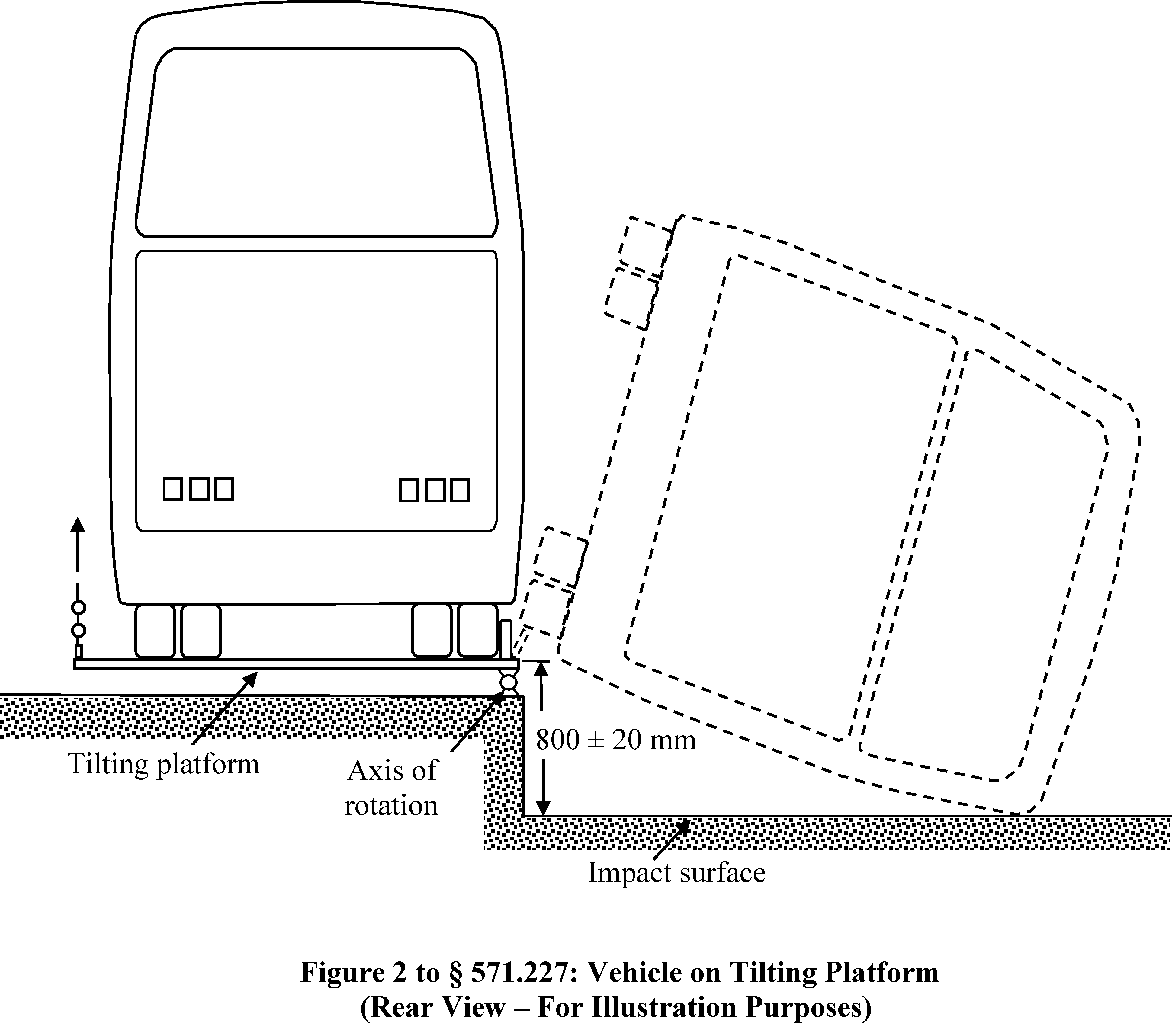 The test simulates a real-world rollover crash of a large bus. The test bus is placed on a tilting platform that is 800 mm (24 inches) above a smooth and level concrete surface. One side of the tilting platform along the length of the bus is raised at a steady rate of not more than 5 degrees/second until the vehicle becomes unstable, rolls off the platform, and impacts the concrete surface below. Some commenters to the August 6, 2014 notice of proposed rulemaking (NPRM) (79 FR 46090) thought that the test was too lenient, but NHTSA believes that those views are mistaken. As explained in this preamble, this test imparts severe crash forces that the buses must resist. FMVSS No. 227 prohibits any intrusion into the “survival space” by any part of the vehicle outside the survival space, except for minute objects weighing less than 15.0 grams, such as pebbles of glazing, or bolts and screws, which do not pose an unreasonable risk to safety for occupants.