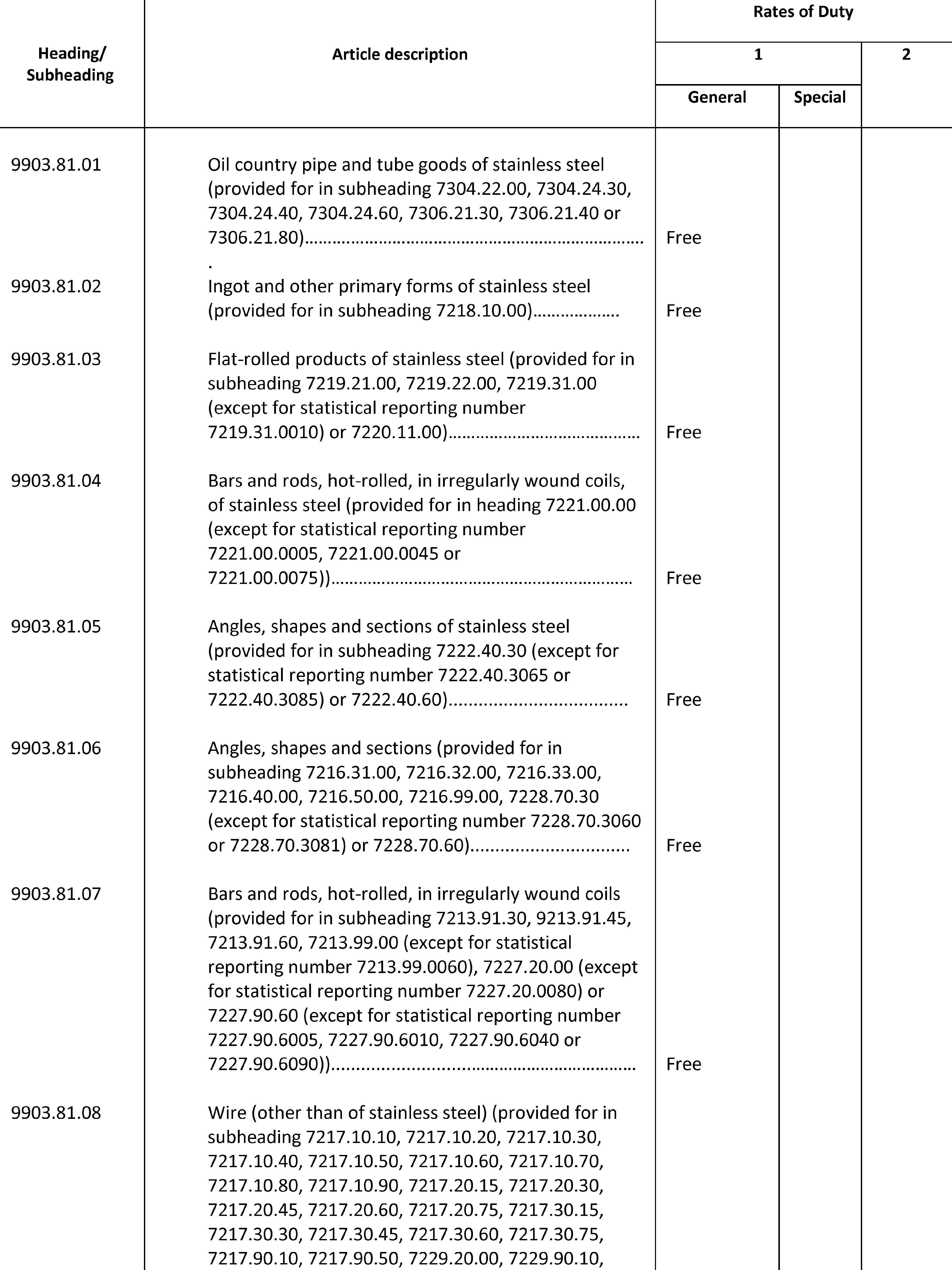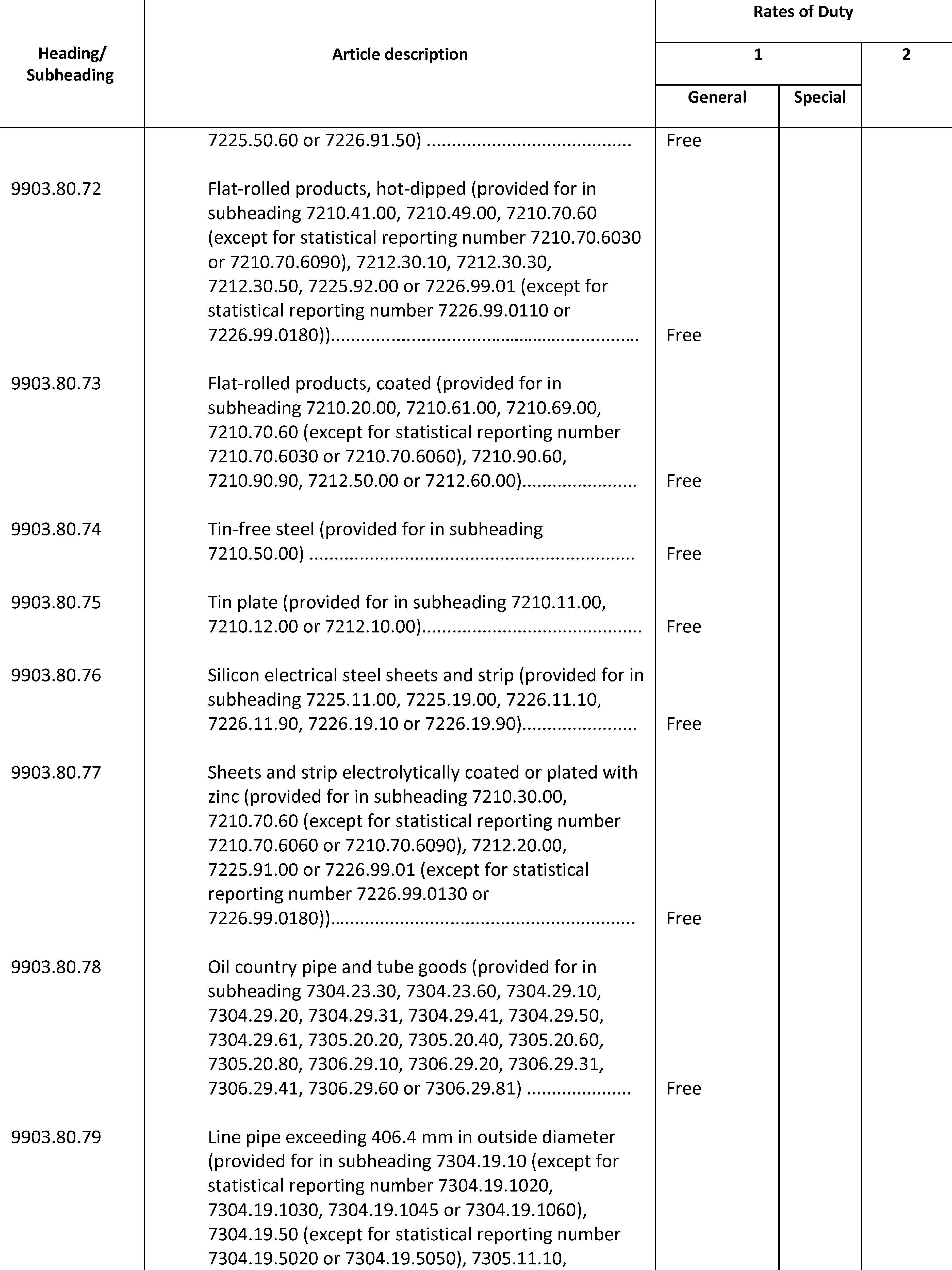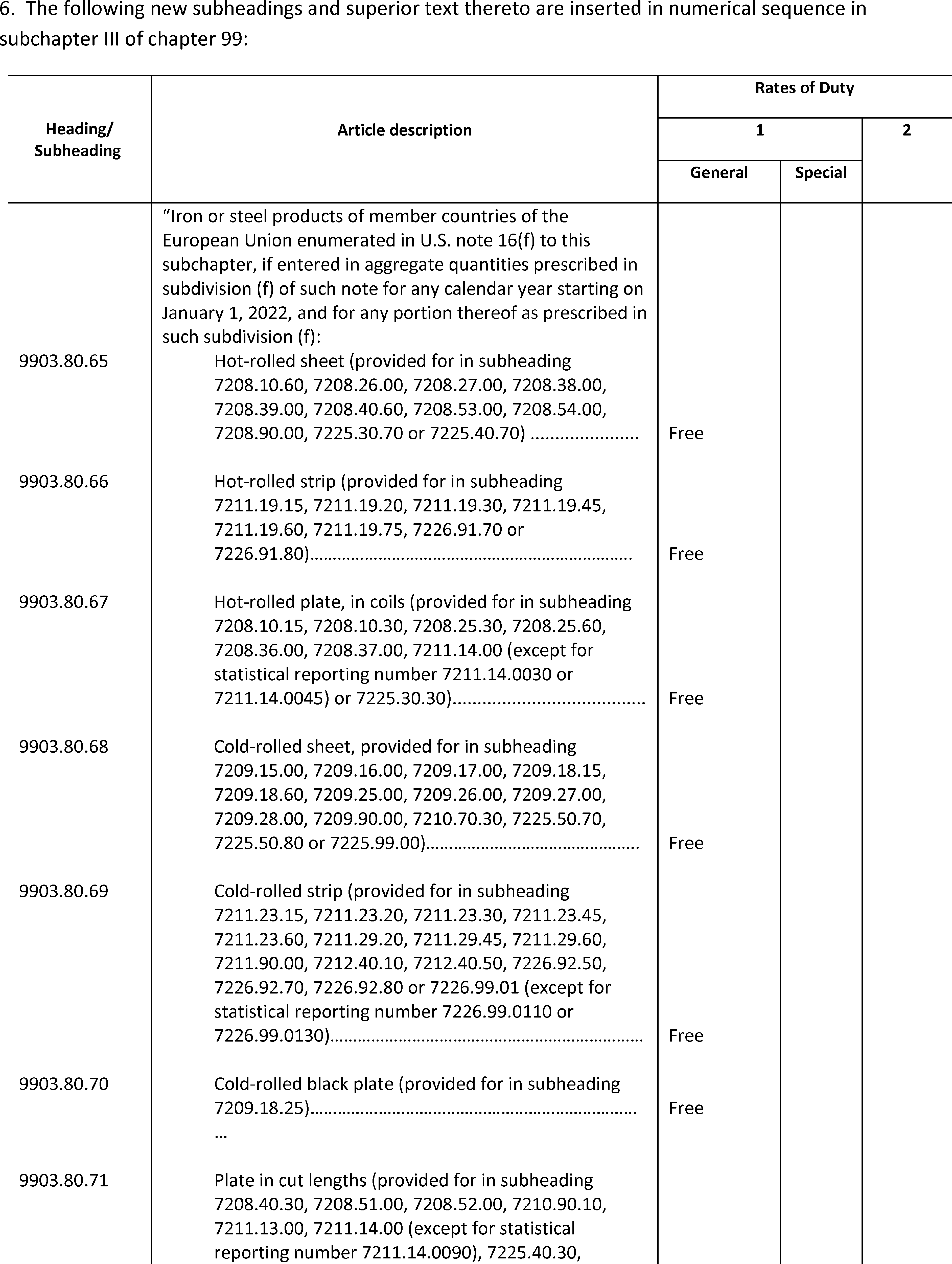 (b) Except as otherwise provided in this proclamation, or in notices published pursuant to clause 3 of this proclamation, all steel articles imports covered by heading 9903.80.01, in subchapter III of chapter 99 of the HTSUS, shall be subject to an additional 25 percent ad valorem rate of duty with respect to goods entered for consumption, or withdrawn from warehouse for consumption, as follows: (i) on or after 12:01 a.m. eastern daylight time on March 23, 2018, from all countries except Argentina, Australia, Brazil, Canada, Mexico, South Korea, and the member countries of the European Union; (ii) on or after 12:01 a.m. eastern daylight time on June 1, 2018, from all countries except Argentina, Australia, Brazil, and South Korea; (iii) on or after 12:01 a.m. eastern daylight time on August 13, 2018, from all countries except Argentina, Australia, Brazil, South Korea, and Turkey; (iv) on or after 12:01 a.m. eastern daylight time on May 20, 2019, from all countries except Argentina, Australia, Brazil, South Korea, and Turkey; (v) on or after 12:01 a.m. eastern daylight time on May 21, 2019, from all countries except Argentina, Australia, Brazil, Canada, Mexico, and South Korea; and (vi) on or after 12:01 a.m. eastern standard time on January 1, 2022, from all countries except Argentina, Australia, Brazil, Canada, Mexico, and South Korea, and except the member countries of the European Union through 11:59 p.m. eastern standard time on December 31, 2023, for steel articles covered by headings 9903.80.65 through 9903.81.19, inclusive. Further, except as otherwise provided in notices published pursuant to clause 3 of this proclamation, all steel articles imports from Turkey covered by heading 9903.80.02, in subchapter III of chapter 99 of the HTSUS, shall be subject to a 50 percent ad valorem rate of duty with respect to goods entered for consumption, or withdrawn from warehouse for consumption, on or after 12:01 a.m. eastern daylight time on August 13, 2018, and prior to 12:01 a.m. eastern daylight time on May 21, 2019. All steel articles imports covered by heading 9903.80.61, in subchapter III of chapter 99 of the HTSUS, shall be subject to the additional 25 percent ad valorem rate of duty established herein with respect to goods entered for consumption, or withdrawn from warehouse for consumption, on or after 12:01 a.m. eastern time on the date specified in a determination by the Secretary granting relief. These rates of duty, which are in addition to any other duties, fees, exactions, and charges applicable to such imported steel articles, shall apply to imports of steel articles from each country as specified in the preceding three sentences”.