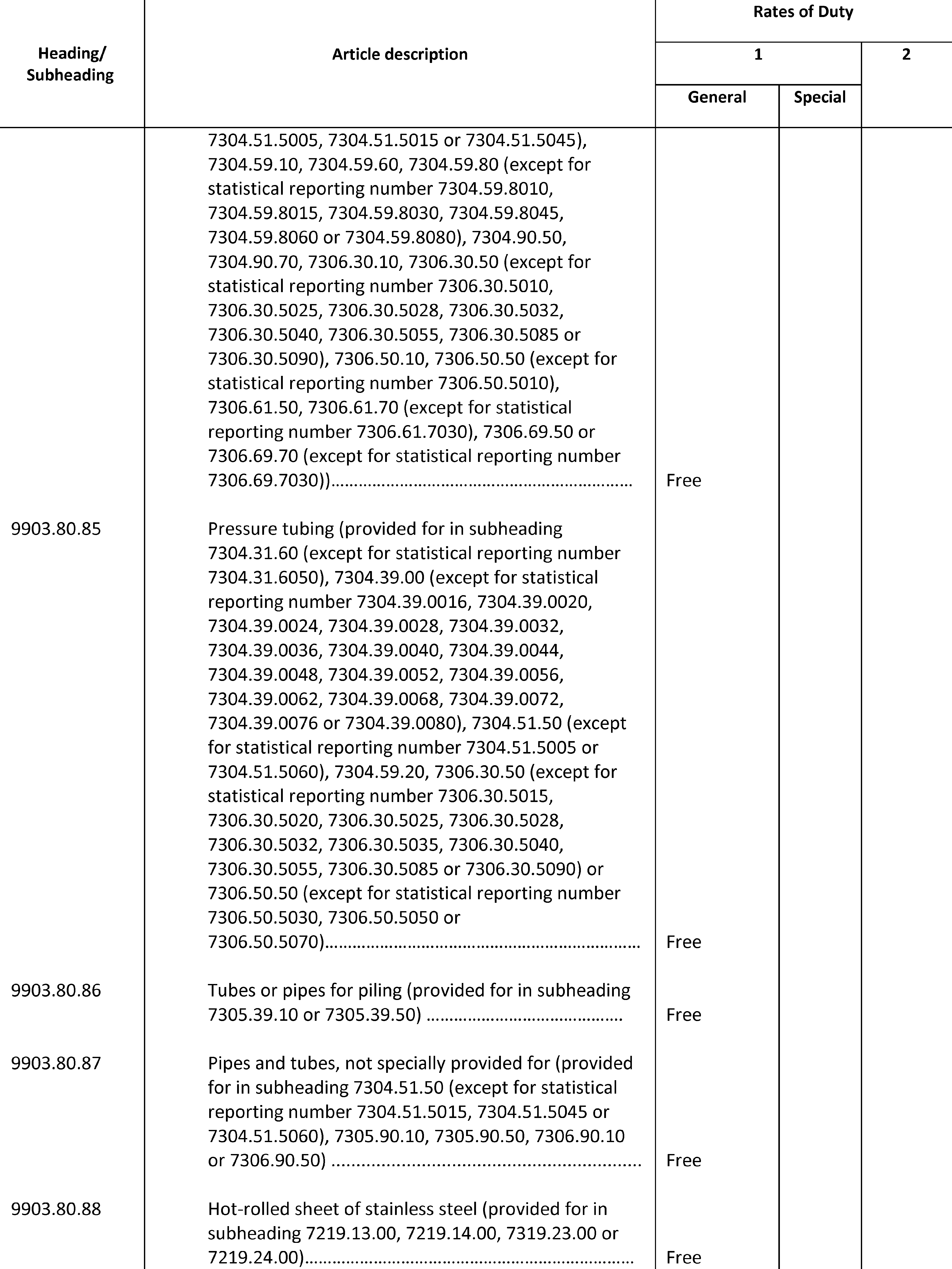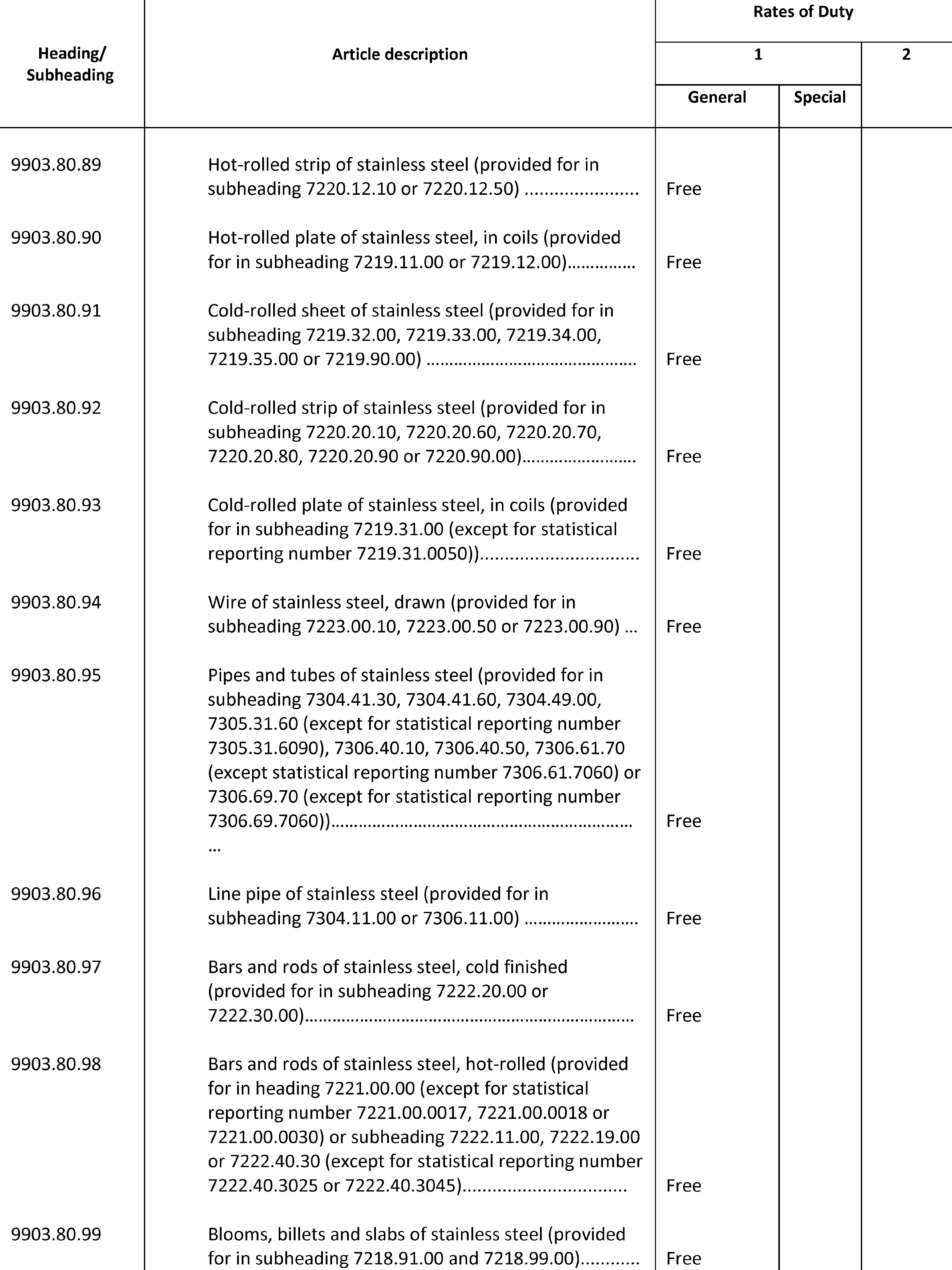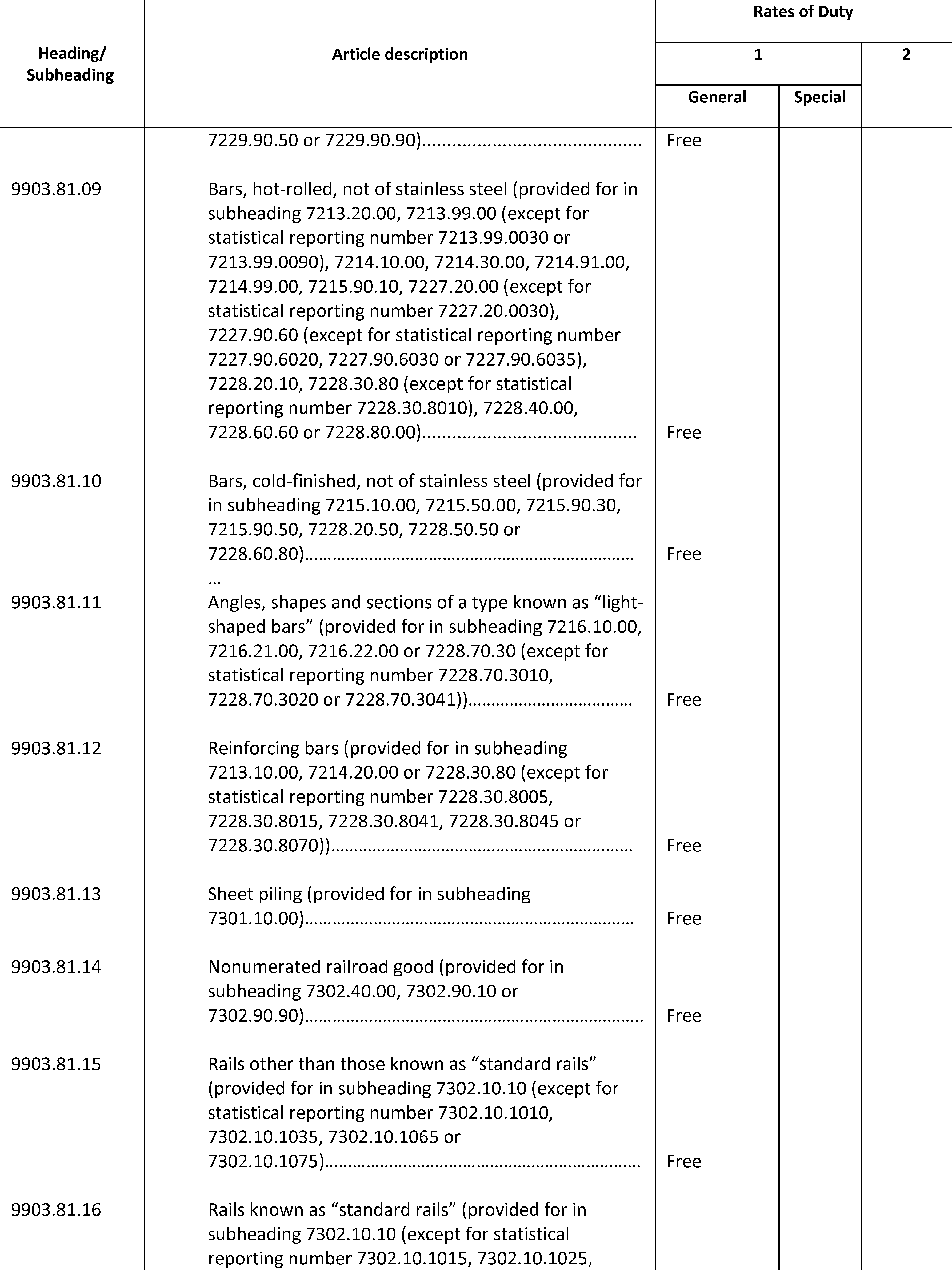 (b) Except as otherwise provided in this proclamation, or in notices published pursuant to clause 3 of this proclamation, all steel articles imports covered by heading 9903.80.01, in subchapter III of chapter 99 of the HTSUS, shall be subject to an additional 25 percent ad valorem rate of duty with respect to goods entered for consumption, or withdrawn from warehouse for consumption, as follows: (i) on or after 12:01 a.m. eastern daylight time on March 23, 2018, from all countries except Argentina, Australia, Brazil, Canada, Mexico, South Korea, and the member countries of the European Union; (ii) on or after 12:01 a.m. eastern daylight time on June 1, 2018, from all countries except Argentina, Australia, Brazil, and South Korea; (iii) on or after 12:01 a.m. eastern daylight time on August 13, 2018, from all countries except Argentina, Australia, Brazil, South Korea, and Turkey; (iv) on or after 12:01 a.m. eastern daylight time on May 20, 2019, from all countries except Argentina, Australia, Brazil, South Korea, and Turkey; (v) on or after 12:01 a.m. eastern daylight time on May 21, 2019, from all countries except Argentina, Australia, Brazil, Canada, Mexico, and South Korea; and (vi) on or after 12:01 a.m. eastern standard time on January 1, 2022, from all countries except Argentina, Australia, Brazil, Canada, Mexico, and South Korea, and except the member countries of the European Union through 11:59 p.m. eastern standard time on December 31, 2023, for steel articles covered by headings 9903.80.65 through 9903.81.19, inclusive. Further, except as otherwise provided in notices published pursuant to clause 3 of this proclamation, all steel articles imports from Turkey covered by heading 9903.80.02, in subchapter III of chapter 99 of the HTSUS, shall be subject to a 50 percent ad valorem rate of duty with respect to goods entered for consumption, or withdrawn from warehouse for consumption, on or after 12:01 a.m. eastern daylight time on August 13, 2018, and prior to 12:01 a.m. eastern daylight time on May 21, 2019. All steel articles imports covered by heading 9903.80.61, in subchapter III of chapter 99 of the HTSUS, shall be subject to the additional 25 percent ad valorem rate of duty established herein with respect to goods entered for consumption, or withdrawn from warehouse for consumption, on or after 12:01 a.m. eastern time on the date specified in a determination by the Secretary granting relief. These rates of duty, which are in addition to any other duties, fees, exactions, and charges applicable to such imported steel articles, shall apply to imports of steel articles from each country as specified in the preceding three sentences”.