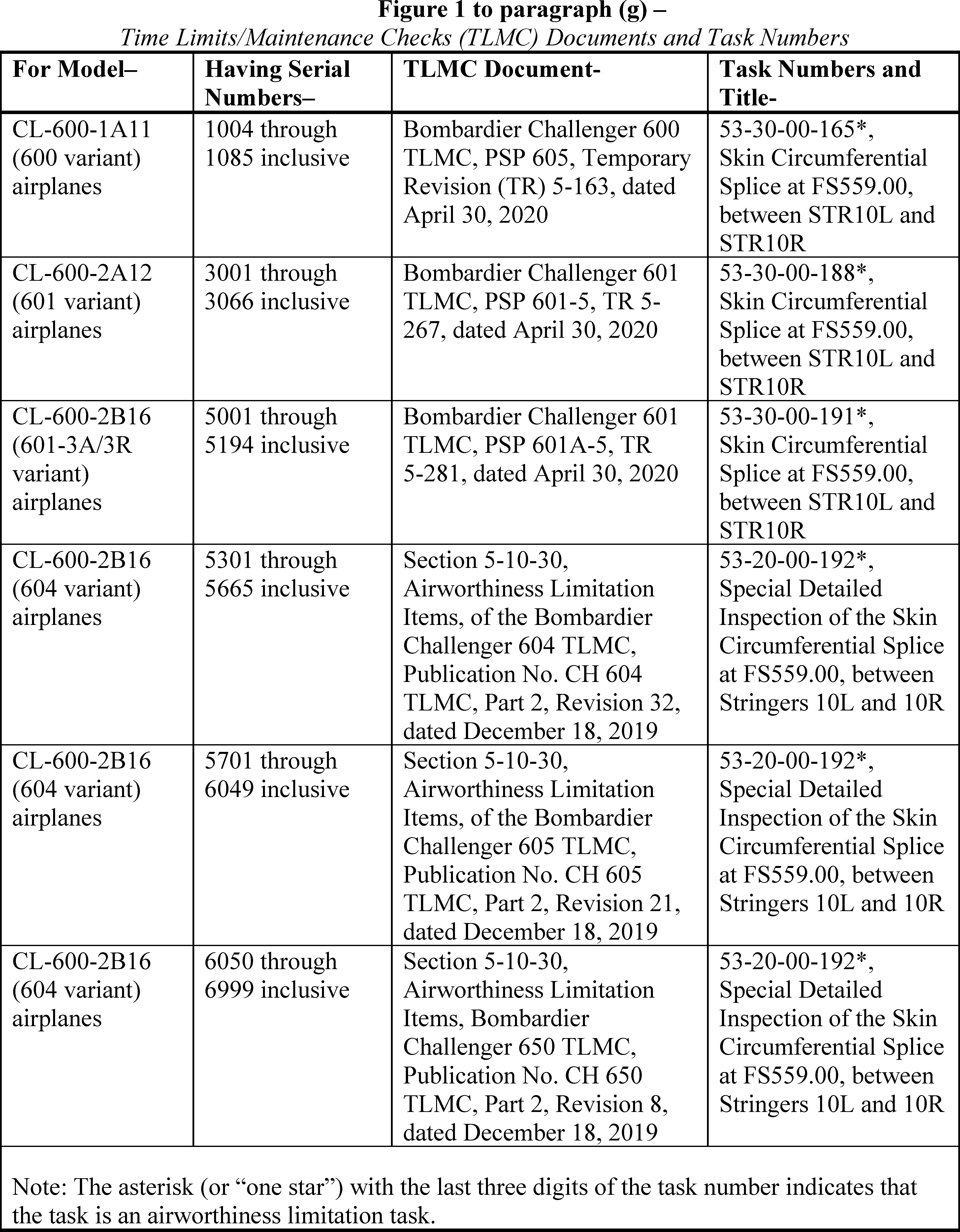 Bombardier Challenger 600 Time Limits/Maintenance Checks (TLMC), Product Support Publication (PSP) 605, Temporary Revision (TR) 5-163, dated April 30, 2020, which includes Task 53-30-00-165*, “Skin Circumferential Splice at FS559.00, between STR10L and STR10R.”