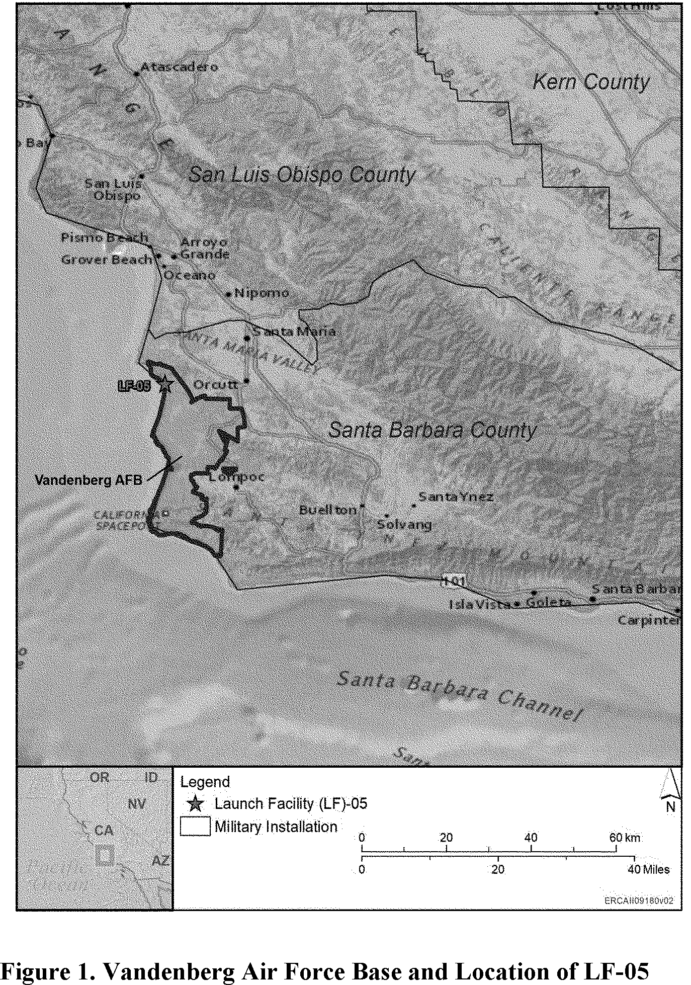 ]) of central Santa Barbara County, California (Figure 1), approximately halfway between San Diego and San Francisco. The base includes 42 miles (mi.) (68 km) of coastline with a variety of natural communities, including beaches, coastal salt marshes, rocky intertidal, kelp forests, and hard and soft bottom substrates. ERCA II would be installed at LF-05 which is an existing deactivated launch facility located on the northern end of VAFB, 4.5 mi. (7.2 km) southeast of Point Sal. The site is located approximately 400 meters (m) from the cliffs, beach, and rocky shoreline. Test activities would require firing non-explosive projectiles over the Pacific Ocean with splash-down locations for the projectiles and components of the projectiles at distances ranging from the shoreline to approximately 1,180 mi (1,900 km) from the shoreline of VAFB, onto and beyond the PMSR. The PMSR is 36,000-square-miles (93,200 km2