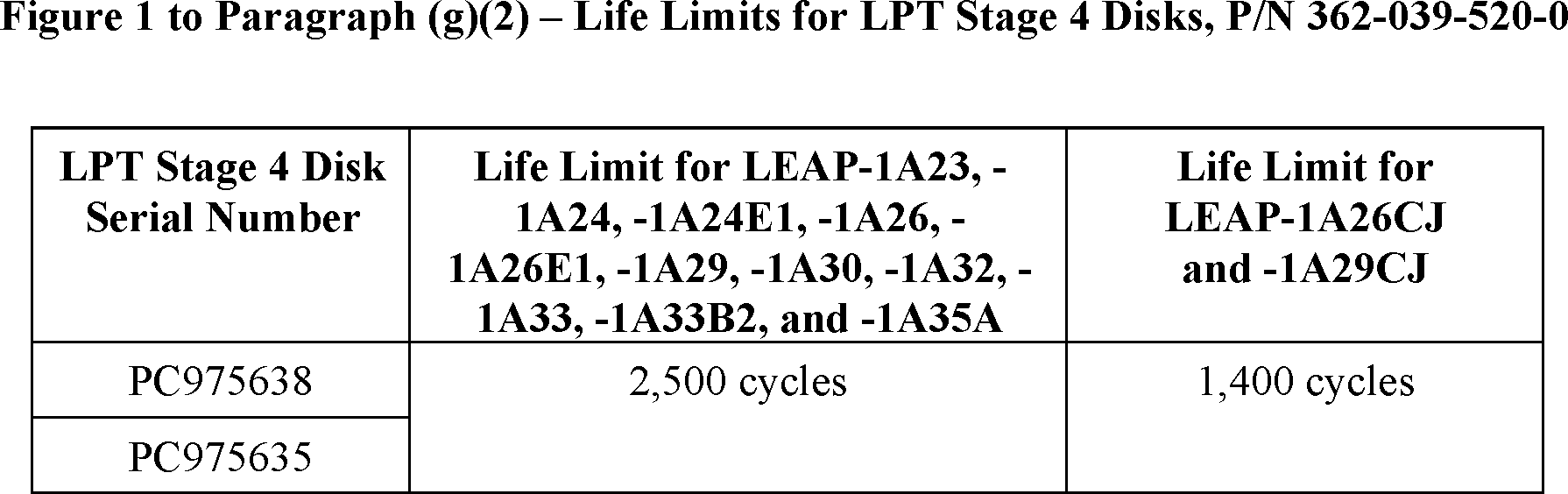 (2) Before the LPT stage 4 disk, P/N 362-039-520-0, with serial numbers identified in Figure 1 to paragraph (g)(2) of this AD (Figure 1) accumulates the cycles in Figure 1, or within 100 cycles after the effective date of this AD, whichever occurs later, remove the affected LPT stage 4 disk from service and replace with a part eligible for installation.