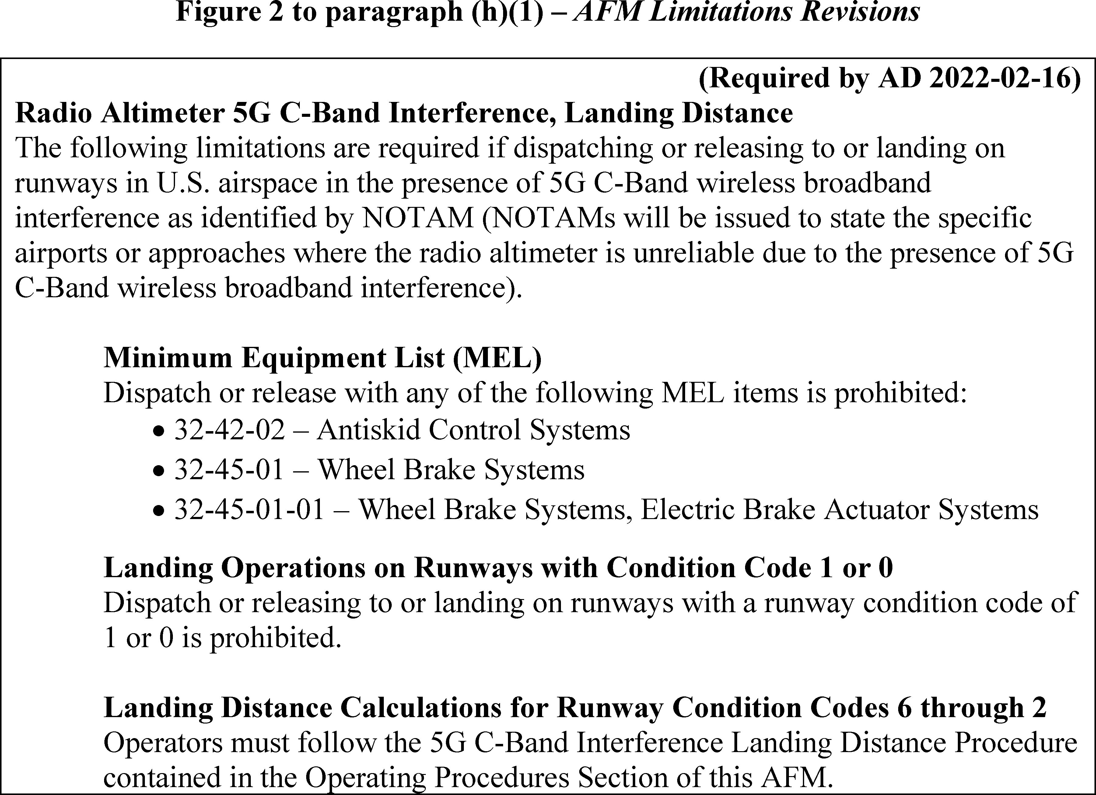 This AD mandates procedures for operators to account for this longer landing distance, for all runway conditions, in the presence of 5G C-Band interference as identified by NOTAM. It prohibits operators from dispatching or releasing airplanes to affected airports when certain braking and anti-skid functions on the airplane are inoperable. It also prohibits operators from dispatching or releasing airplanes to, or landing on, runways with condition codes 1 and 0.
