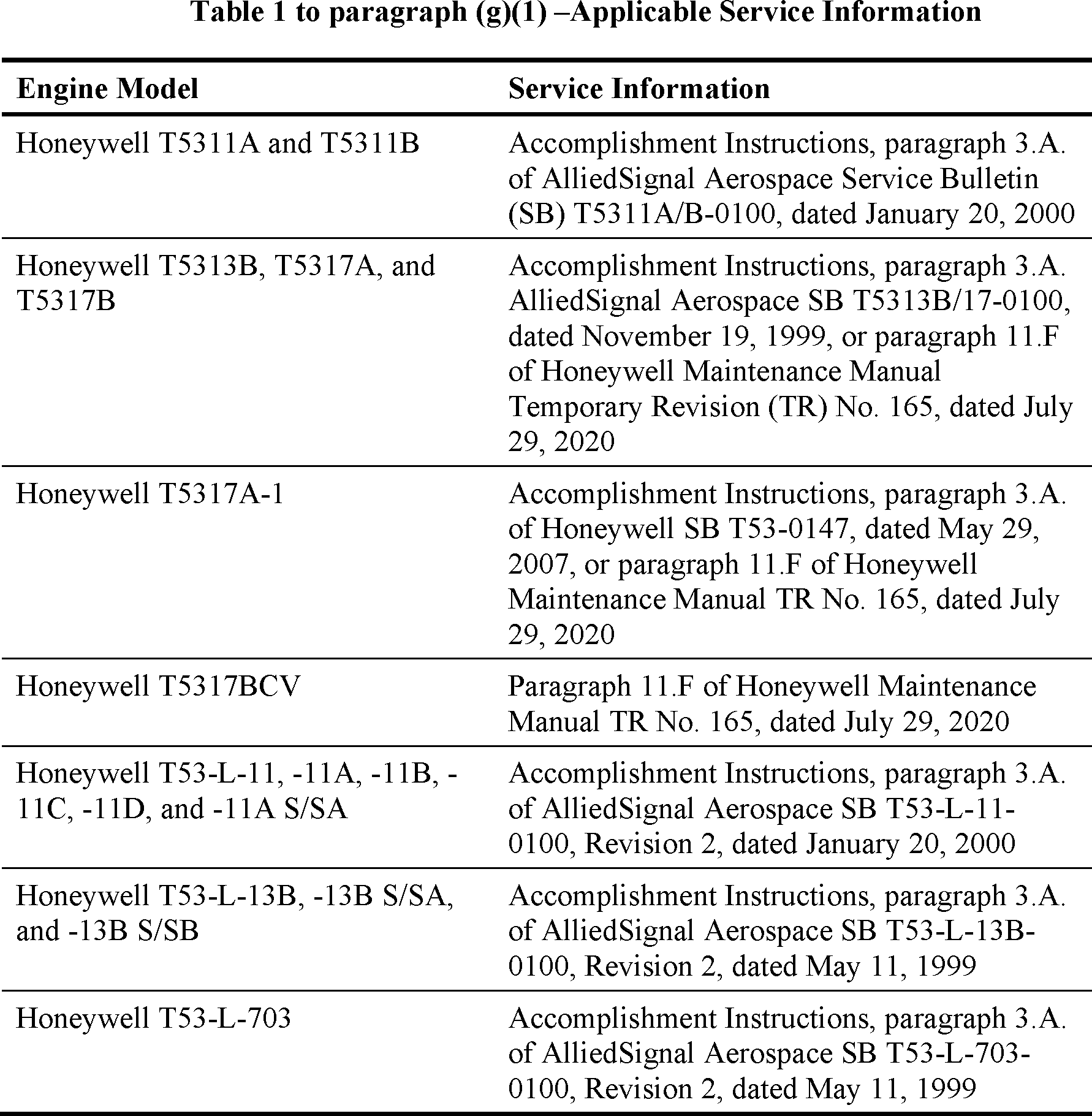 The Director of the Federal Register approved AlliedSignal Aerospace SB T5313B/17-0100, dated November 19, 1999; AlliedSignal Aerospace SB T53-L-13B-0100, Revision 2, dated May 11, 1999; AlliedSignal Aerospace SB T53-L-703-0100, Revision 2, dated May 11, 1999; AlliedSignal Aerospace SB T5311A/B-0100, dated January 20, 2000; and AlliedSignal Aerospace SB T53-L-11-0100, Revision 2, dated January 20, 2000, for incorporation by reference as of March 21, 2002 (67 FR 6857, February 14, 2002). This service information is reasonably available because the interested parties have access to it through their normal course of business or by the means identified in