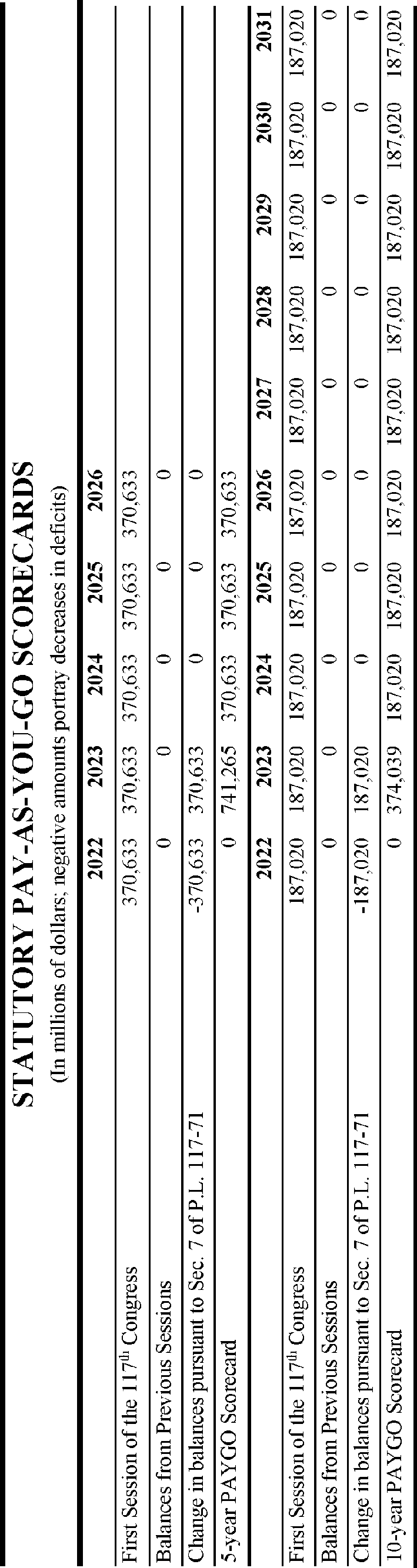 The 5-year and 10-year PAYGO scorecards for the first session of the 117th Congress began with balances of zero in each year because Section 1401(d) of Public Law 116-260 set each year of the scorecards to zero at the end of the second session of the 116th Congress. Laws enacted during the first session of the 117th Congress created balances on the 5- and 10-year scorecards of $370,633 million and $187,020 million in each year, respectively. Public Law 117-71 shifted the fiscal year 2022 debits on both scorecards to fiscal year 2023. Therefore, the 2022 balance on both the 5- and 10-year scorecards is zero and the 2023 balances on the 5- and 10-year scorecards are $741,265 million and $374,039 million, respectively. The debit for the remaining years on the 5-year scorecard, 2024-2026, is $370,633 million per year and the debit for the remaining years on the 10-year scorecard, 2024-2031, is $187,020 million per year.