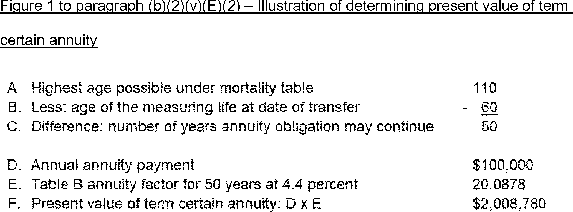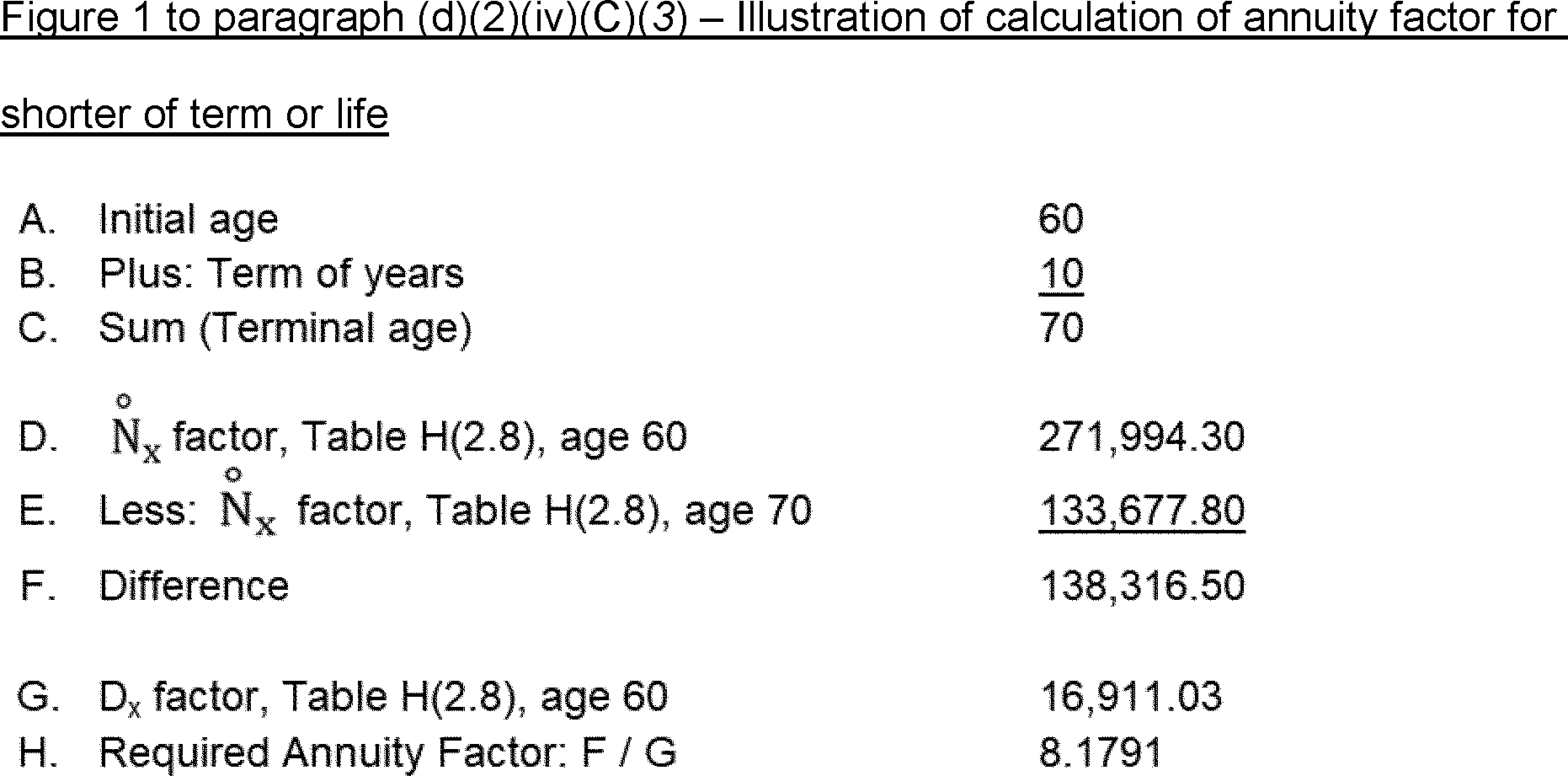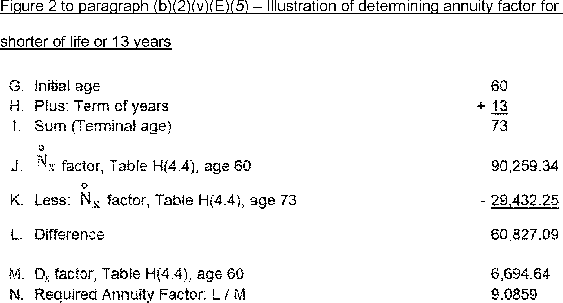 5) The actuarial factor for determining the value of the annuity of $52,910.48 per year payable for 13 years or until the prior death of a person aged 60 is derived by the use of factors involving one life and a term of years, derived from Table H. The factor is determined as illustrated in Figure 2 to this paragraph (b)(2)(v)(E)(