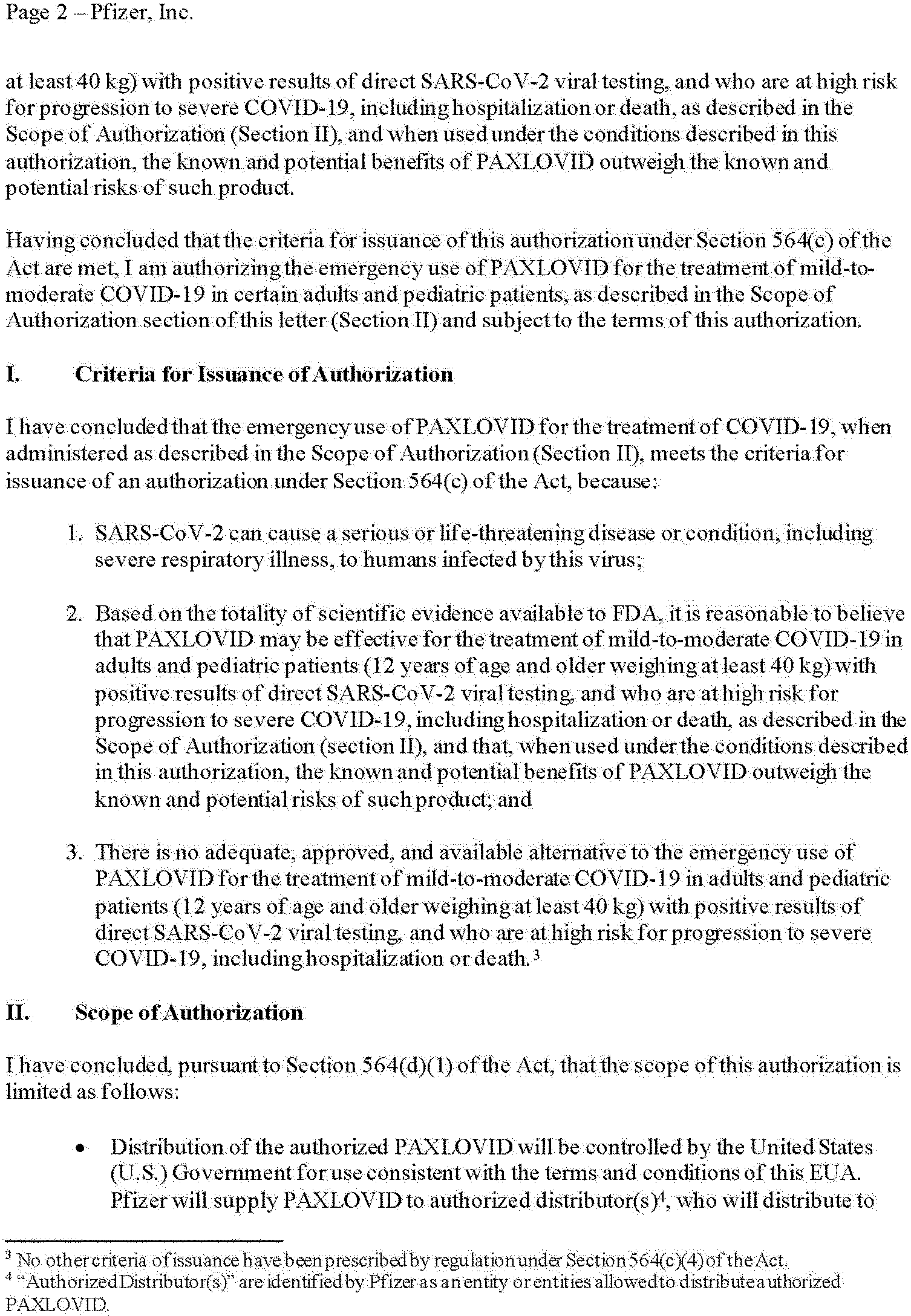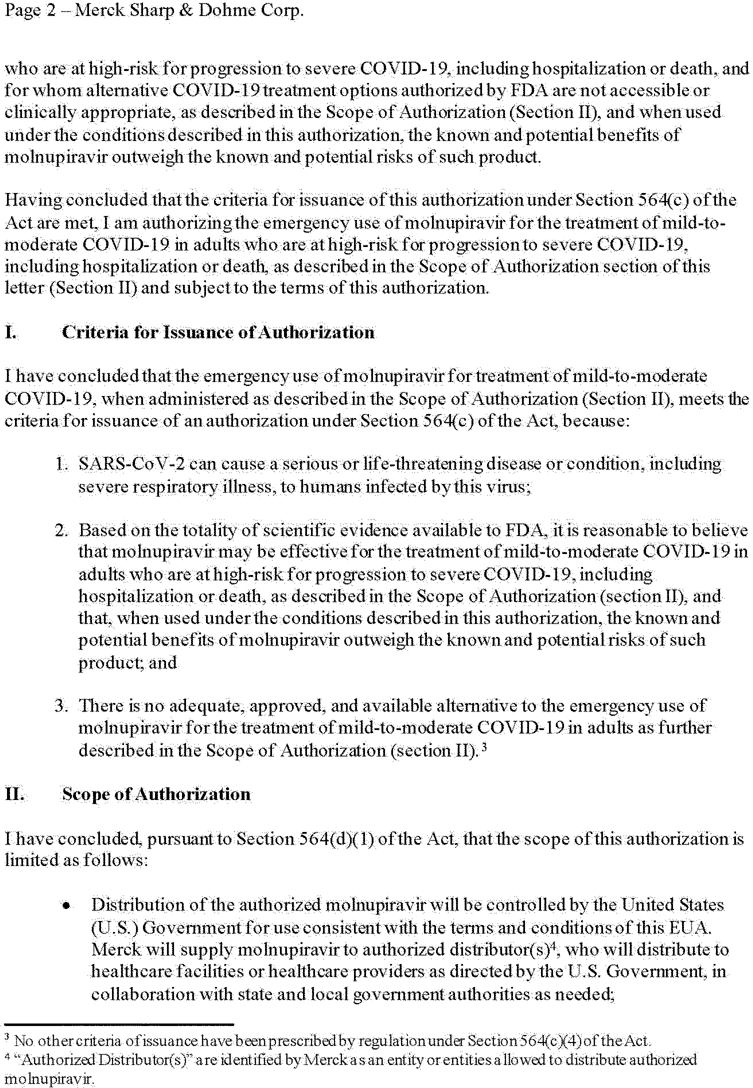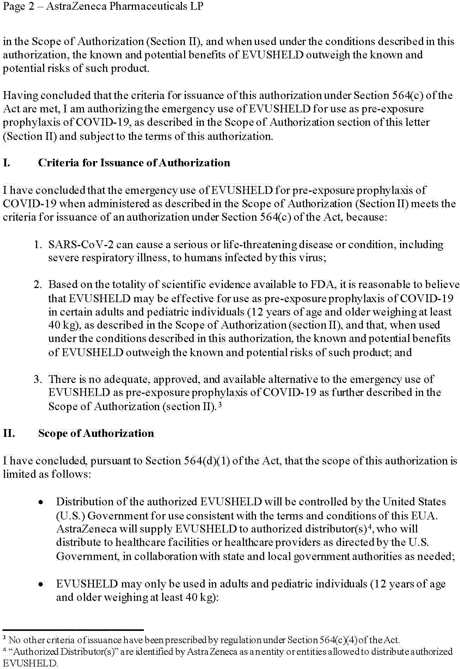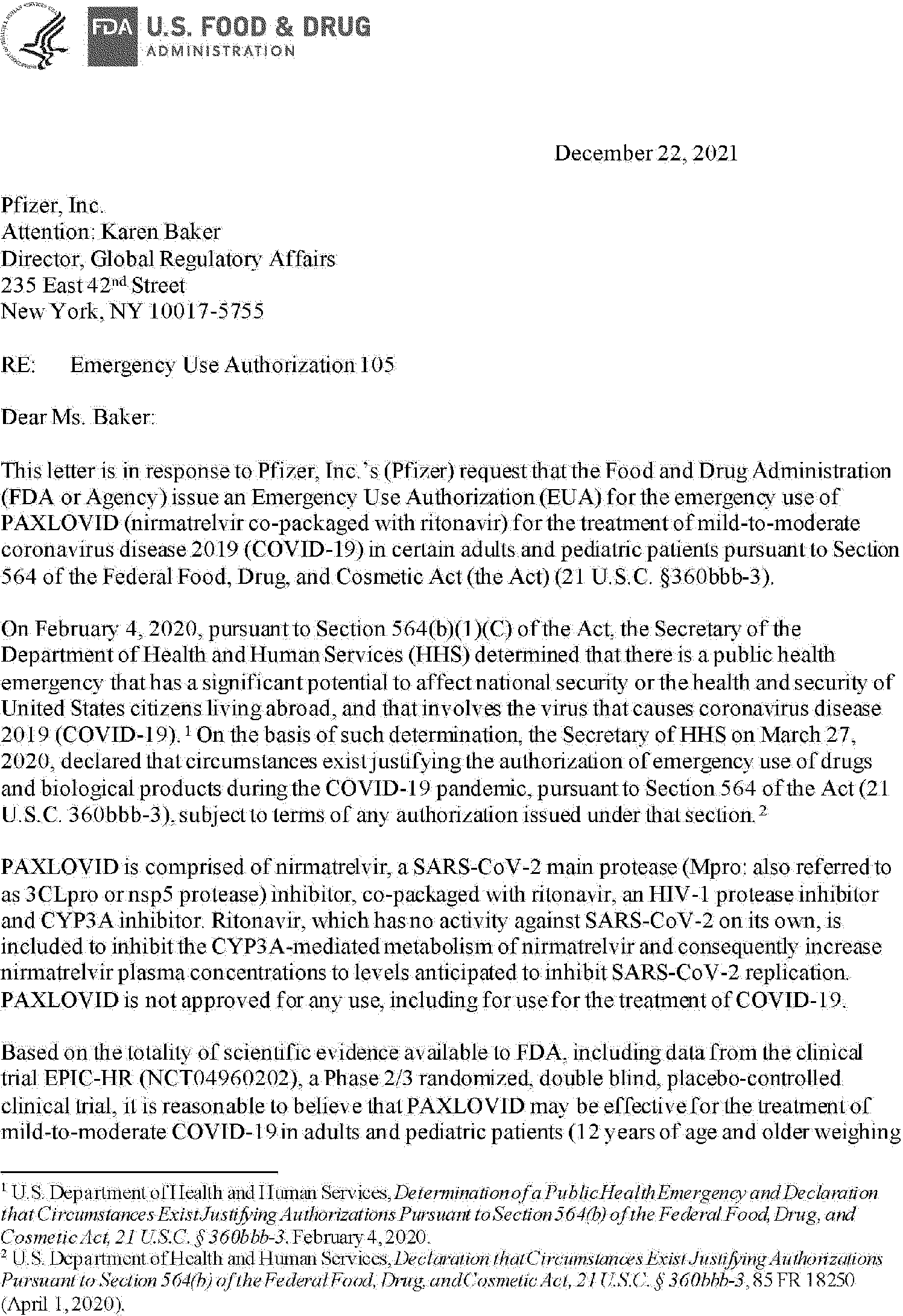 on April 1, 2020 (85 FR 18250). Having concluded that the criteria for issuance of the Authorizations under section 564(c) of the FD&C Act are met, FDA has issued three authorizations for the emergency use of drugs and biological products during the COVID-19 pandemic. On December 8, 2021, FDA issued an EUA to AZ for the biological product EVUSHELD (tixagevimab co-packaged with cilgavimab), subject to the terms of the Authorization. On December 22, 2021, FDA issued an EUA to Pfizer for the drug PAXLOVID (nirmatrelvir co-packaged with ritonavir), subject to the terms of the Authorization. On December 23, 2021, FDA issued an EUA to Merck for the drug molnupiravir, subject to the terms of the Authorization. The initial Authorizations, which are included below in their entirety after section IV of this document (not including the authorized versions of the fact sheets and other written materials), provide an explanation of the reasons for issuance, as required by section 564(h)(1) of the FD&C Act. Any subsequent reissuances of these Authorizations can be found on FDA's web page at: