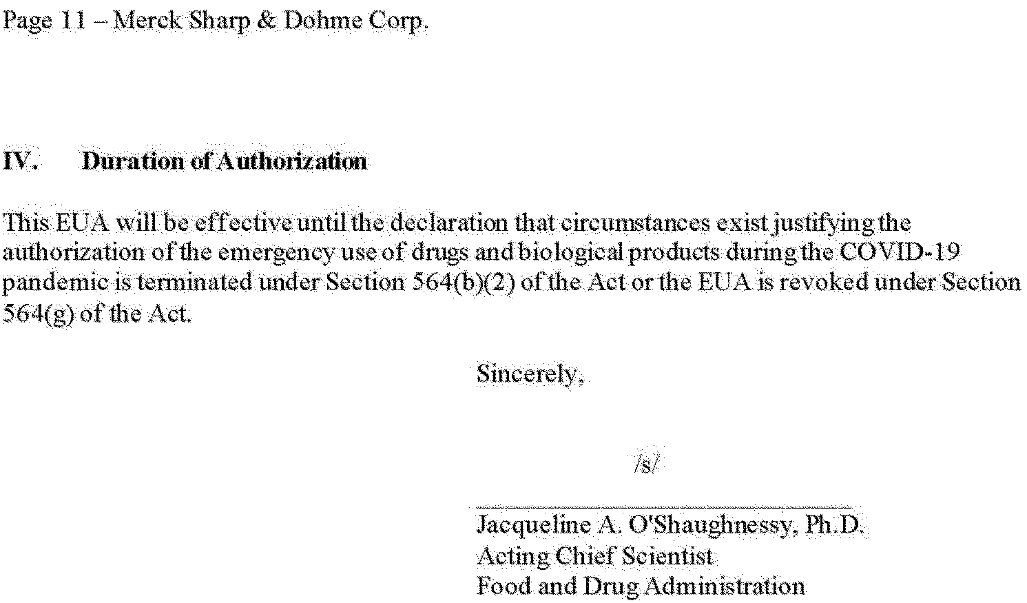 The Food and Drug Administration (FDA) is announcing the issuance of three Emergency Use Authorizations (EUAs) (the Authorizations) under the Federal Food, Drug, and Cosmetic Act (FD&C Act), for use during the COVID-19 pandemic. FDA has issued one Authorization for a biological product as requested by AstraZeneca Pharmaceuticals LP (AZ), one Authorization for a drug product as requested by Pfizer, Inc. (Pfizer), and one Authorization for a drug product as requested by Merck Sharp & Dohme Corp. (Merck). The Authorizations contain, among other things, conditions on the emergency use of the authorized products. The Authorizations follow the February 4, 2020, determination by the Secretary of Health and Human Services (HHS) that there is a public health emergency that has a significant potential to affect national security or the health and security of U.S. citizens living abroad and that involves a novel (new) coronavirus. The virus, now named SARS-CoV-2, causes the illness COVID-19. On the basis of such determination, the Secretary of HHS declared on March 27, 2020, that circumstances exist justifying the authorization of emergency use of drugs and biological products during the COVID-19 pandemic, pursuant to the FD&C Act, subject to the terms of any authorization issued under that section. The Authorizations, which include an explanation of the reasons for issuance, are reprinted in this document.