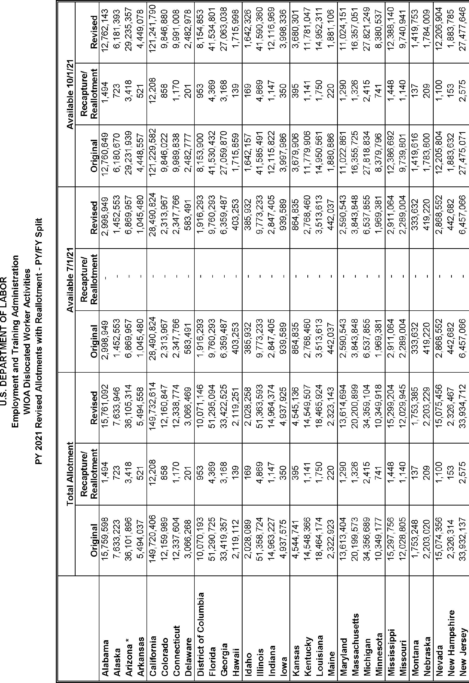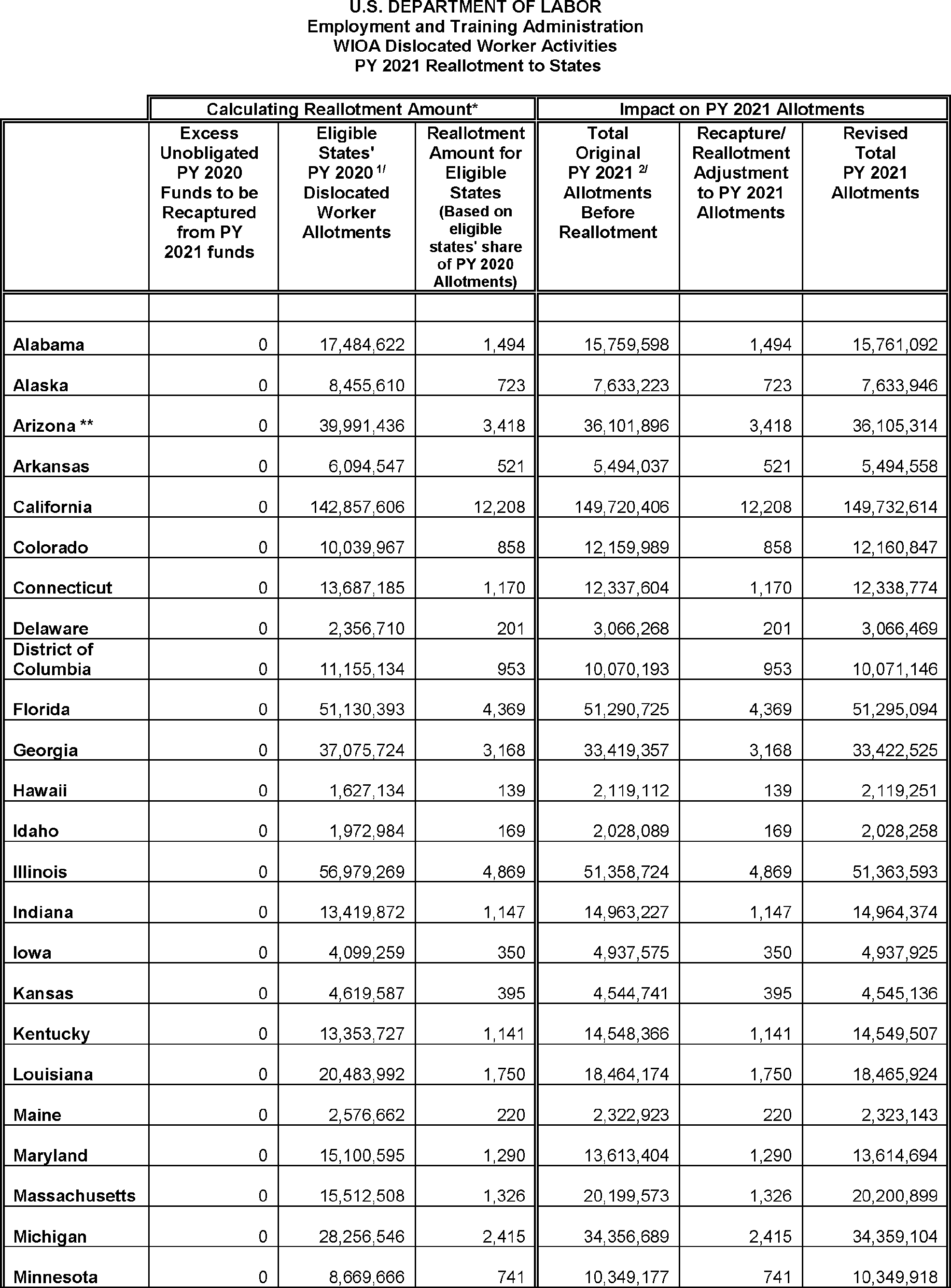 “Notice on Reallotment of Workforce Innovation Opportunity Act (WIOA) Title I Formula Allotted Funds for Dislocated Worker Activities for Program Year (PY) 2021,” thefederalregister.org (February 10, 2022), https://thefederalregister.org/documents/2022-02762/notice-on-reallotment-of-workforce-innovation-opportunity-act-wioa-title-i-formula-allotted-funds-for-dislocated-worker-.