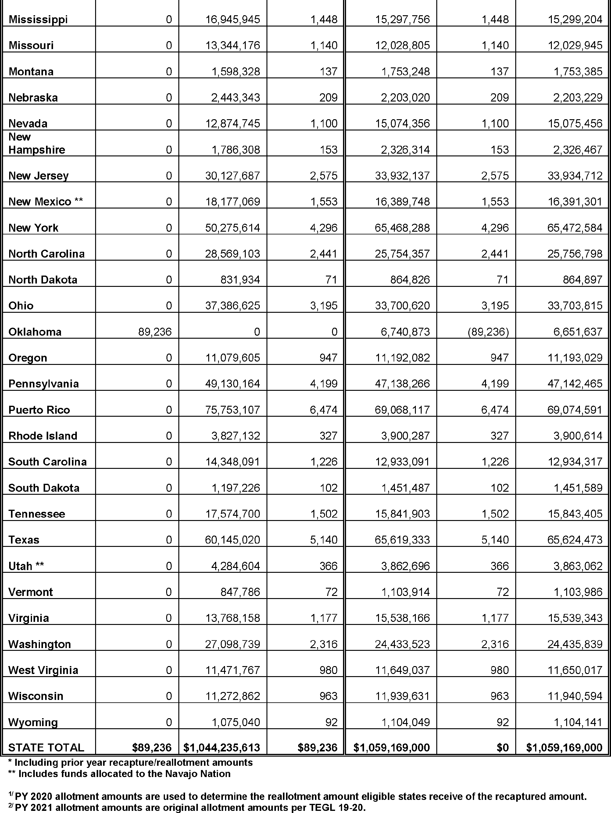 WIOA regulations at 20 CFR 683.135 describe the procedures the Secretary uses for recapture and reallotment of funds. ETA will not recapture any PY 2021 funds for the Adult and Youth programs because there are no states where PY 2020 unobligated funds exceed the statutory requirements of 20 percent of state allotted funds. However, for the Dislocated Worker program, Oklahoma had unobligated PY 2020 funds in excess of 20 percent of their allotments. Therefore, ETA will recapture a total of $89,236 from PY 2021 funding from Oklahoma and reallot those funds to the remaining eligible states, as required by WIOA Section 132(c).