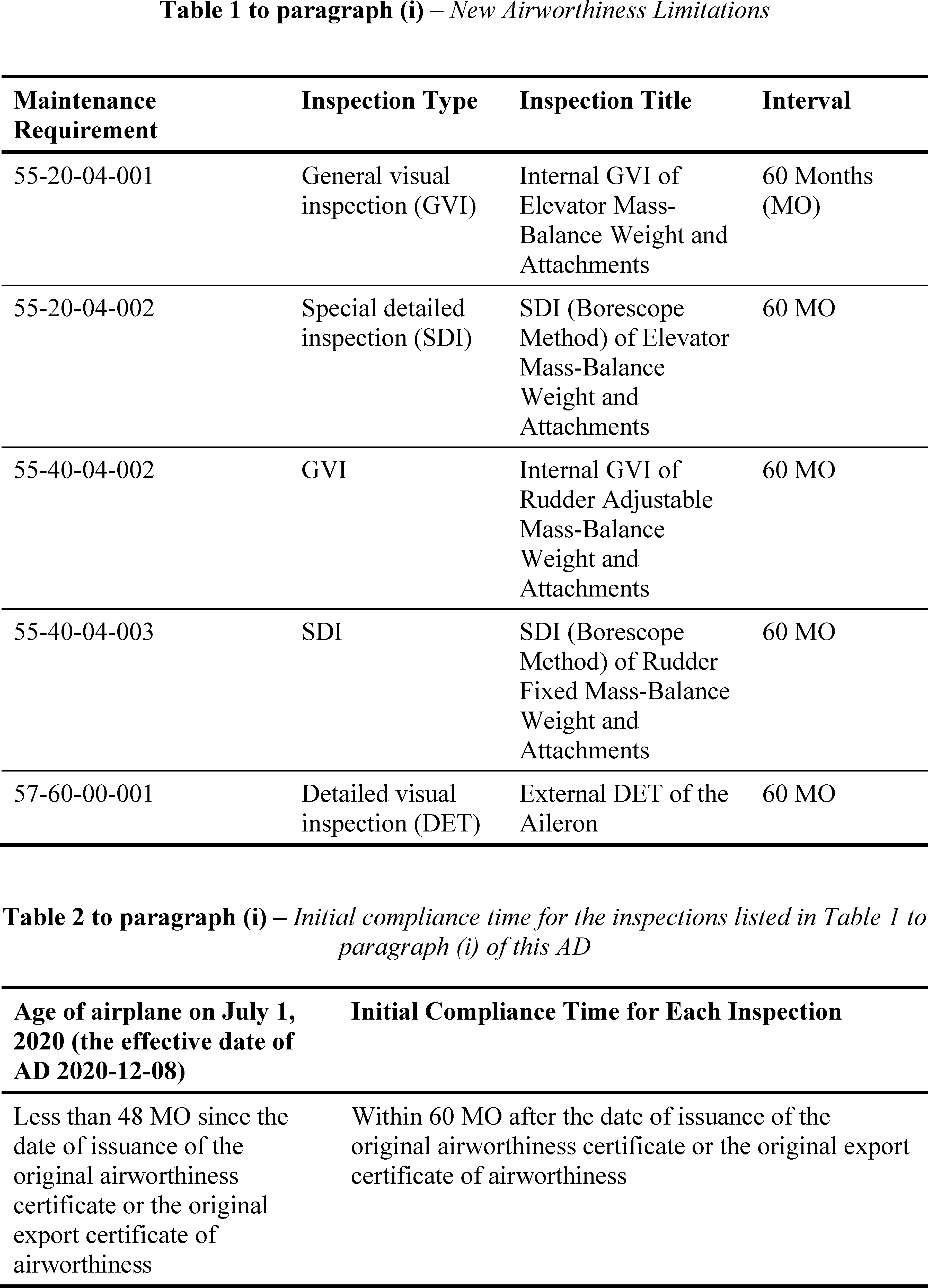This AD was prompted by reports of corrosion in the mass-balance weights of the flight control surfaces and a determination that new airworthiness limitations are necessary. The FAA is issuing this AD to address corrosion in the mass-balance weights of the flight control surfaces. The unsafe condition, if not addressed, could result in loss of mass or the detachment of the mass-balance weights, resulting in an unbalanced control surface, which could lead to flutter and loss of airplane control.