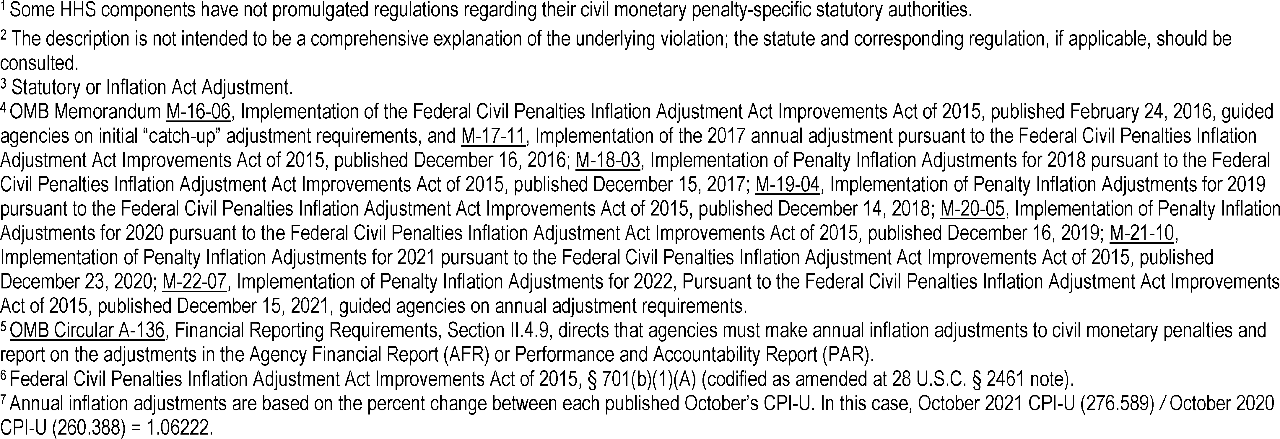 In addition to the inflation adjustments for 2022, this final rule updates the table in 45 CFR 102.3 to add references to new, applicable civil money penalty authorities that were established or implemented since the publication of the November 15, 2021 update and that are being updated in this rule. The rule also corrects several technical errors to regulatory citations in the table and updates descriptions for clarification and accuracy. The following technical errors were identified and are corrected in the table at 45 CFR 102.3: