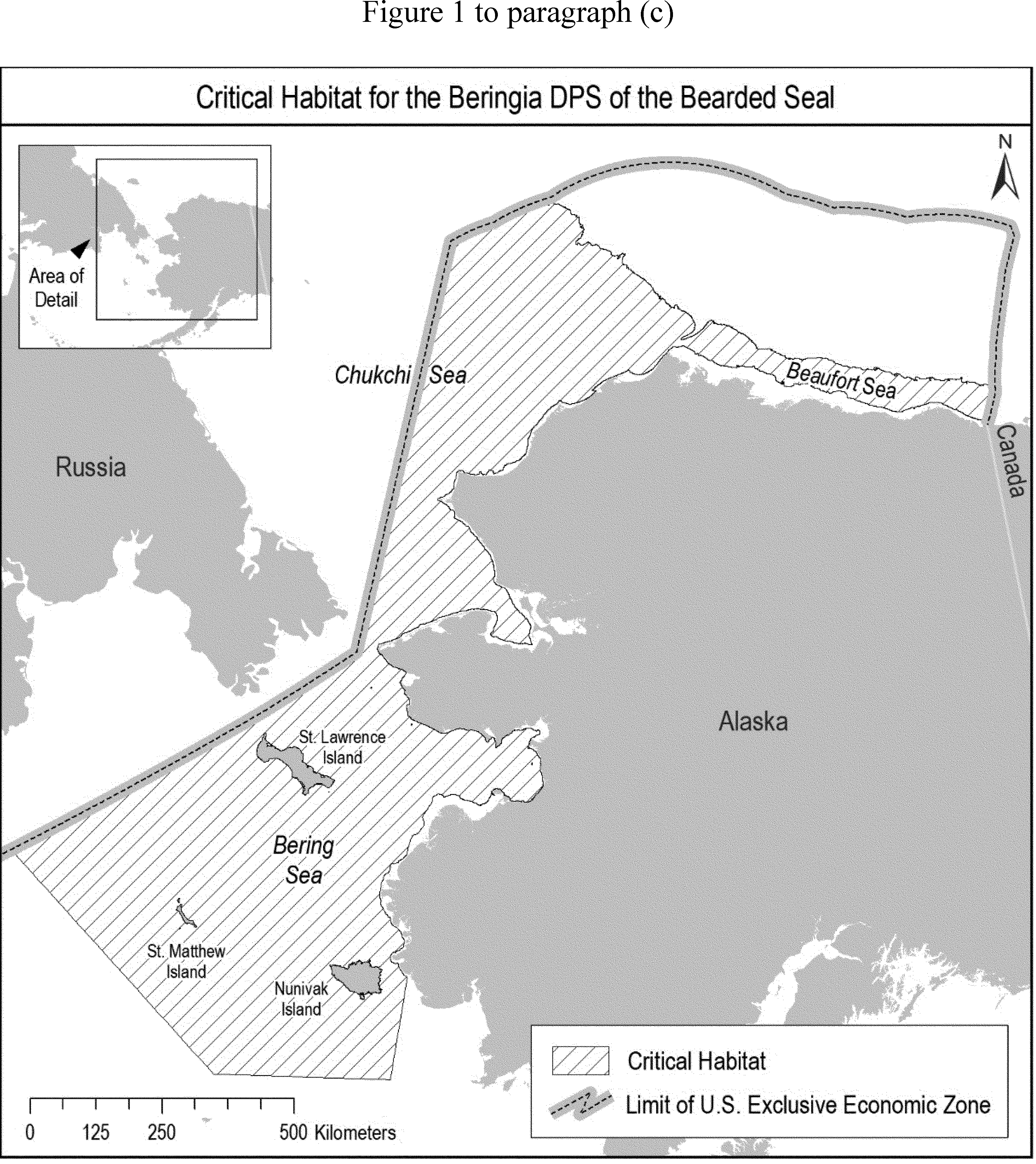 Critical habitat for the Beringia DPS includes marine waters within one specific area in the Bering, Chukchi, and Beaufort seas, extending from the shoreward boundary to an offshore limit with a maximum water depth of 200 m from the ocean surface within the U.S. Exclusive Economic Zone (EEZ). The shoreward boundary follows the 20-m isobath (relative to MLLW) westward from the eastern limit of the U.S. EEZ in the Beaufort Sea and continuing into the northeastern Chukchi Sea to its intersection with latitude 70°36′ N south of Wainwright; then follows the 10-m isobath (relative to MLLW) to its intersection with latitude 65°35′ N near Cape Prince of Wales; then follows the 5-m isobath (relative to MLLW) to its intersection with longitude 164°46′ W near the mouth of the Kolovinerak River in the Bering Sea, except at Port Clarence Bay where the shoreward boundary is defined as a continuous line across the entrance. The eastern boundary in the Beaufort Sea follows the eastern limit of the U.S. EEZ beginning at the nearshore boundary defined by the 20-m isobath (relative to MLLW), extends offshore to the 200-m isobath, and then follows this isobath generally westward and northwestward to its intersection with the seaward limit of the U.S EEZ in the Chukchi Sea. The boundary then follows the limit of the U.S. EEZ southwestward and south to the intersection of the southern boundary of the critical habitat in the Bering Sea at 60°32′26″ N/179°9′53″ W. The southern boundary extends southeastward from this intersection point to 57°58′ N/170°25′ W, then eastward to 58°29′ N/164°46′ W, then follows longitude 164°46′ W to its intersection with the nearshore boundary defined by the 5-m isobath (relative to MLLW) near the mouth of the Kolovinerak River. This includes waters off the coasts of the Bethel, Kusilvak, and Nome Census Areas, and the Northwest Arctic and North Slope Boroughs, Alaska. Critical habitat does not include permanent manmade structures such as boat ramps, docks, and pilings that were in existence within the legal boundaries as of May 2, 2022.