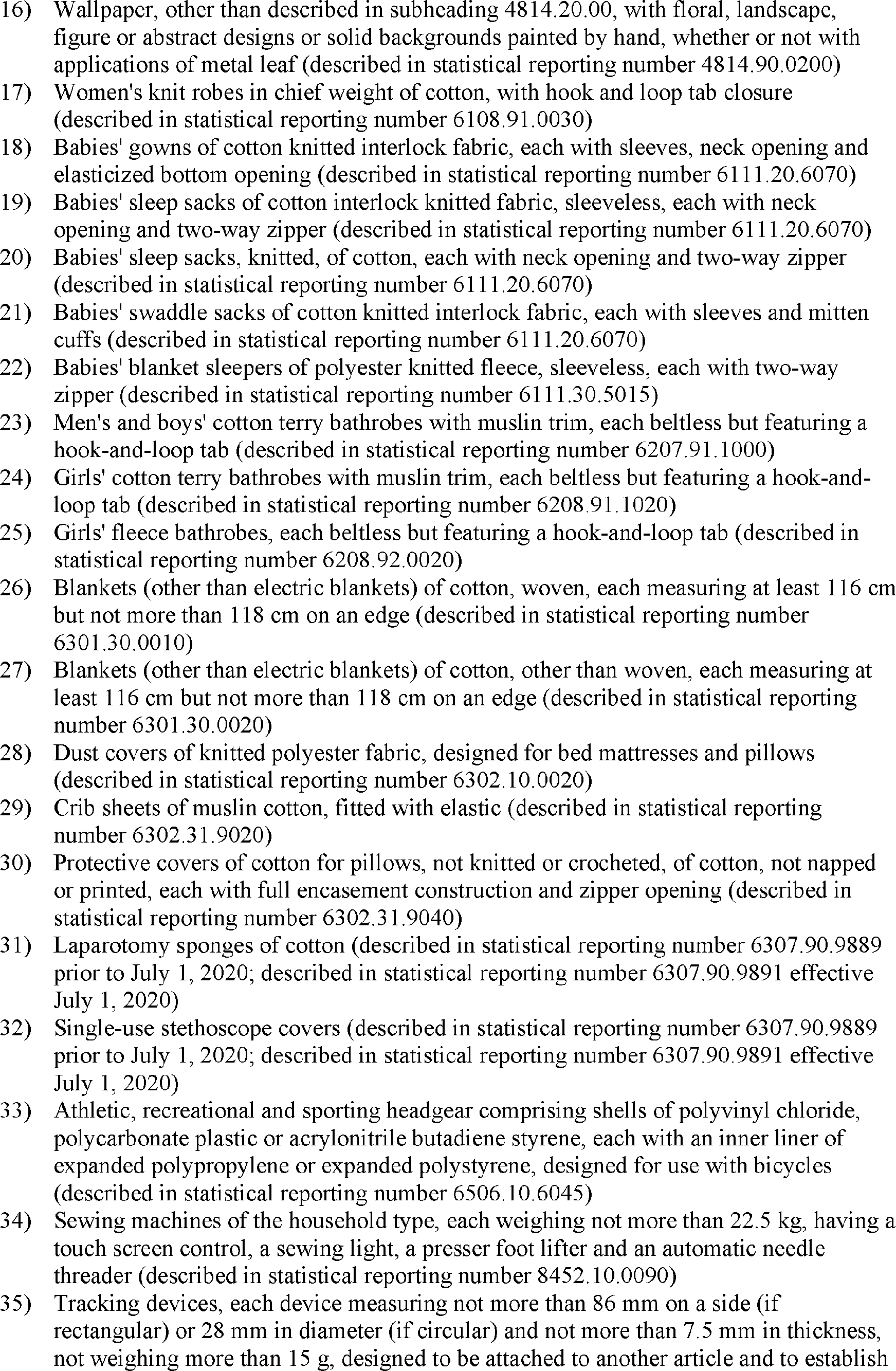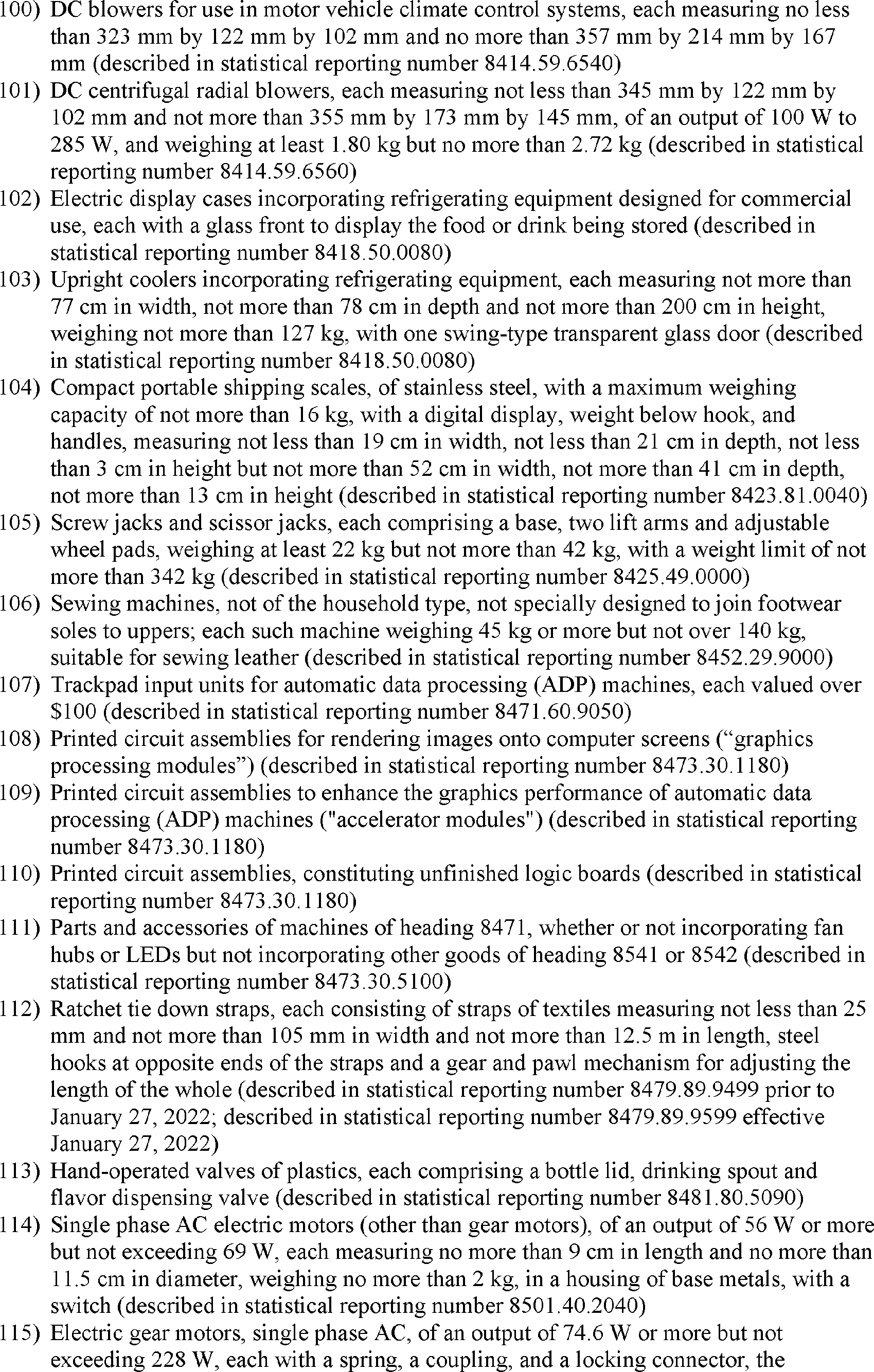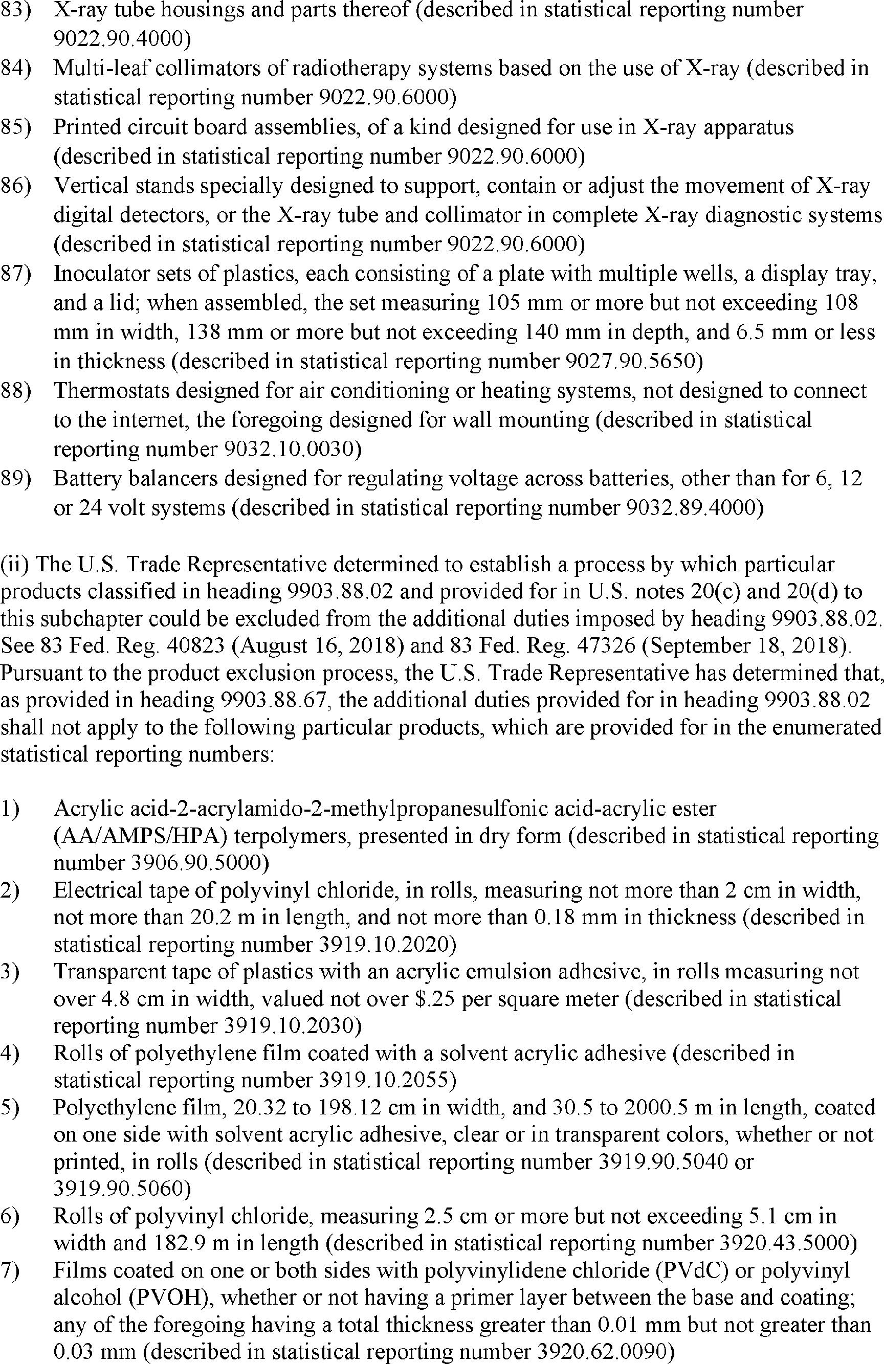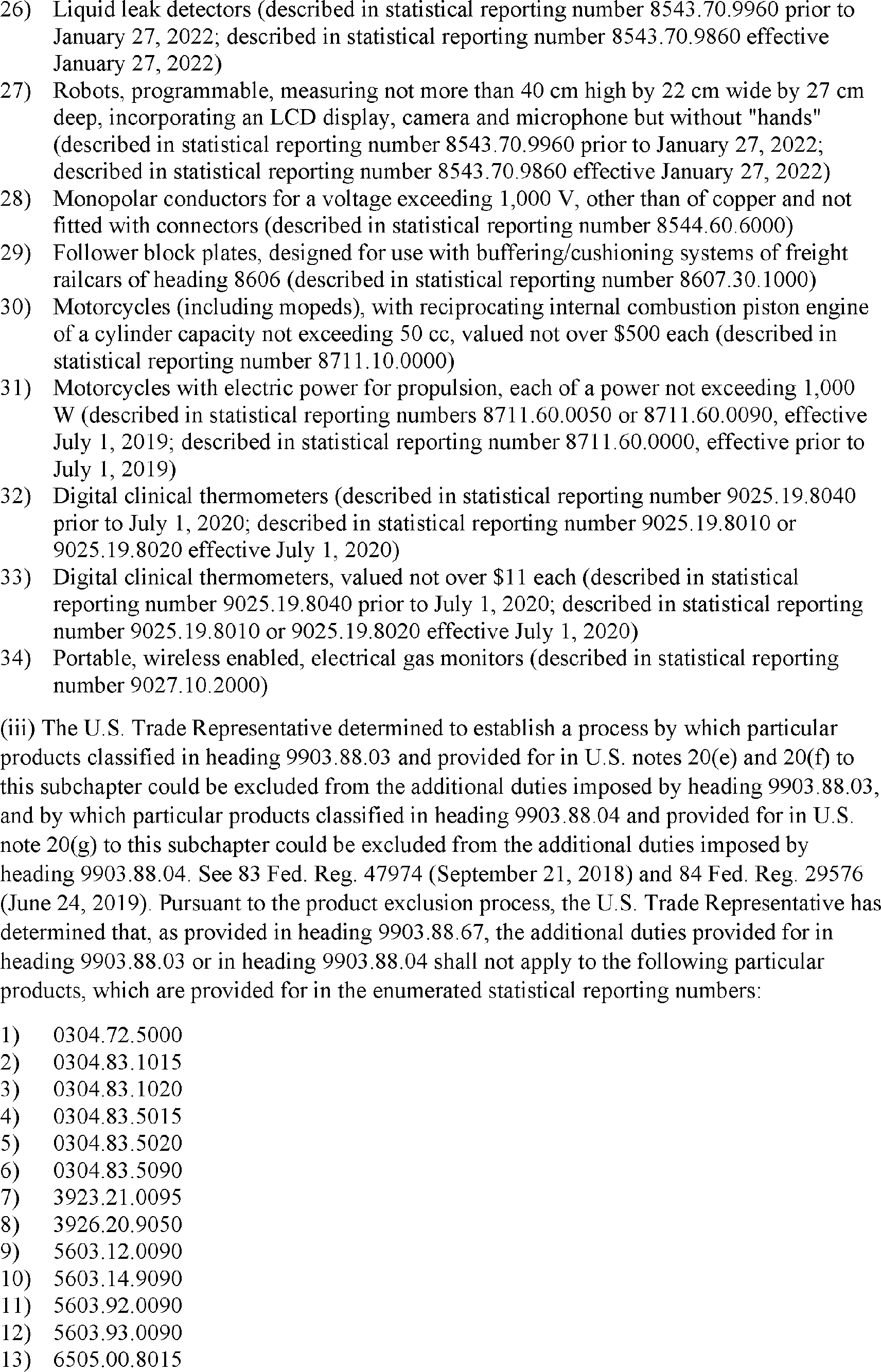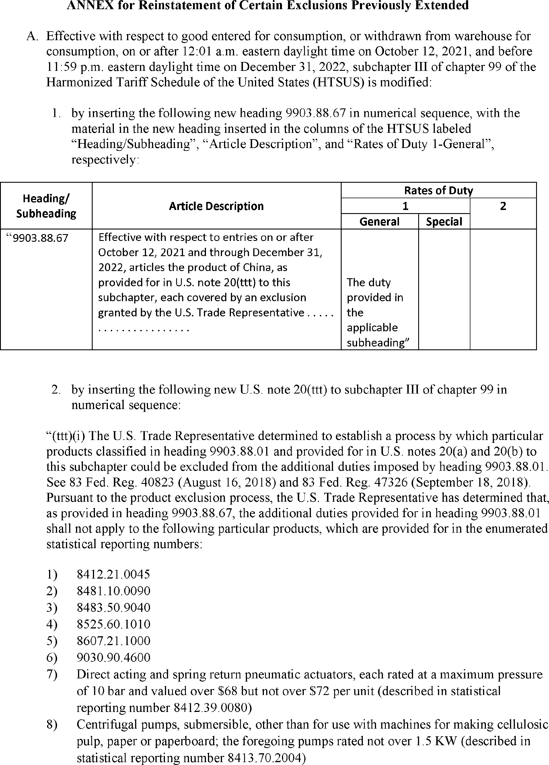 notices, the U.S. Trade Representative modified the action in the Section 301 investigation of China's acts, policies, and practices related to technology transfer, intellectual property, and innovation by excluding certain products from additional duties. The U.S. Trade Representative subsequently extended 549 of these exclusions. Following public notice and comment, the U.S. Trade Representative has determined to reinstate certain previously extended exclusions through December 31, 2022, as specified in the Annex to this notice.