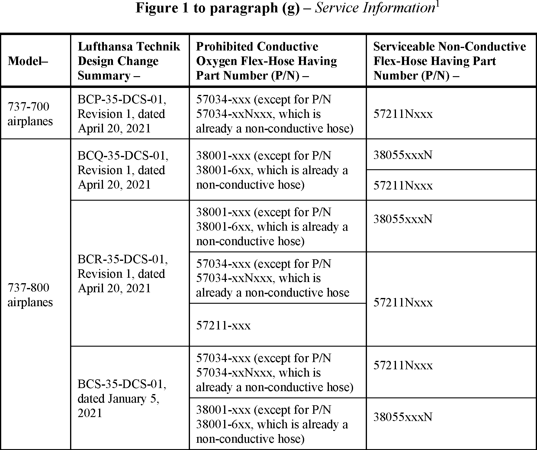 Within 48 months after the effective date of this AD: Replace each conductive oxygen flex-hose installed on LP gaseous passenger oxygen systems with a serviceable non-conductive oxygen flex-hose, in accordance with the Accomplishment Instructions of the applicable Lufthansa Technik Design Change Summary (TS-145 Installation Document Number) corresponding to the affected part numbers specified in figure 1 to paragraph (g) of this AD.