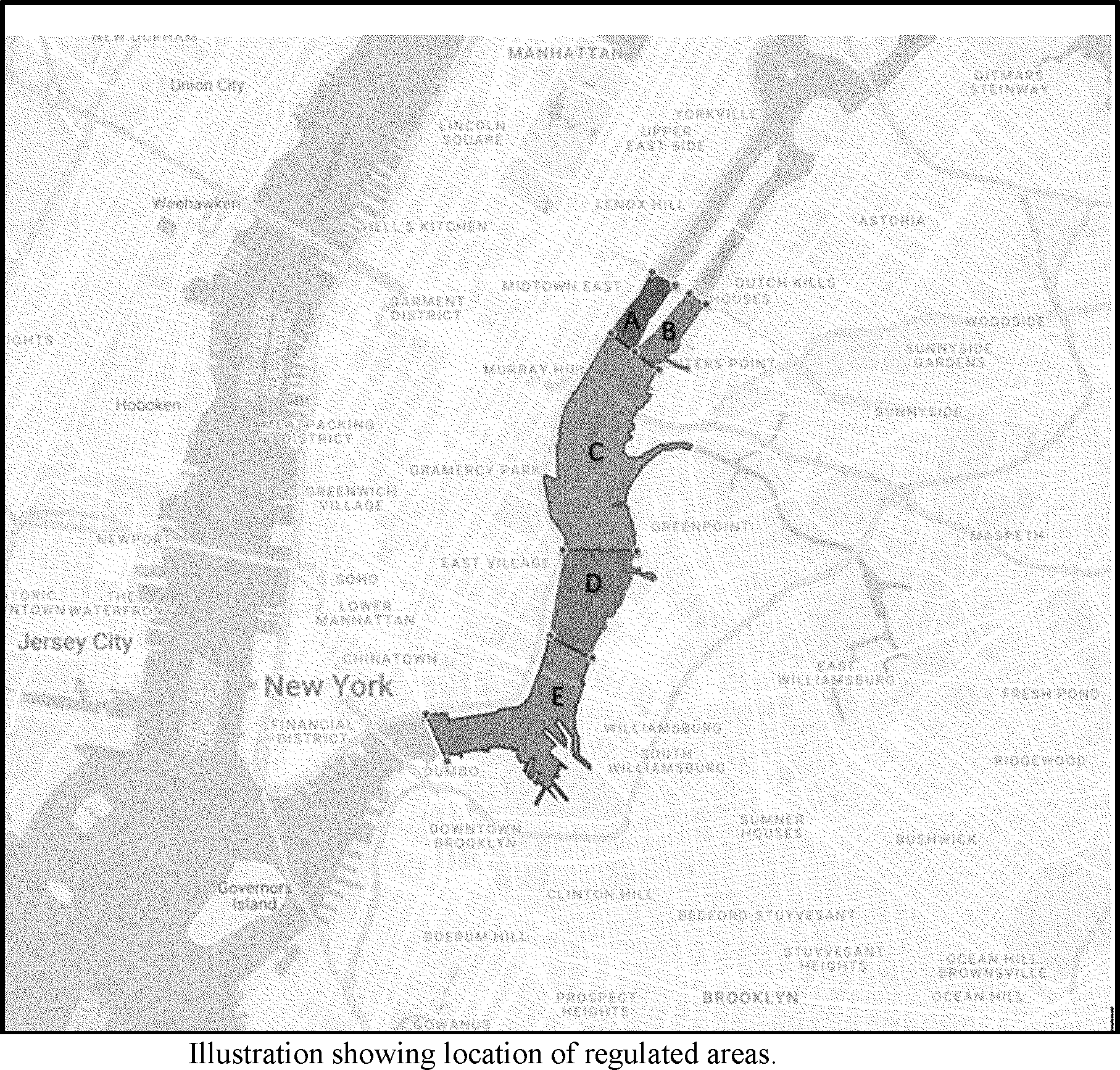 All navigable waters of the East River encompassed by a line connecting the following points beginning at 40°43′06″ N, 073°58′25″ W, then along the shore to the Manhattan Bridge at 40°42′34.74″ N, 73°59′30.65″ W, across the East River to Brooklyn at 40°42′15.87″ N, 73°59′19.60″ W, then along the Brooklyn side of the East River to 40°42′57.34″ N, 73°58′3.03″ W, and then back to the point of origin. These coordinates are based on (NAD 83).