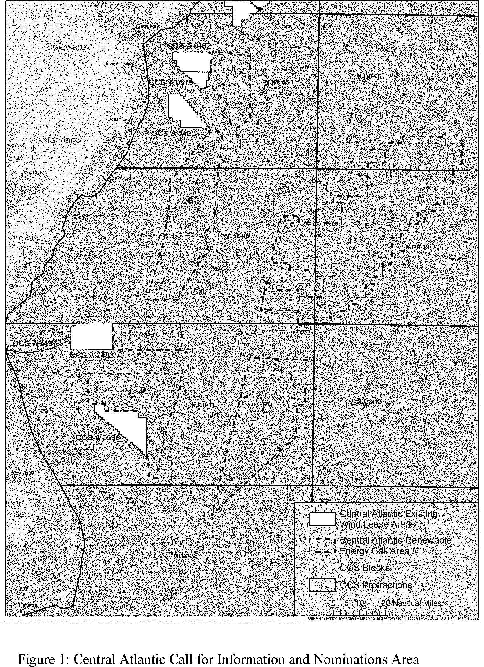 The Call Area comprises six distinct areas located seaward of the Submerged Lands Act boundary on the OCS offshore the U.S. central Atlantic coast, bounded on the north by areas within the Salisbury (NJ18-05) Official Protraction Diagram east of existing commercial leasehold OCS-A 0482 and northeast of existing commercial leasehold OCS-A 0490, bounded on the east by areas within Wilmington Canyon (NJ18-06) and Currituck Sound (NJ18-11) Official Protraction Diagrams, bounded on the south by areas northeast and southeast of existing commercial leasehold OCS-A 0508 within the Currituck (NJ18-11) and Manteo (NI18-02) Official Protraction Diagrams. The area for potential wind energy leasing consists of approximately 3.9 million acres (figure 1).