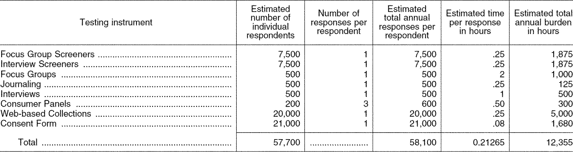 1.006932 (One for focus group screeners, interview screeners, focus groups, journaling, interviews, web-based collections and consent forms. Three for consumer panels.).