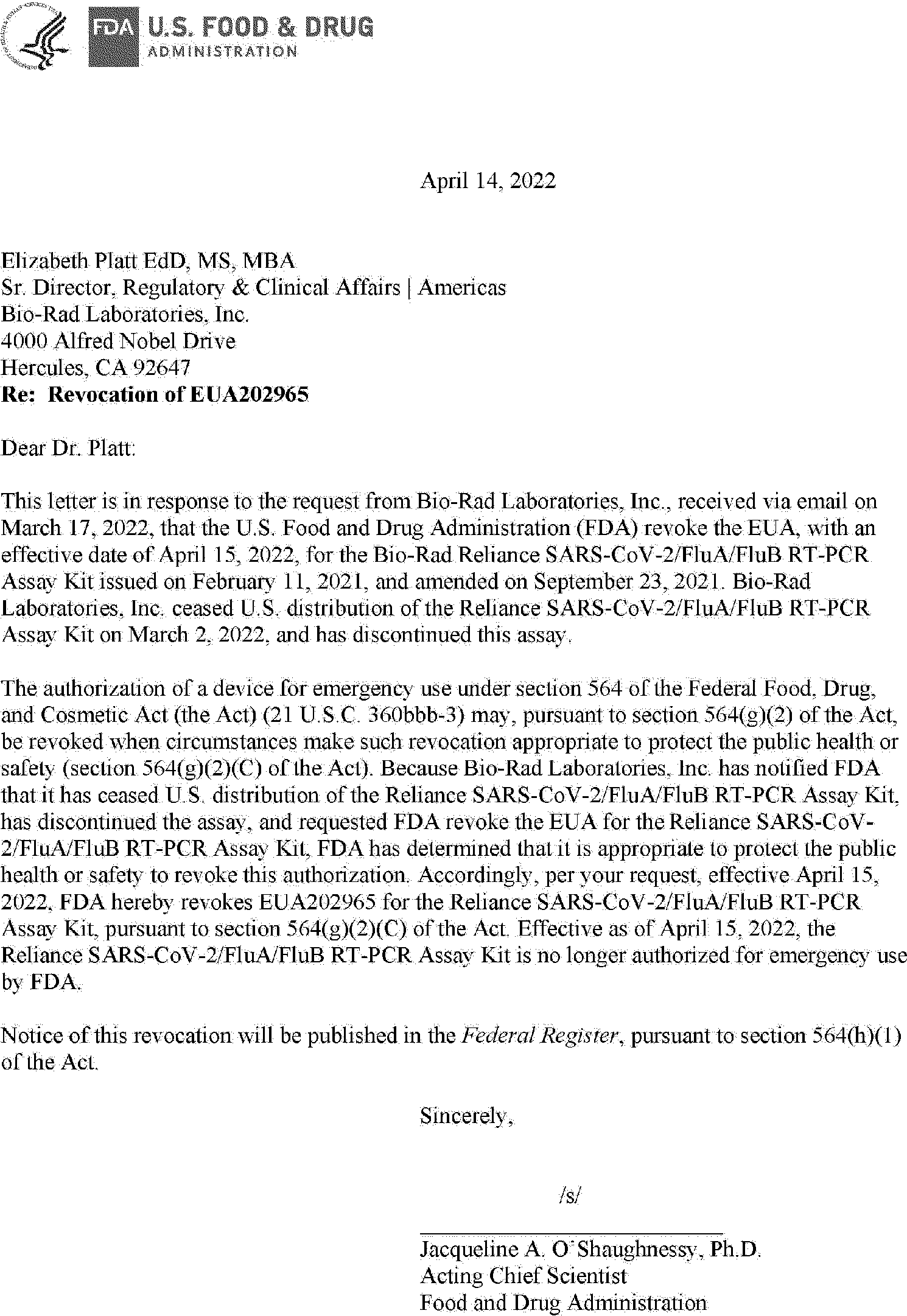 In a request received by FDA on March 17, 2022, Bio-Rad Laboratories, Inc., requested revocation of, and on April 15, 2022, FDA revoked, the Authorization for the Bio-Rad Reliance SARS-CoV-2/FluA/FluB RT-PCR Assay Kit. Because Bio-Rad Laboratories, Inc. notified FDA that it has ceased U.S. distribution of the Reliance SARS-CoV-2/FluA/FluB RT-PCR Assay Kit, has discontinued the assay, and requested FDA revoke the EUA for the Reliance SARS-CoV-2/FluA/FluB RT-PCR Assay Kit, FDA determined that it is appropriate to protect the public health or safety to revoke this Authorization.