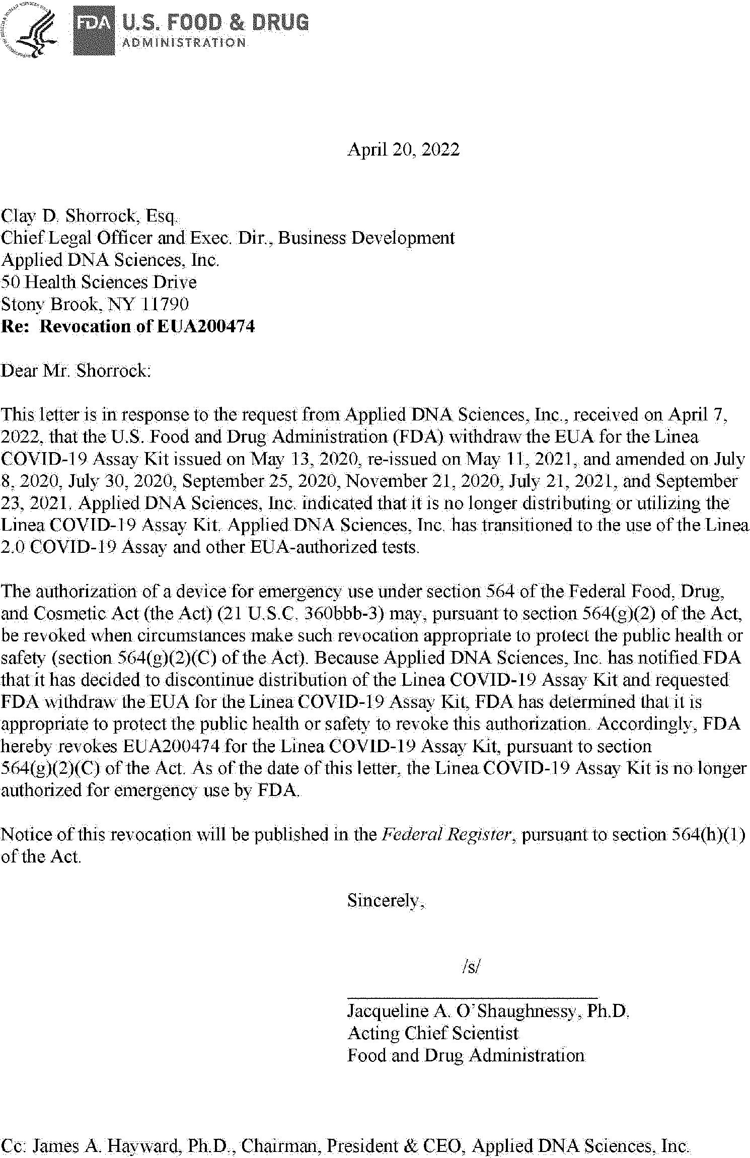 In a request received by FDA on April 7, 2022, Applied DNA Sciences, Inc., requested revocation of, and on April 20, 2022, FDA revoked, the Authorization for the Linea COVID-19 Assay Kit. Because Applied DNA Sciences, Inc. notified FDA that it has decided to discontinue distribution of the Linea COVID-19 Assay Kit and requested FDA withdraw the EUA for the Linea COVID-19 Assay Kit, FDA determined that it is appropriate to protect the public health or safety to revoke this Authorization.