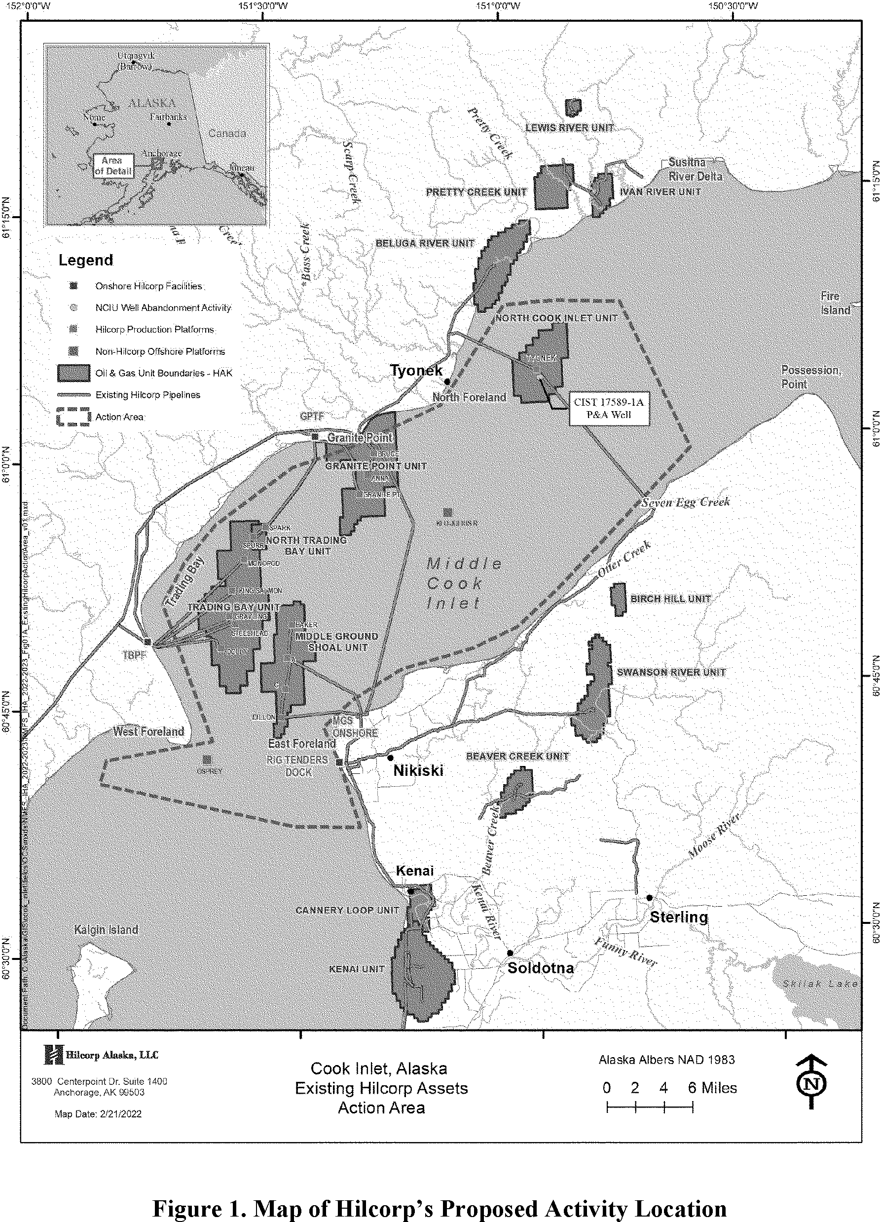 Hilcorp's proposed activities would take place in Cook Inlet, Alaska. For the purposes of this project, lower Cook Inlet refers to waters south of the East and West Forelands; middle Cook Inlet refers to waters north of the East and West Forelands and south of Threemile River on the west and Point Possession on the east; Trading Bay refers to waters from approximately the Granite Point Tank Farm on the north to the West Foreland on the south; and upper Cook Inlet refers to waters north and east of Beluga River on the west and Point Possession on the east. A map of the specific area in which Hilcorp plans to operate is provided in Figure 1 below.