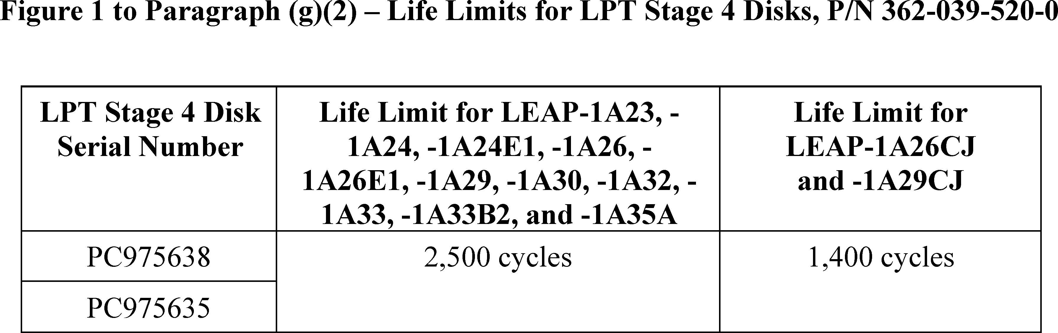 (2) Before the LPT stage 4 disk, part number (P/N) 362-039-520-0, with serial numbers identified in Figure 1 to paragraph (g)(2) of this AD (Figure 1) accumulates the cycles in Figure 1, or within 100 cycles after the effective date of this AD, whichever occurs later, remove the affected LPT stage 4 disk from service and replace with a part eligible for installation.
